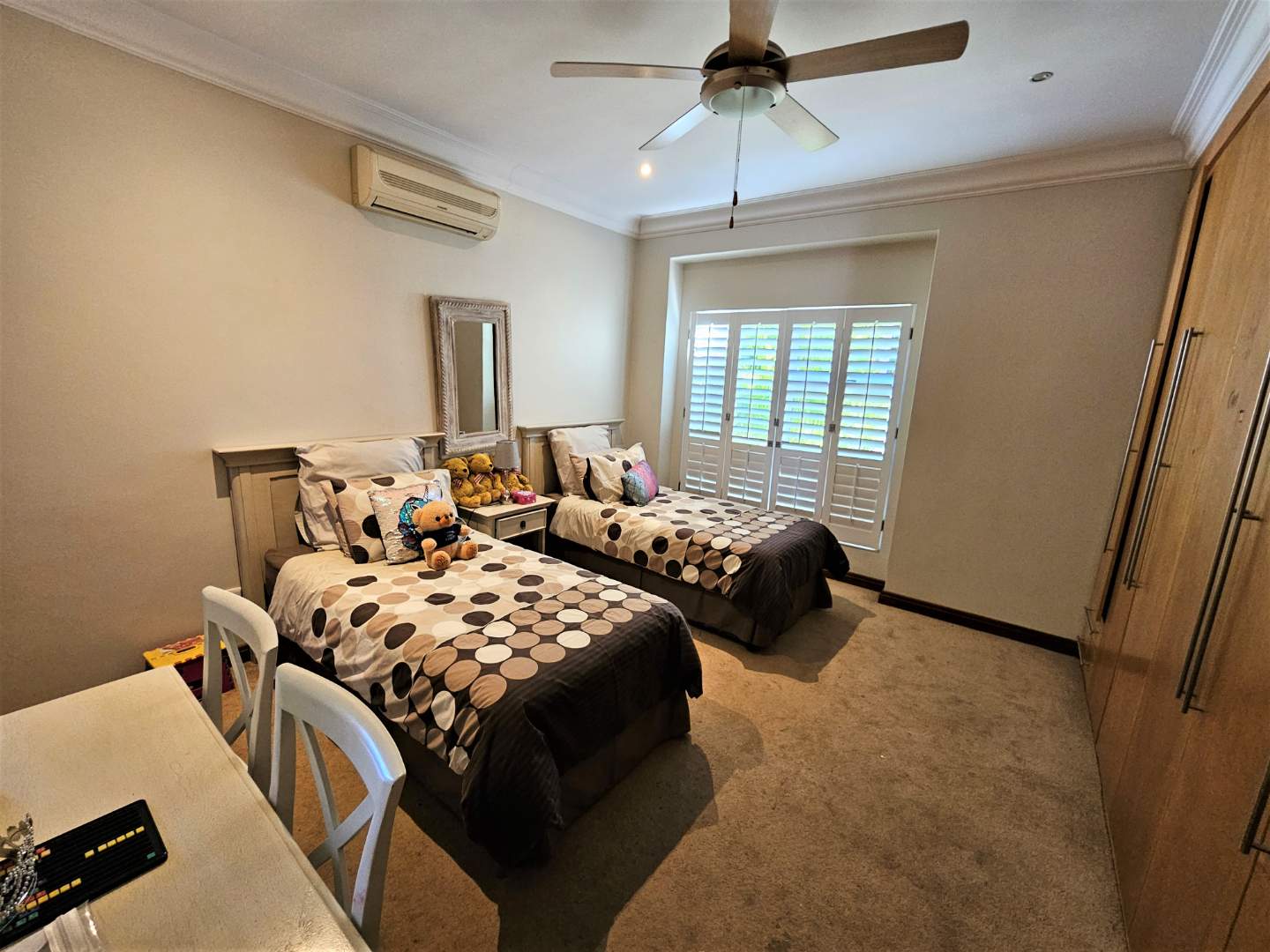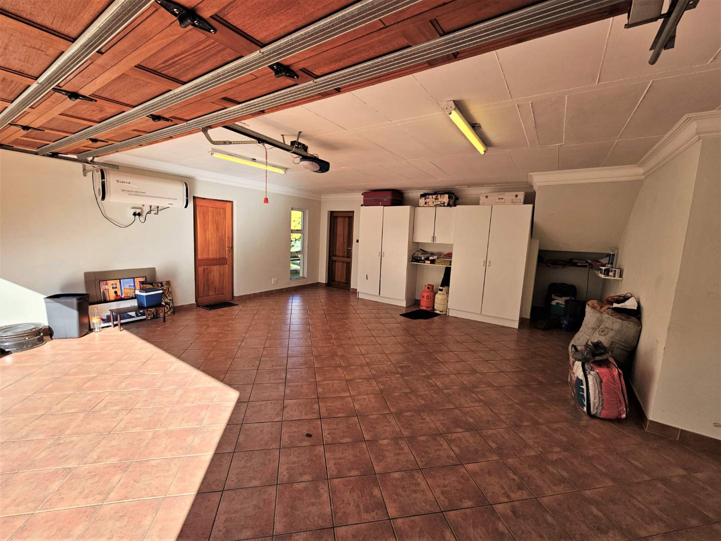 Extra spacious double garage that can fit 3 cars and build in cupboards and storage space.