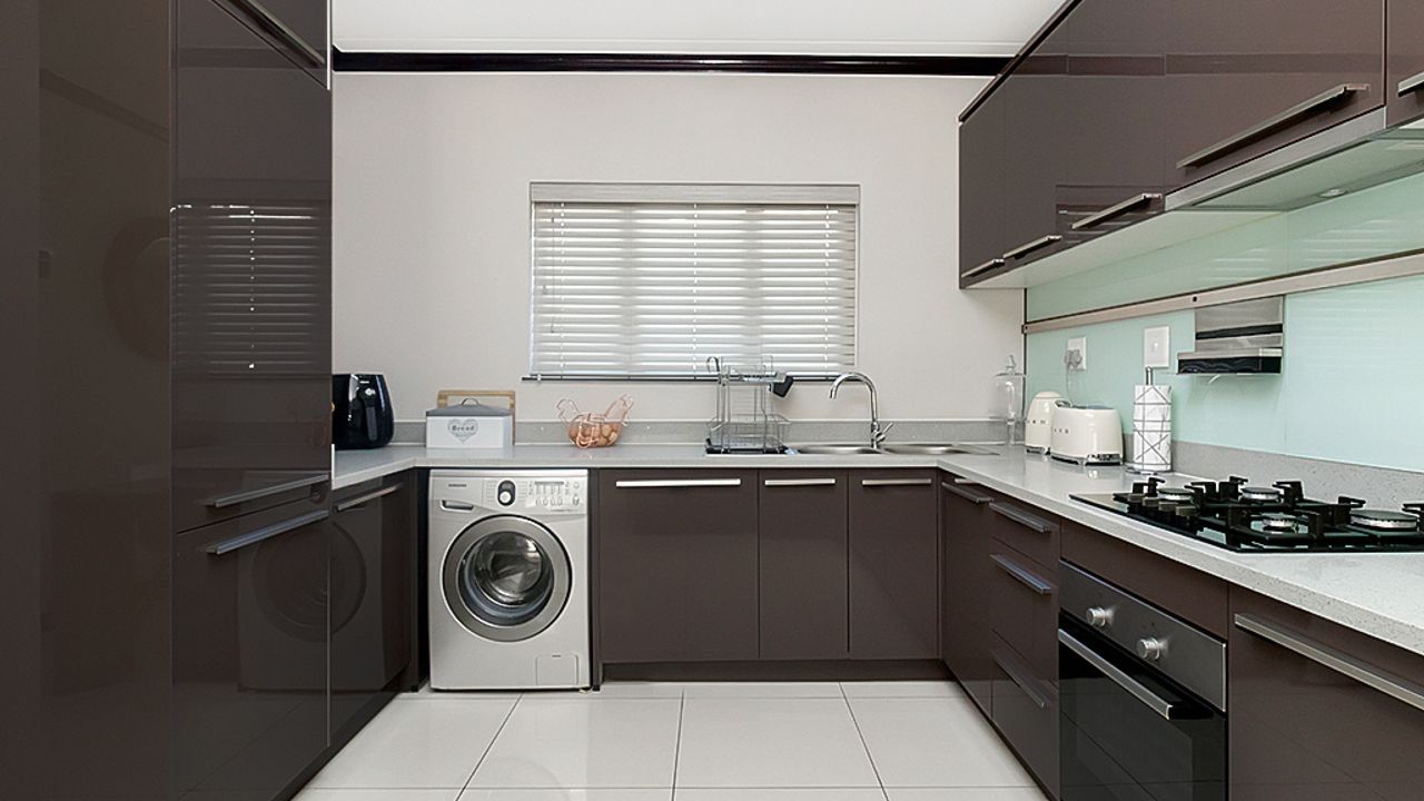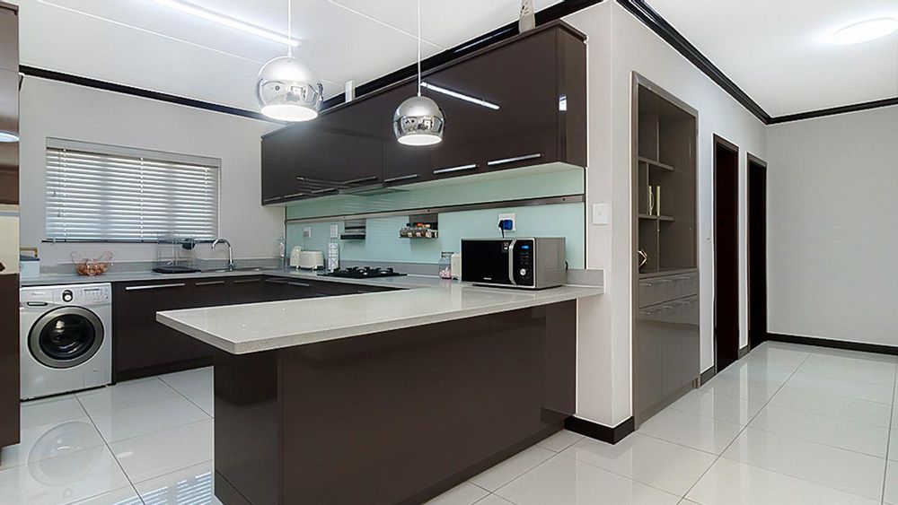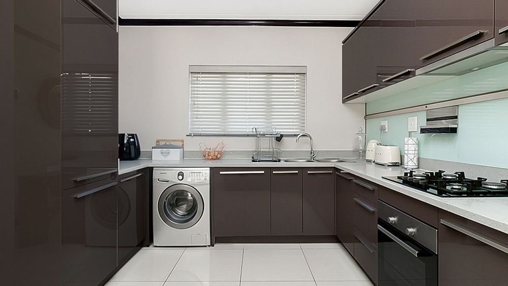 -Spacious modern kitchen, inclusive of a gas stove, fridge and dishwasher machine.