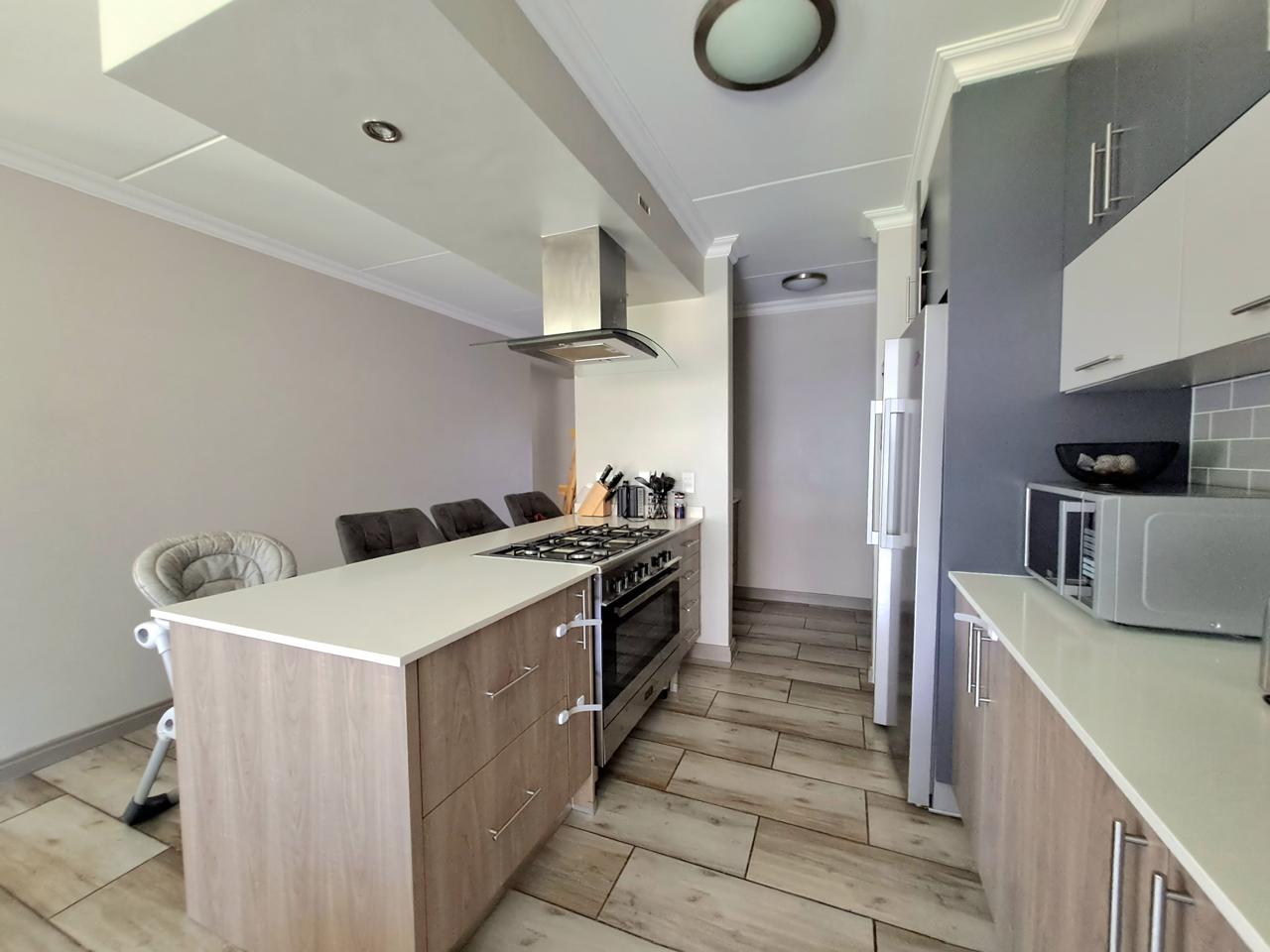 The large kitchen boasts plenty of cupboard space, a gas stove, space for a double fridge and accommodates two under-counter appliances.