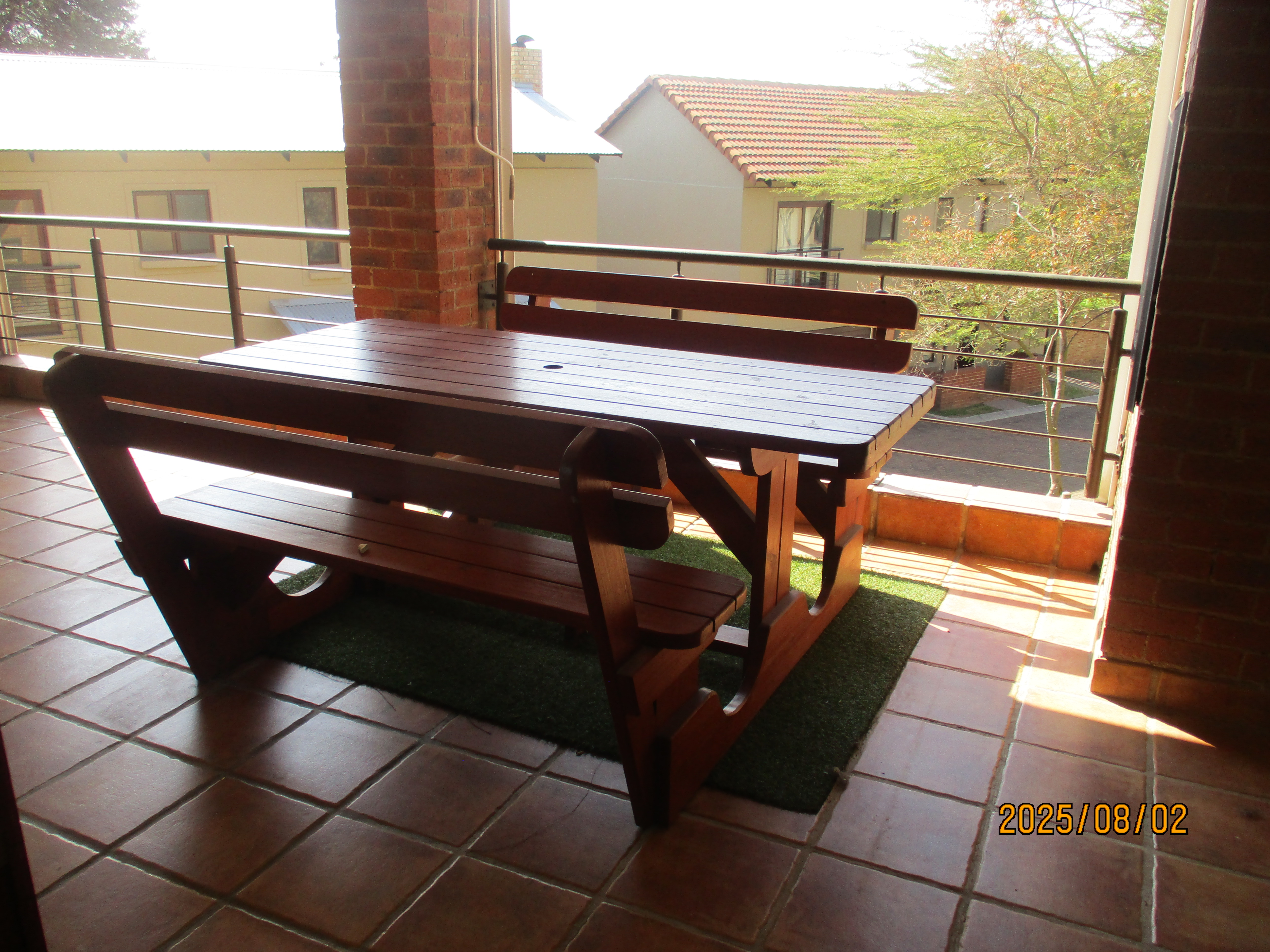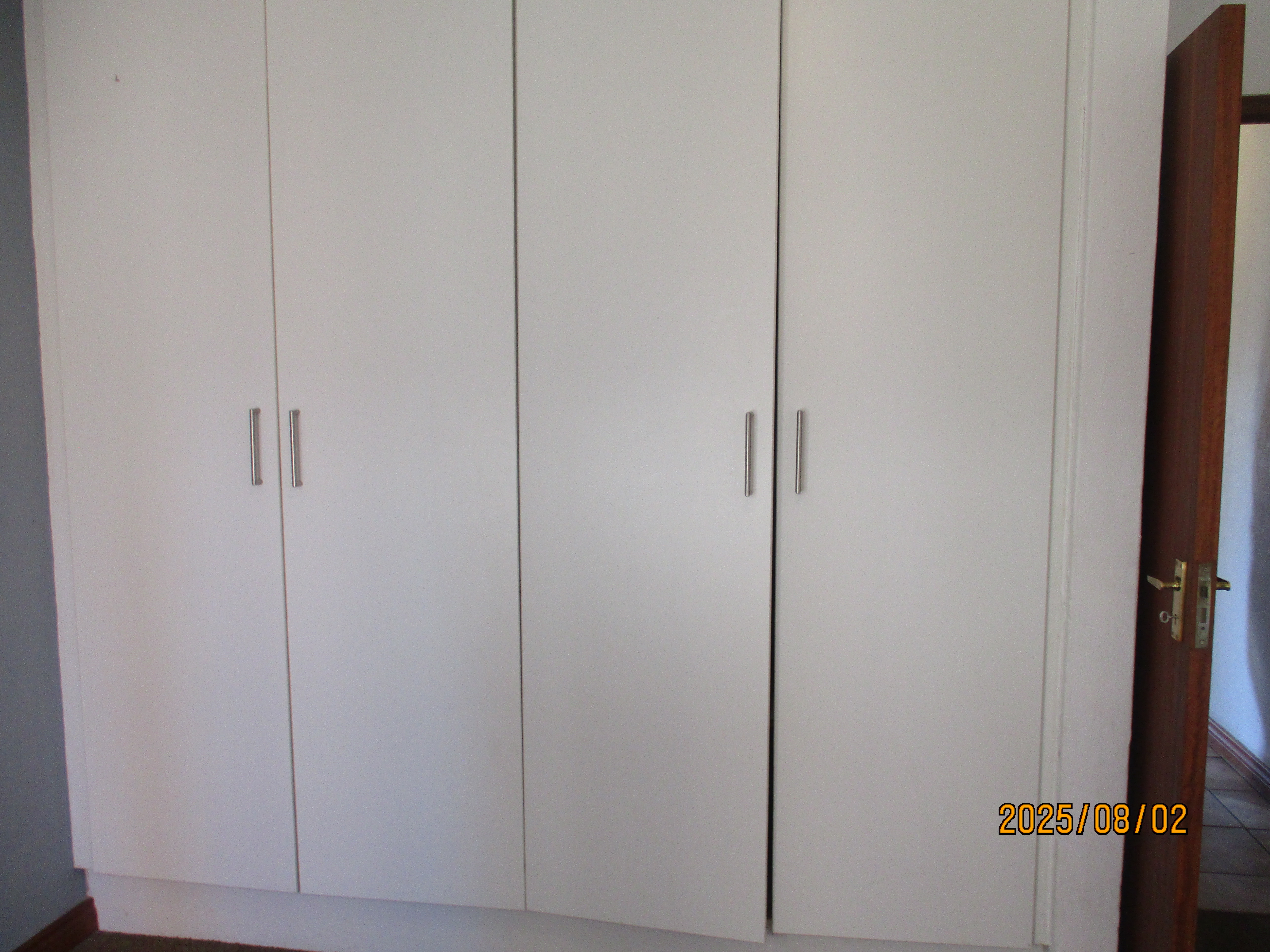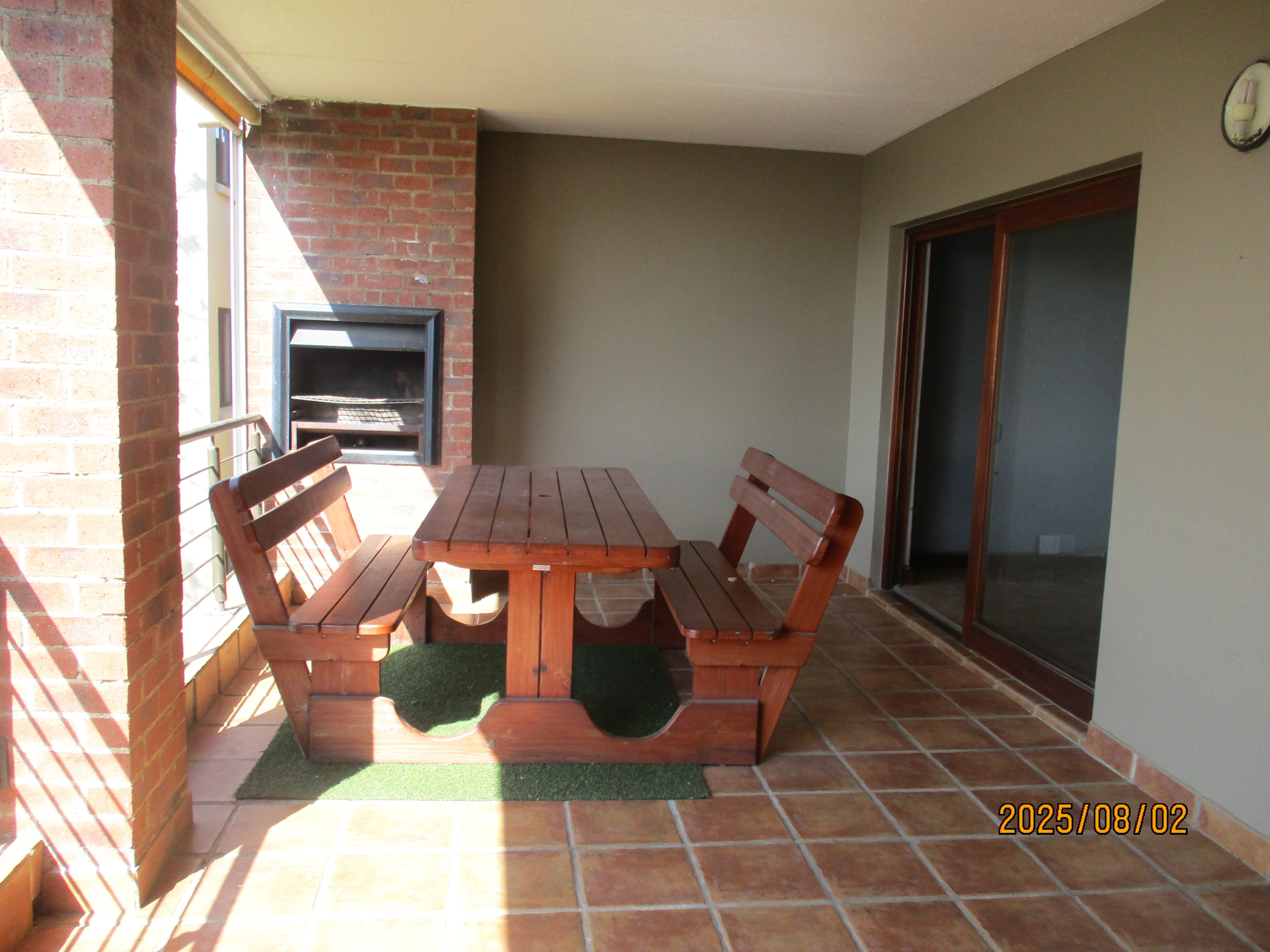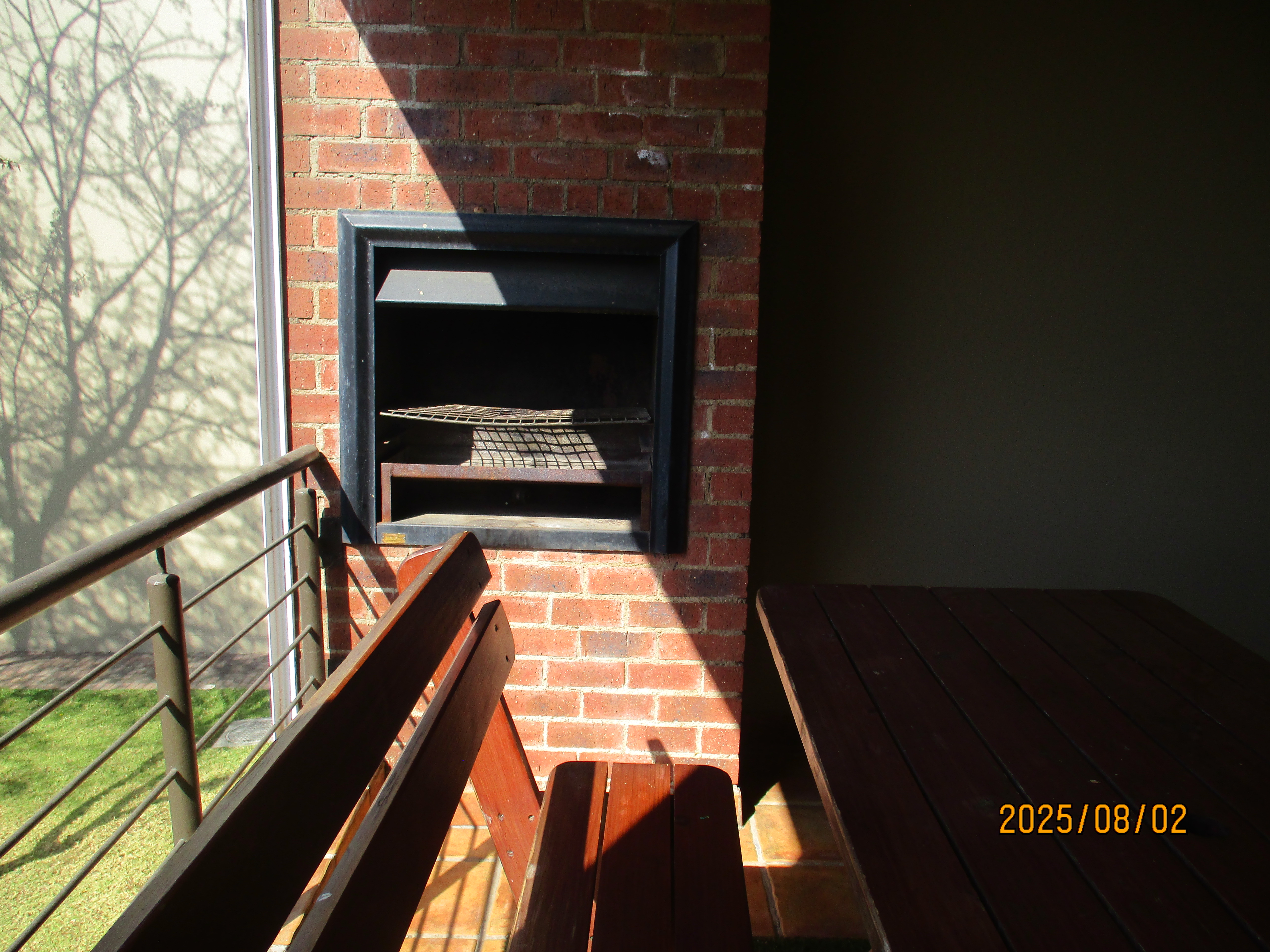 The lounge opens onto a large balcony with a built-in braai area, perfect for relaxing in the sun or shade. The balcony is covered with a stylish pergola, offering a blend of shelter and openness ideal for outdoor living. The two bedrooms has a full bathroom in the middle.The bedrooms are carpeted and has built in cupboards