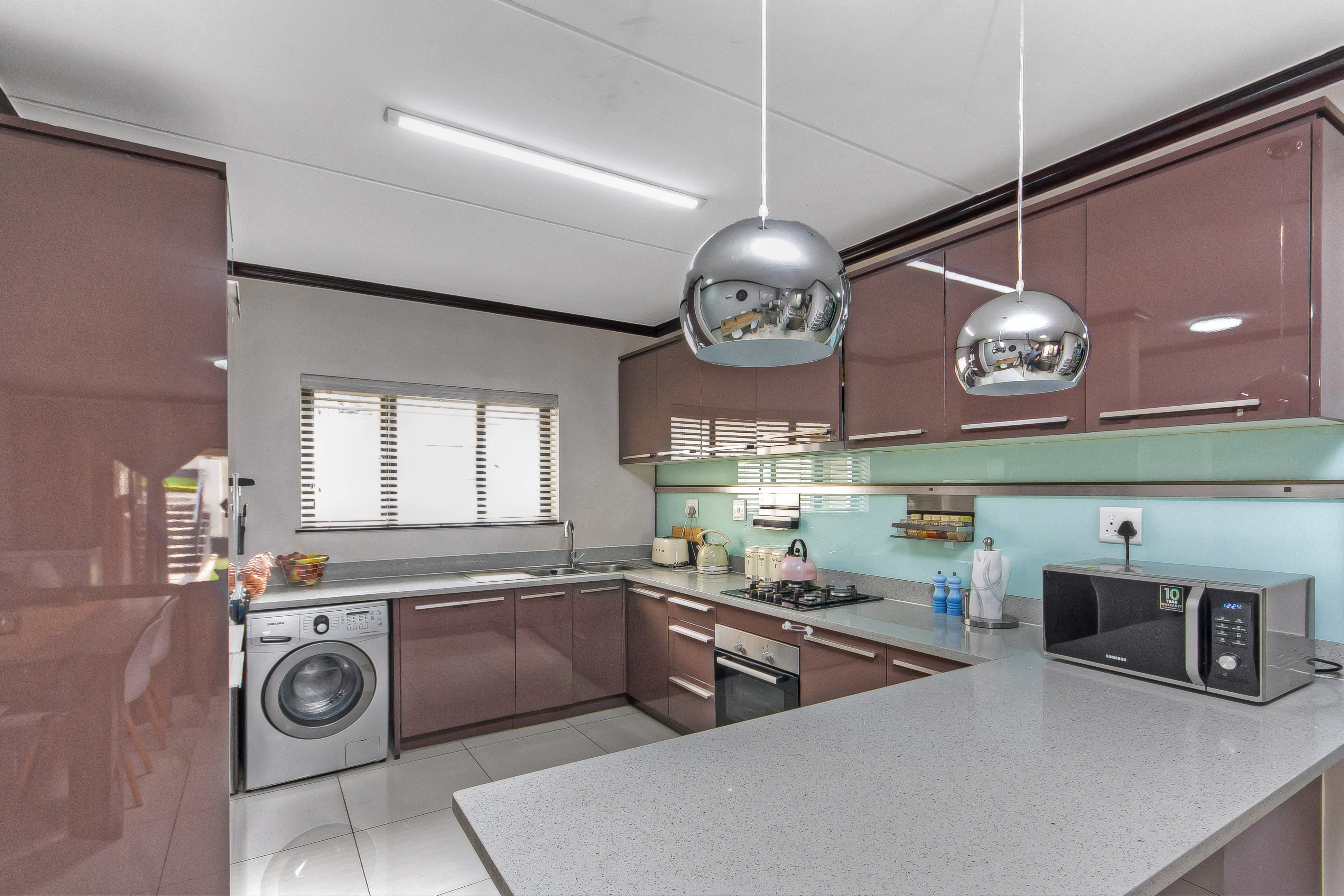 The heart of the home, the kitchen, is finished with granite tops and high gloss cabinetry, it has space for 2 under counter appliance and features a gas stove.