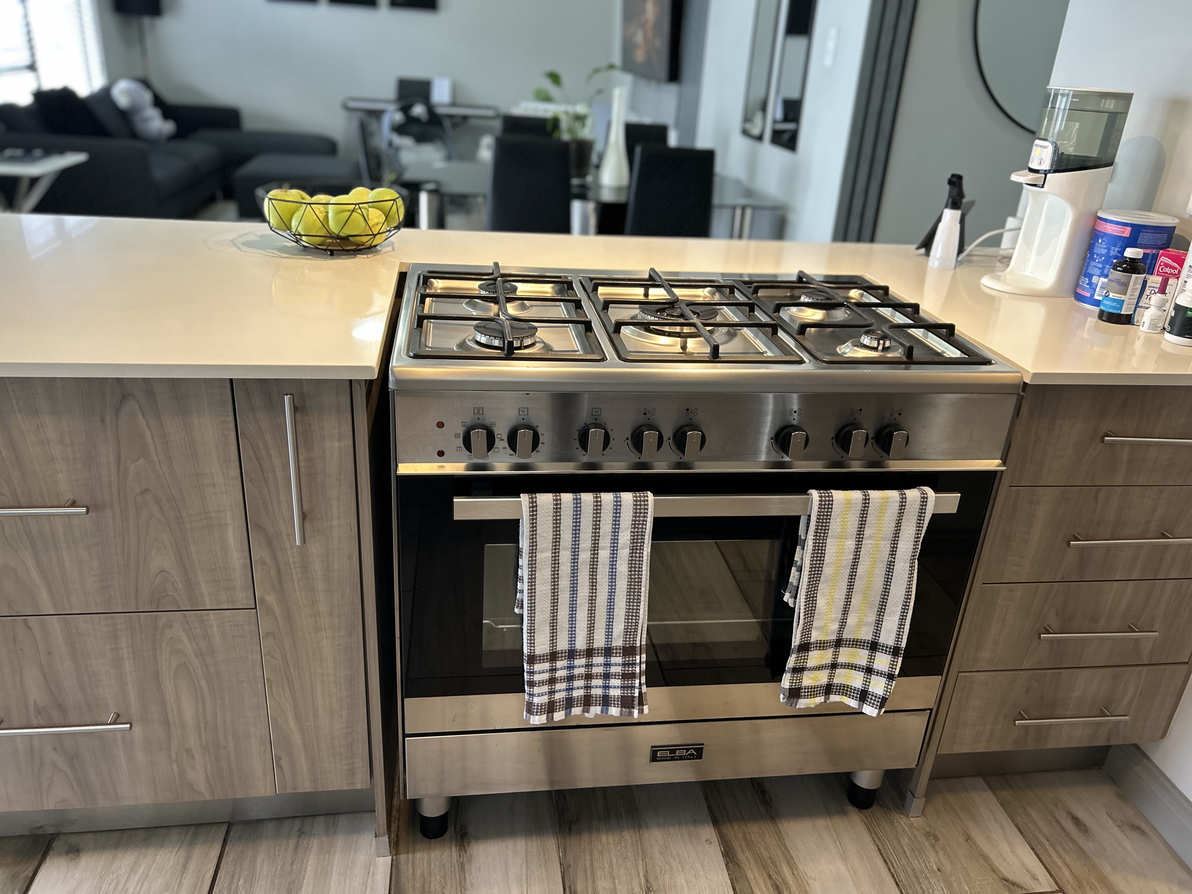 Open plan lounge dining area and kitchen. The kitchen has a gas stove and scullery with space for 3 appliances.