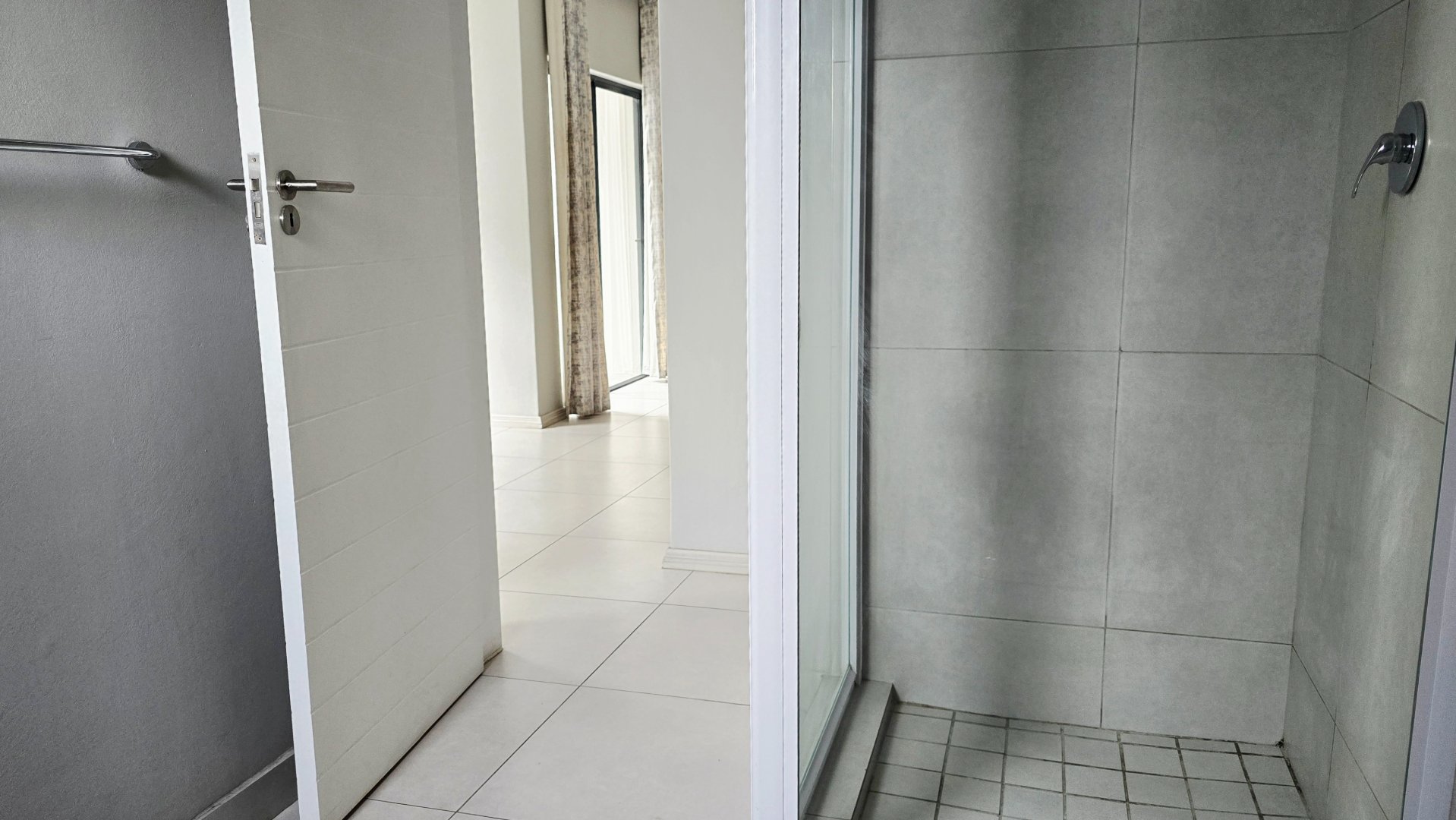 The bedroom is fully tiled and fitted with built in cupboards, providing ample storage space. The bathroom features a clean and modern design with a spacious shower.