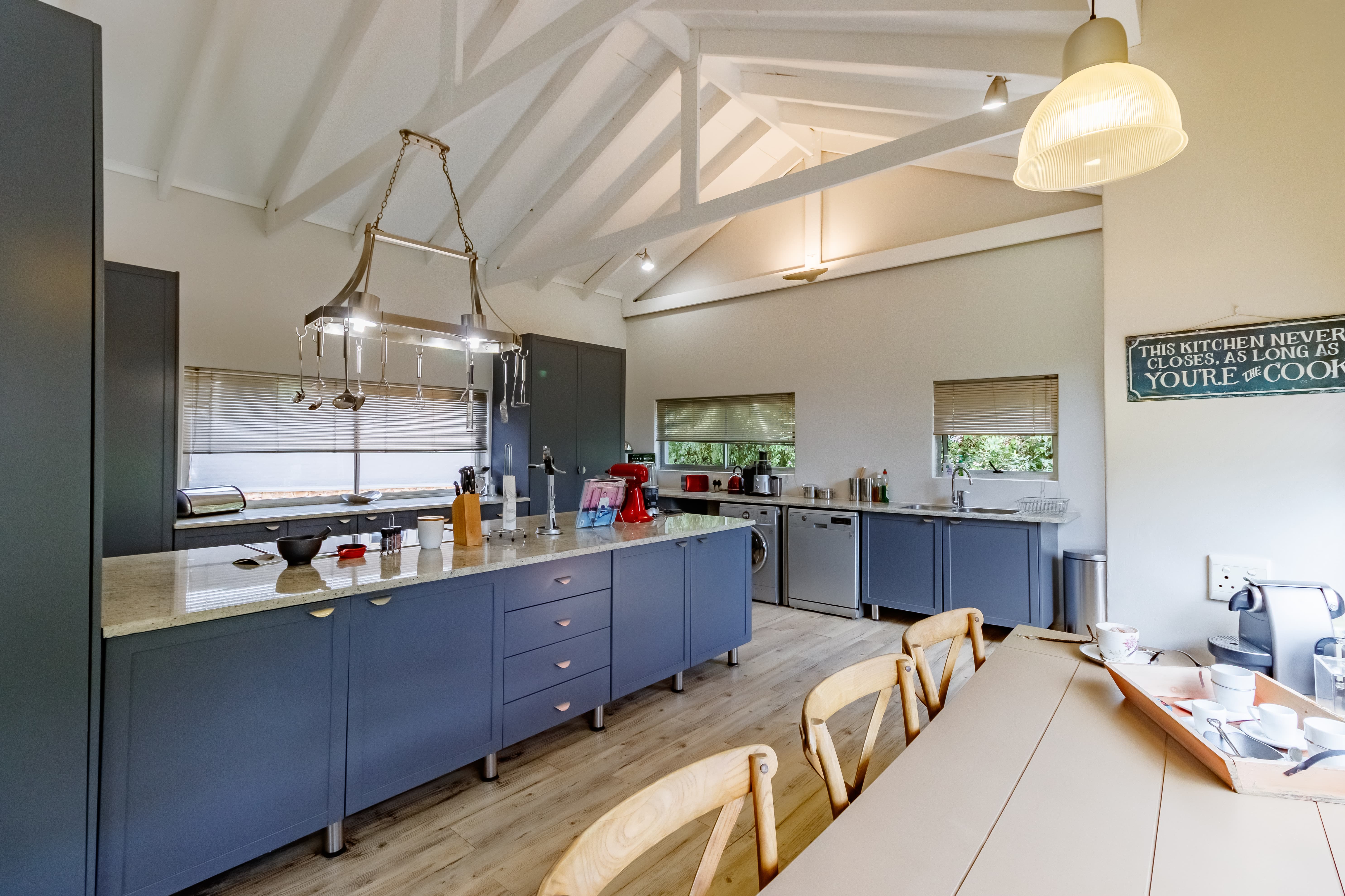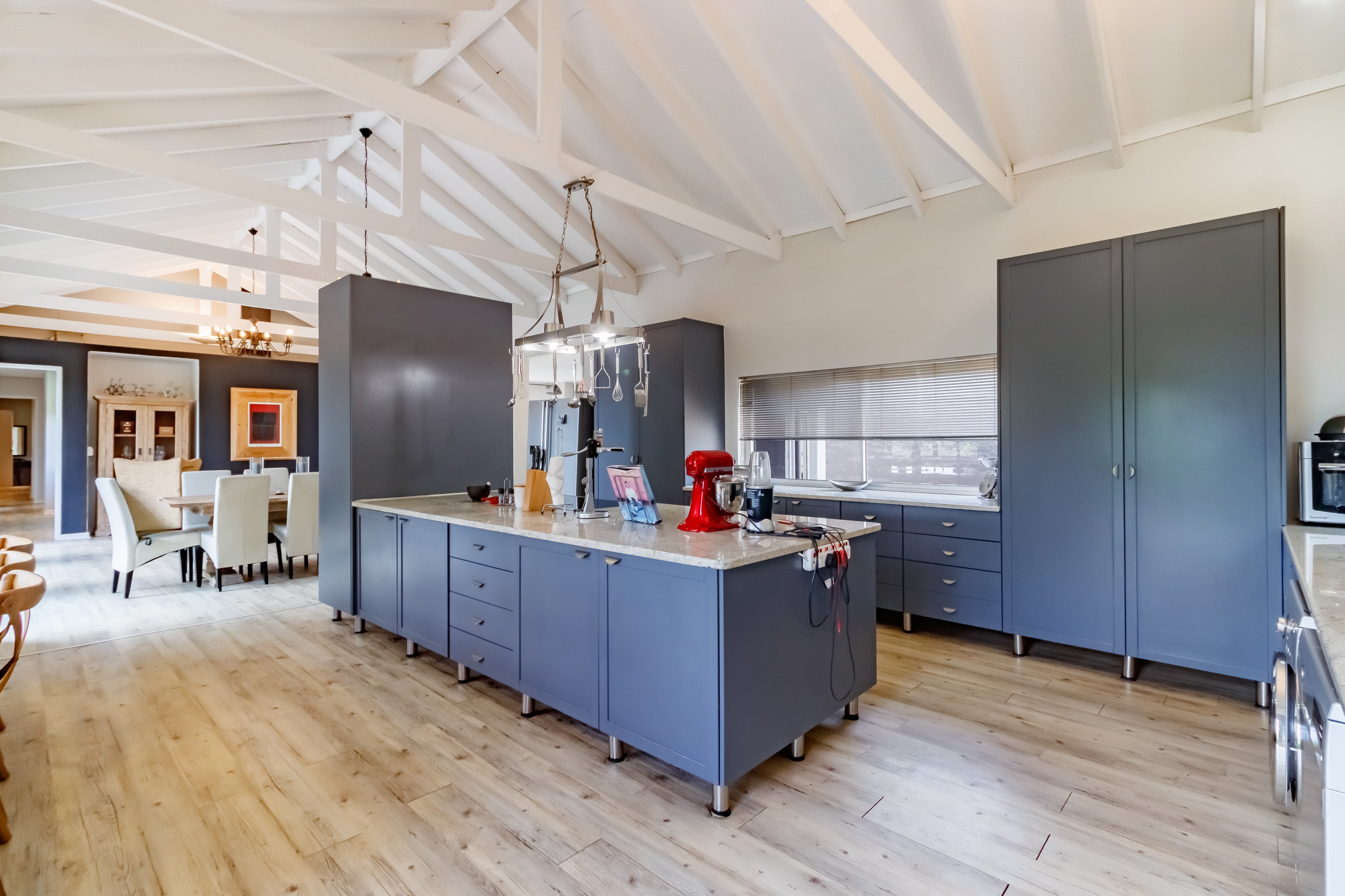 A beautiful wooden front door opens into a bright and expansive open-plan living area, filled with natural light and a warm, inviting atmosphere. The spacious country-style kitchen flows seamlessly into the dining area and comfortable seating space, creating a central hub for everyday living. A charming fireplace adds character and warmth, making this area ideal for both entertaining and cozy evenings at home.