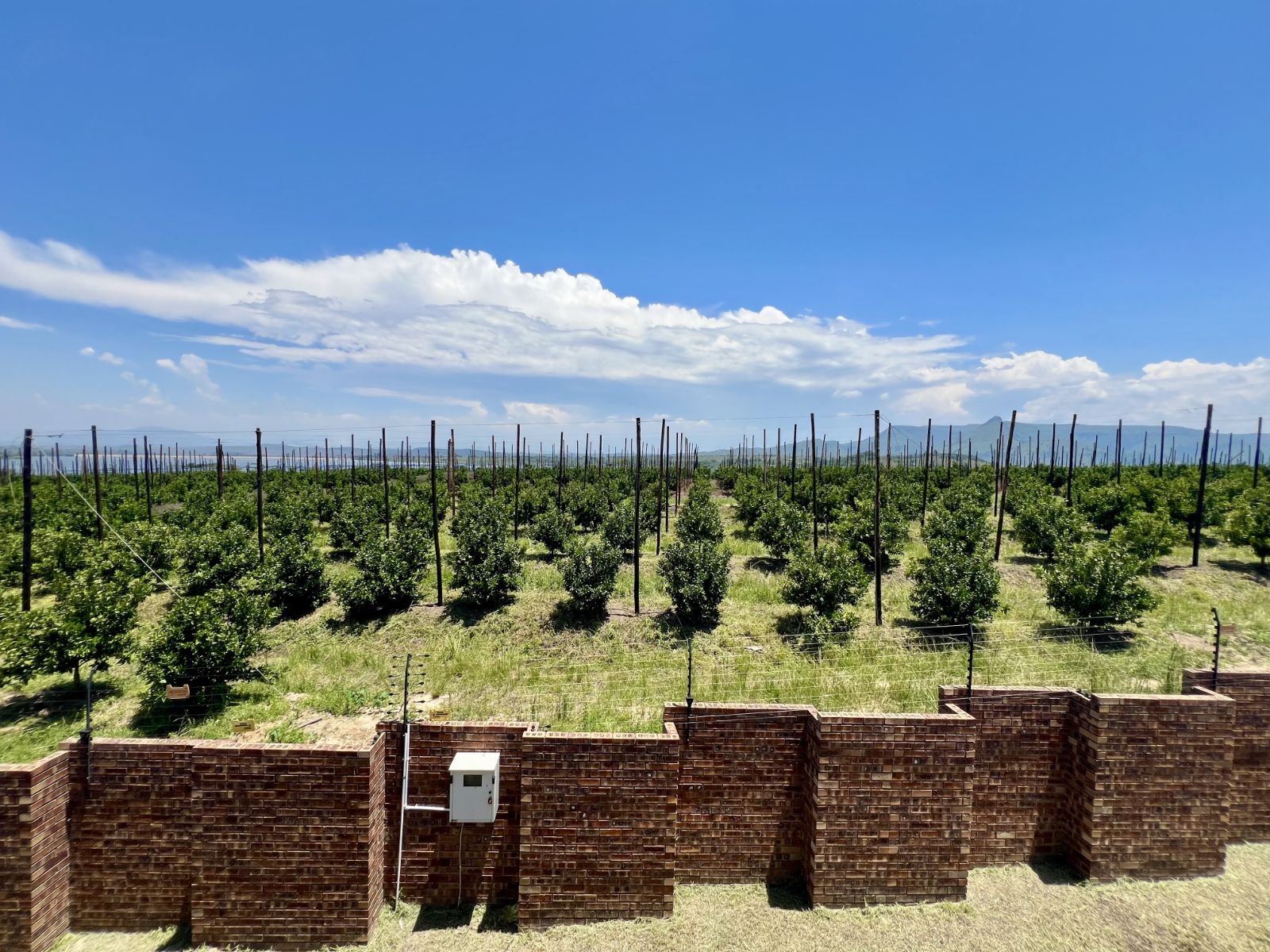 Covered timber verandas extend from the living area and bedroom wing, capturing elevated views over the dam to the front and citrus orchards to the rear.