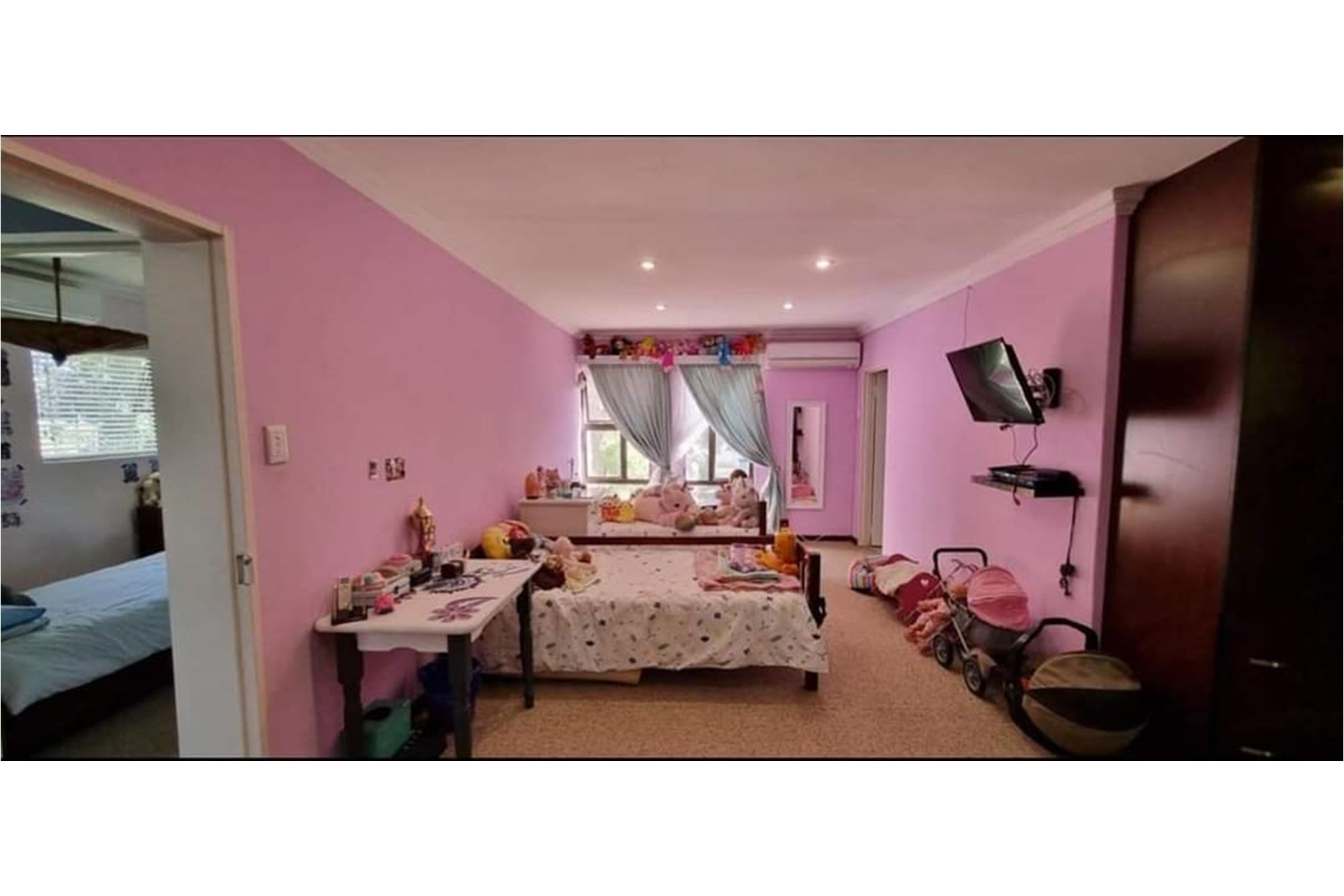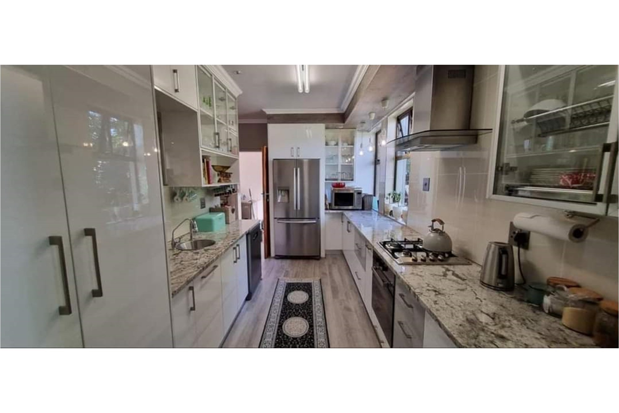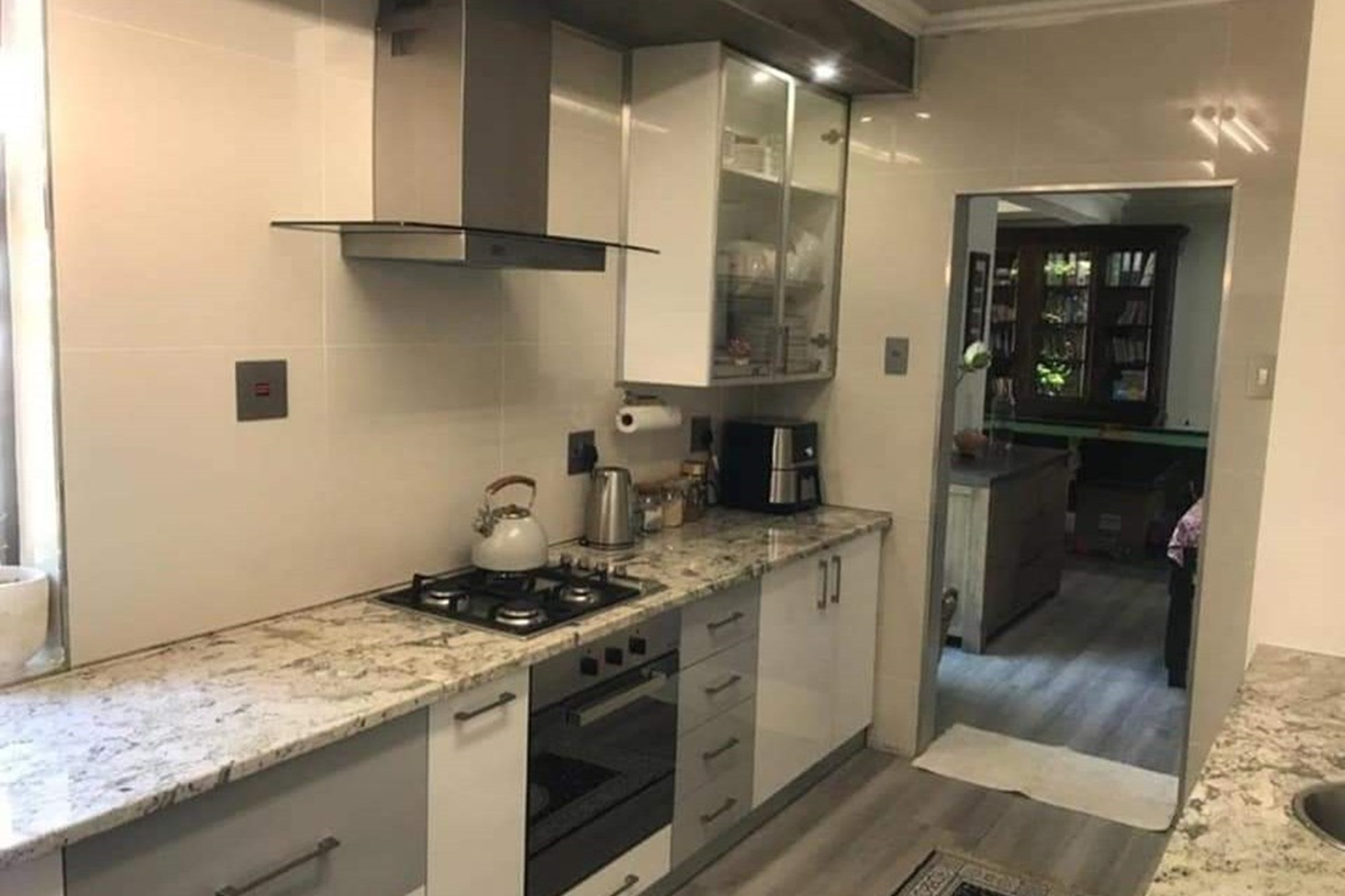 This charming 6-bedroom, 4-bathroom family home is designed for comfortable living and effortless entertaining. The property boasts an open-plan layout that seamlessly connects the lounge, family room with a built-in braai, dining area, and modern kitchen. The kitchen is equipped with built-in cupboards, an under-counter oven and hob, and features a convenient scullery and laundry area.