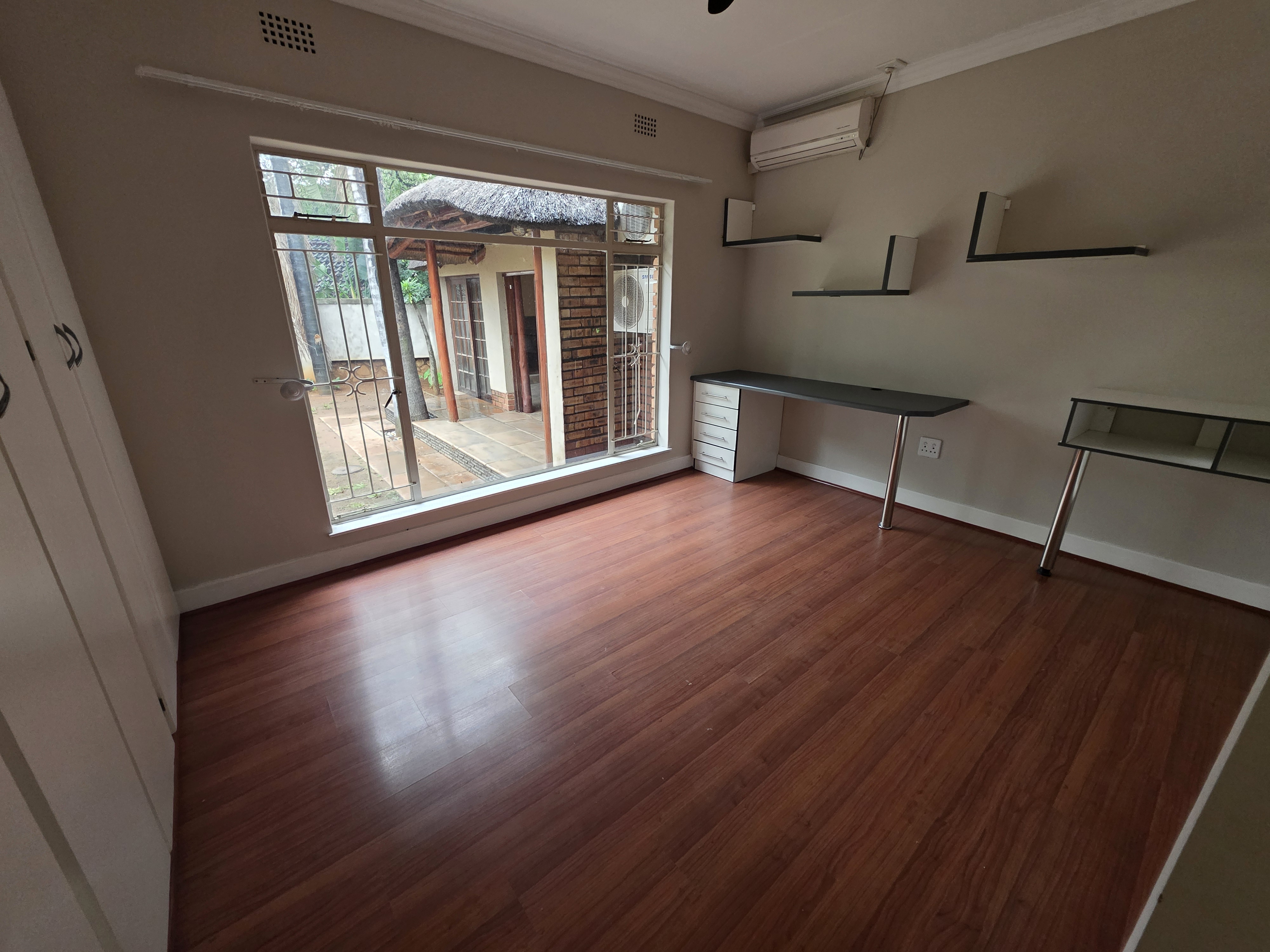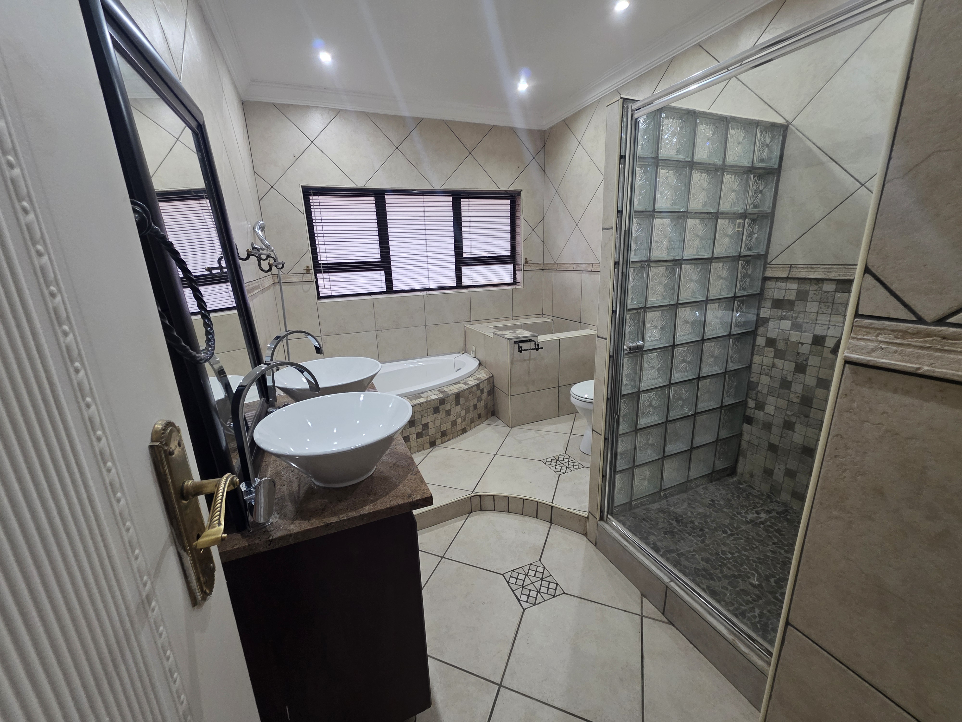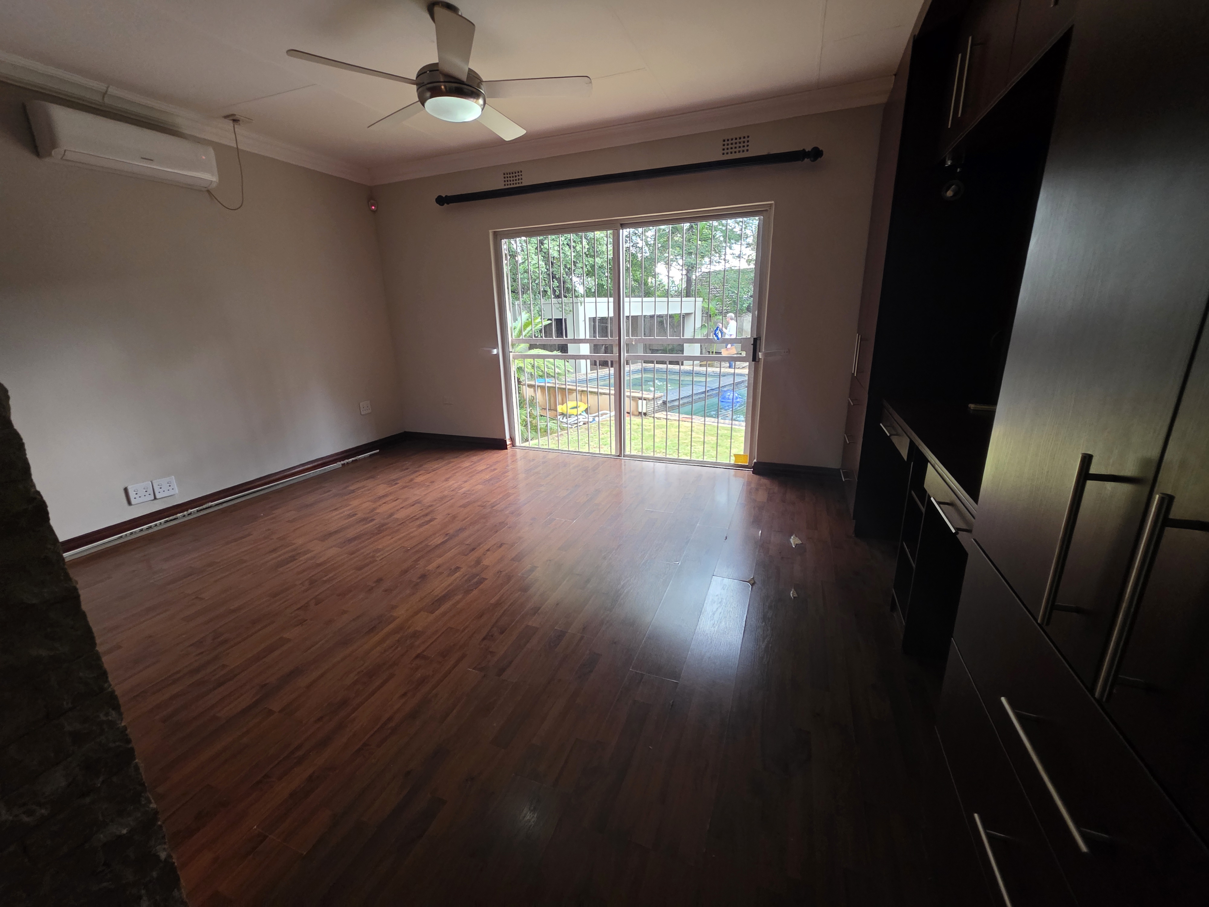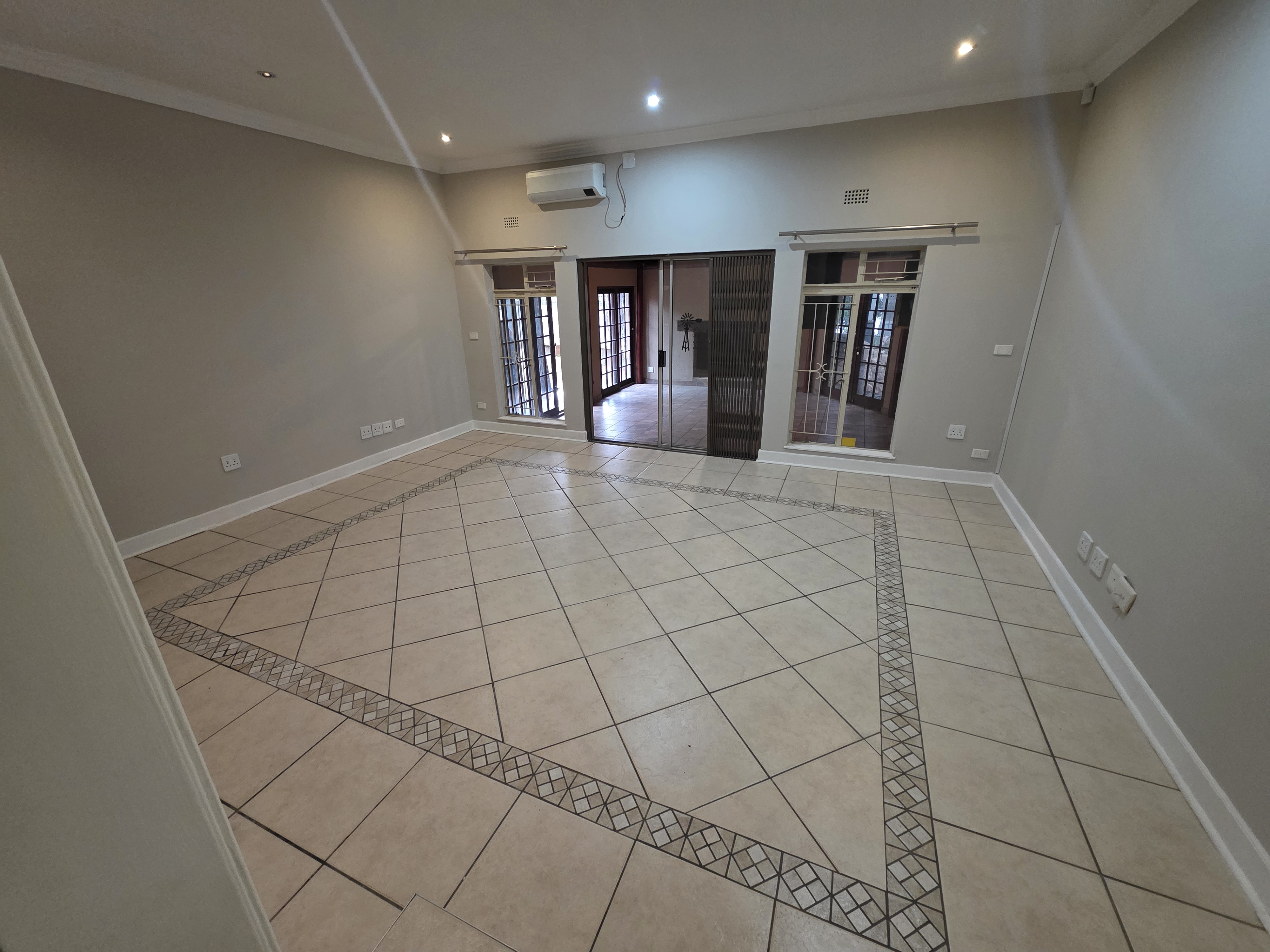 Adjacent to the house a lapa with built in braai, doors that open up on the pool area (heated pool & kiddies pool side) with another open under-roof-entertainment area. Nice sized garden. The outside room converted into a bachelors with a small kitchen and bathroom. Additional there is an outside toilet, Jojo Watertank and three garages (one is a hollywood garage)