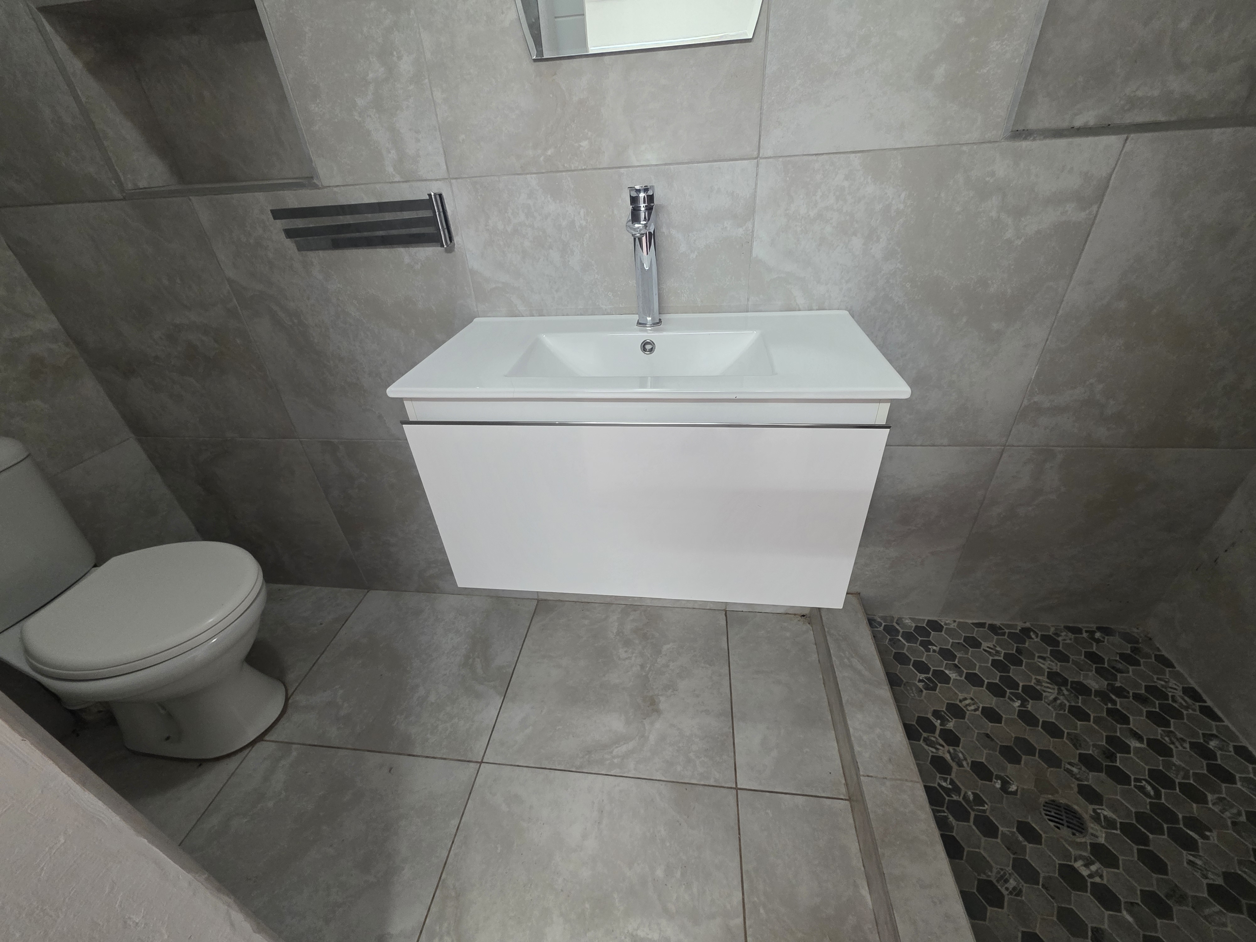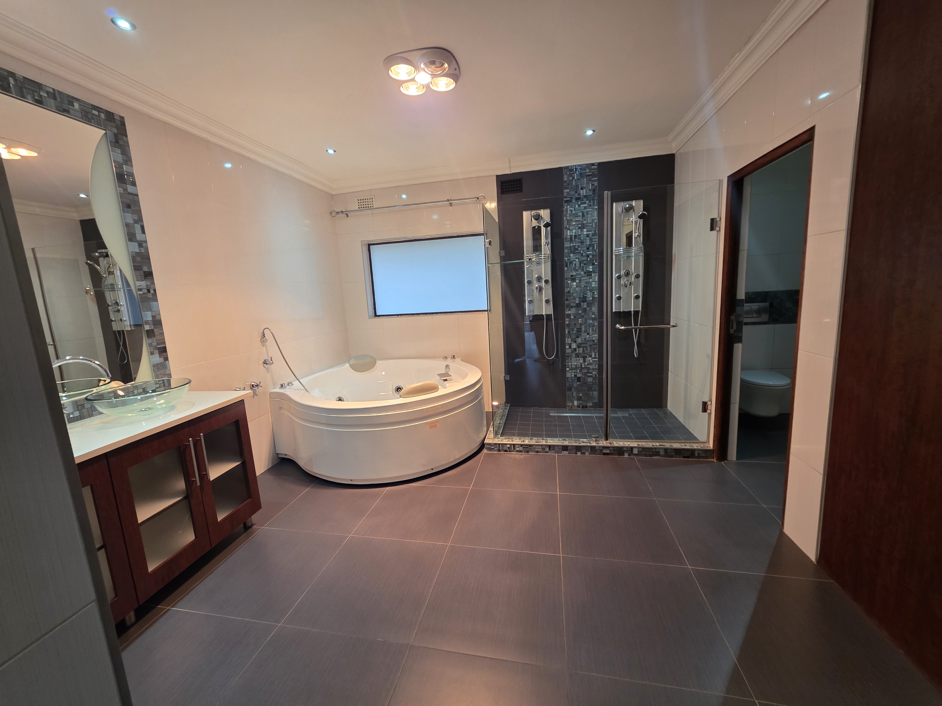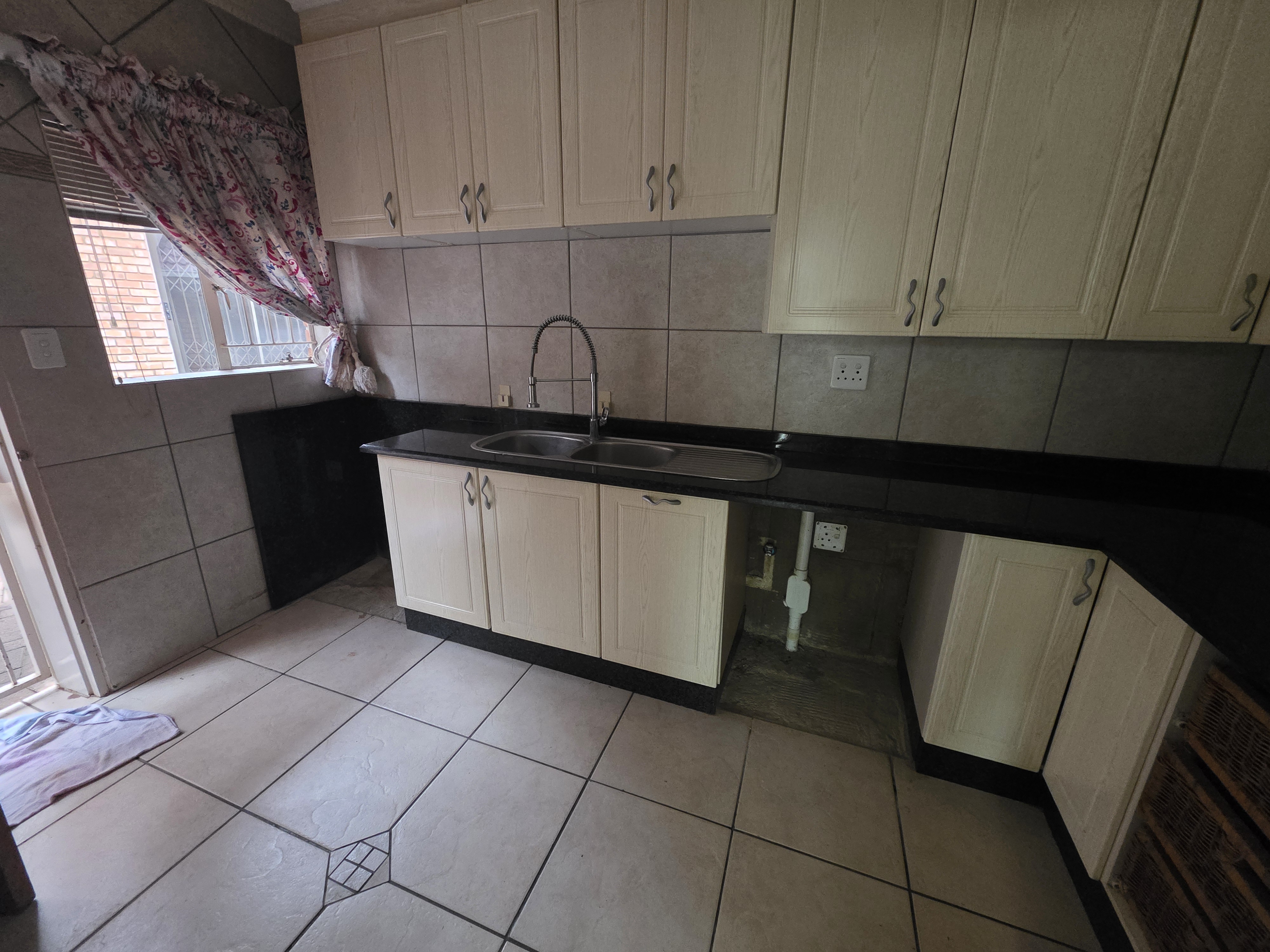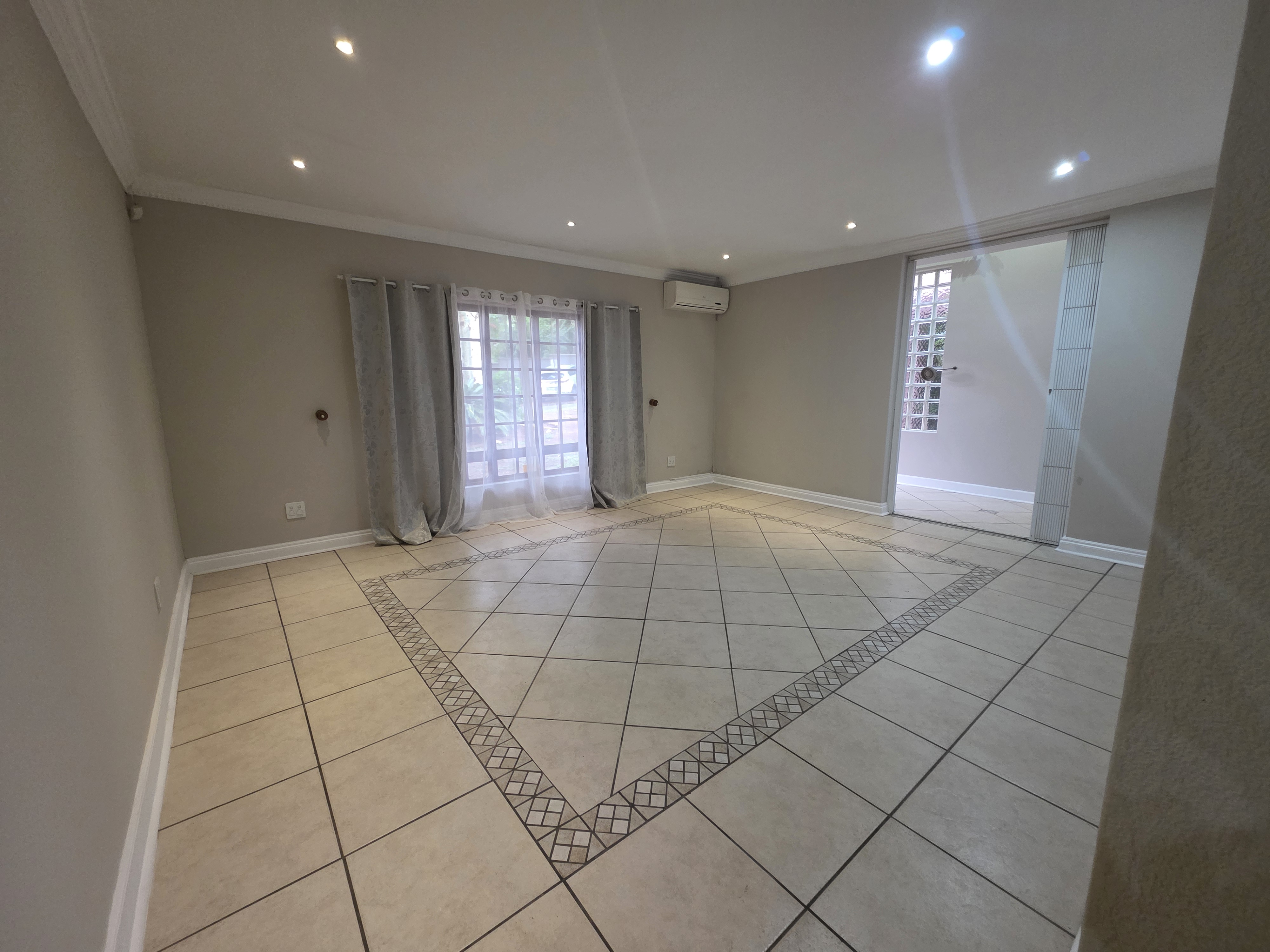 Adjacent to the house a lapa with built in braai, doors that open up on the pool area (heated pool & kiddies pool side) with another open under-roof-entertainment area. Nice sized garden. The outside room converted into a bachelors with a small kitchen and bathroom. Additional there is an outside toilet, Jojo Watertank and three garages (one is a hollywood garage)