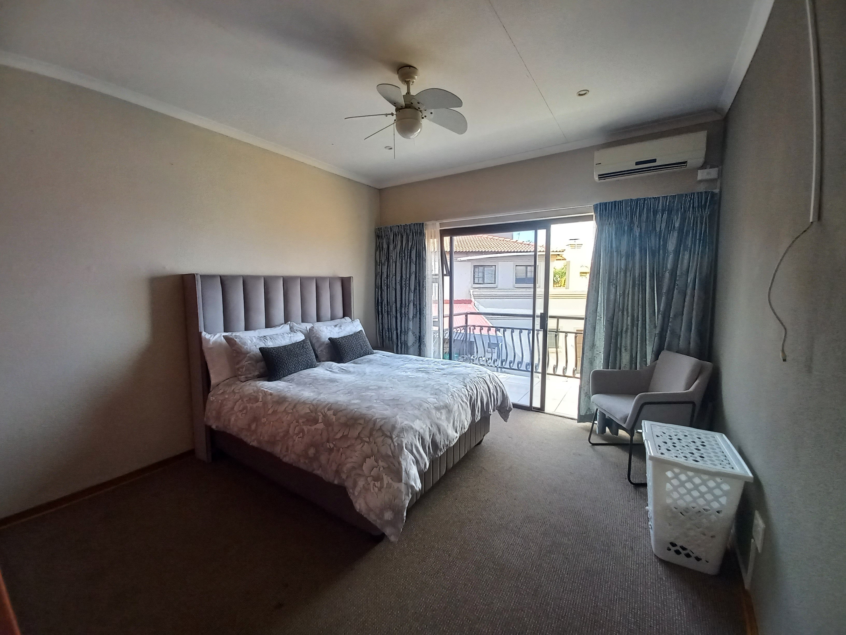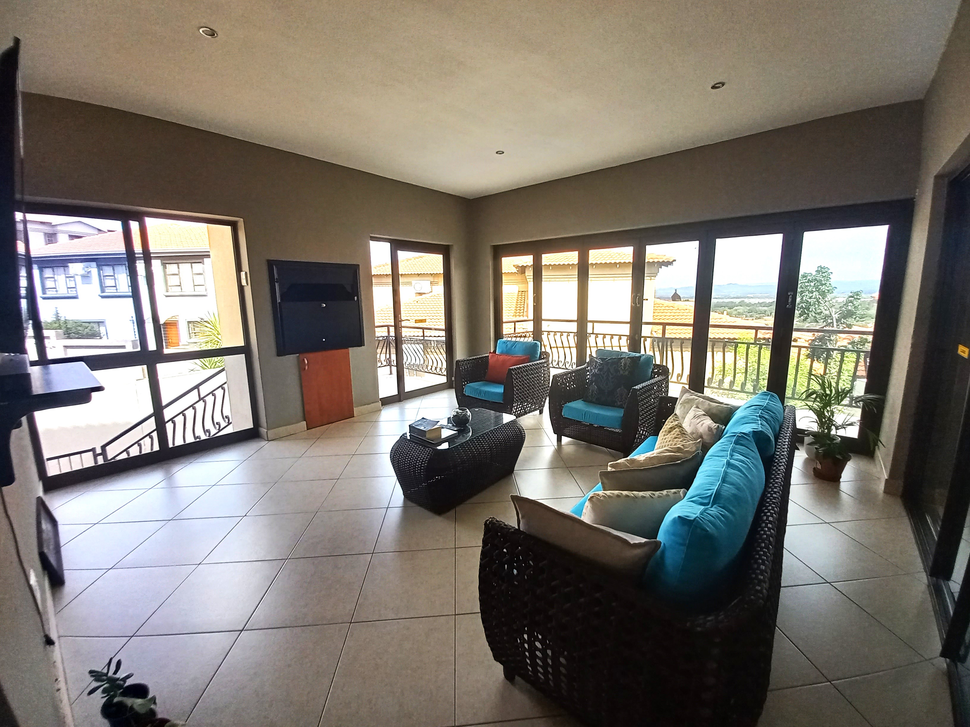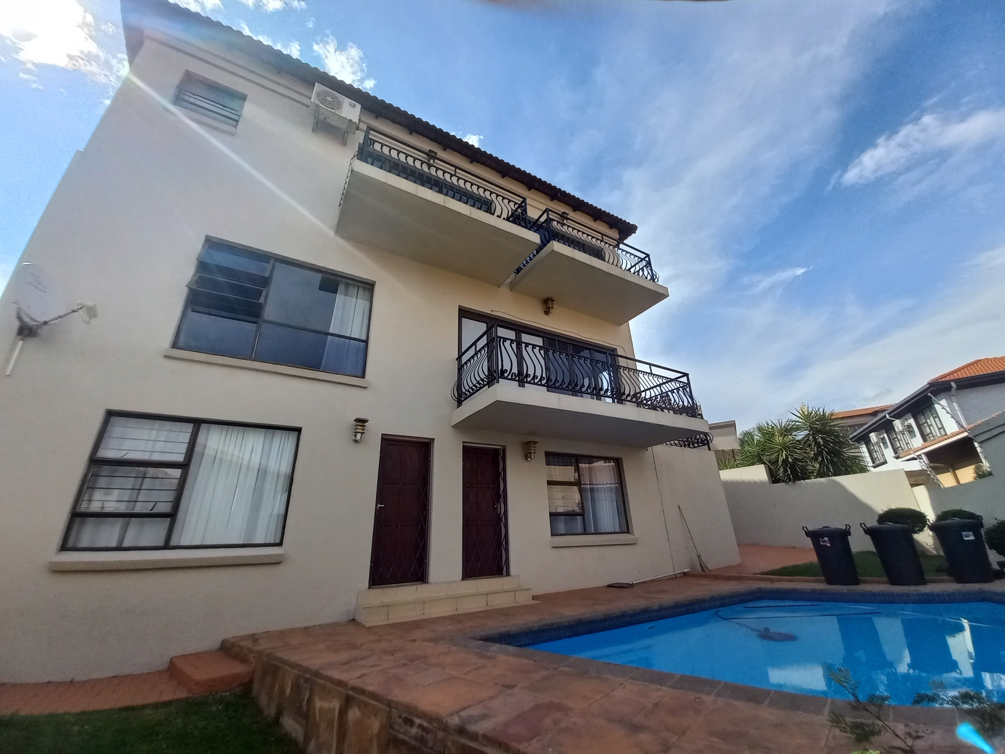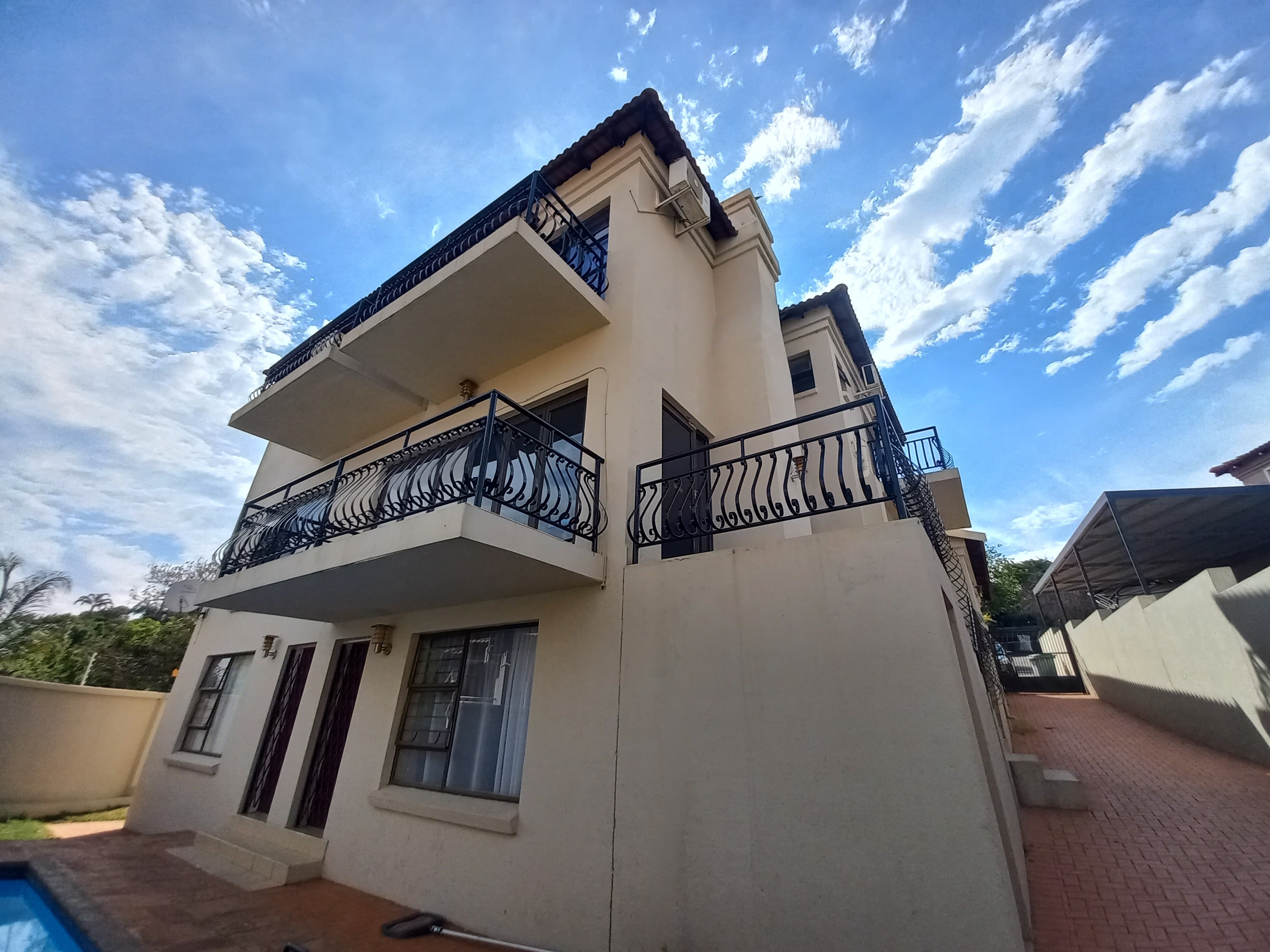 Outdoor living is equally impressive. The home opens to a private entertainment area featuring a sparkling swimming pool and an enclosed patio with built-in braai, perfect for hosting elegant gatherings or enjoying quiet evenings at home. Three well-positioned balconies offer serene views and private moments for reflection, morning coffee, or evening sundowners.
