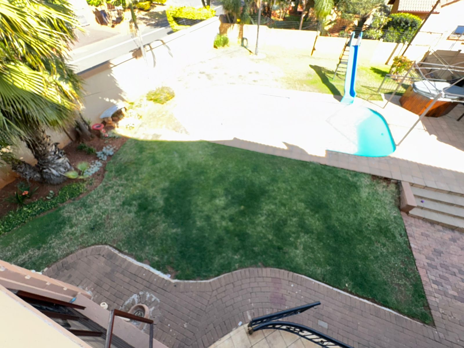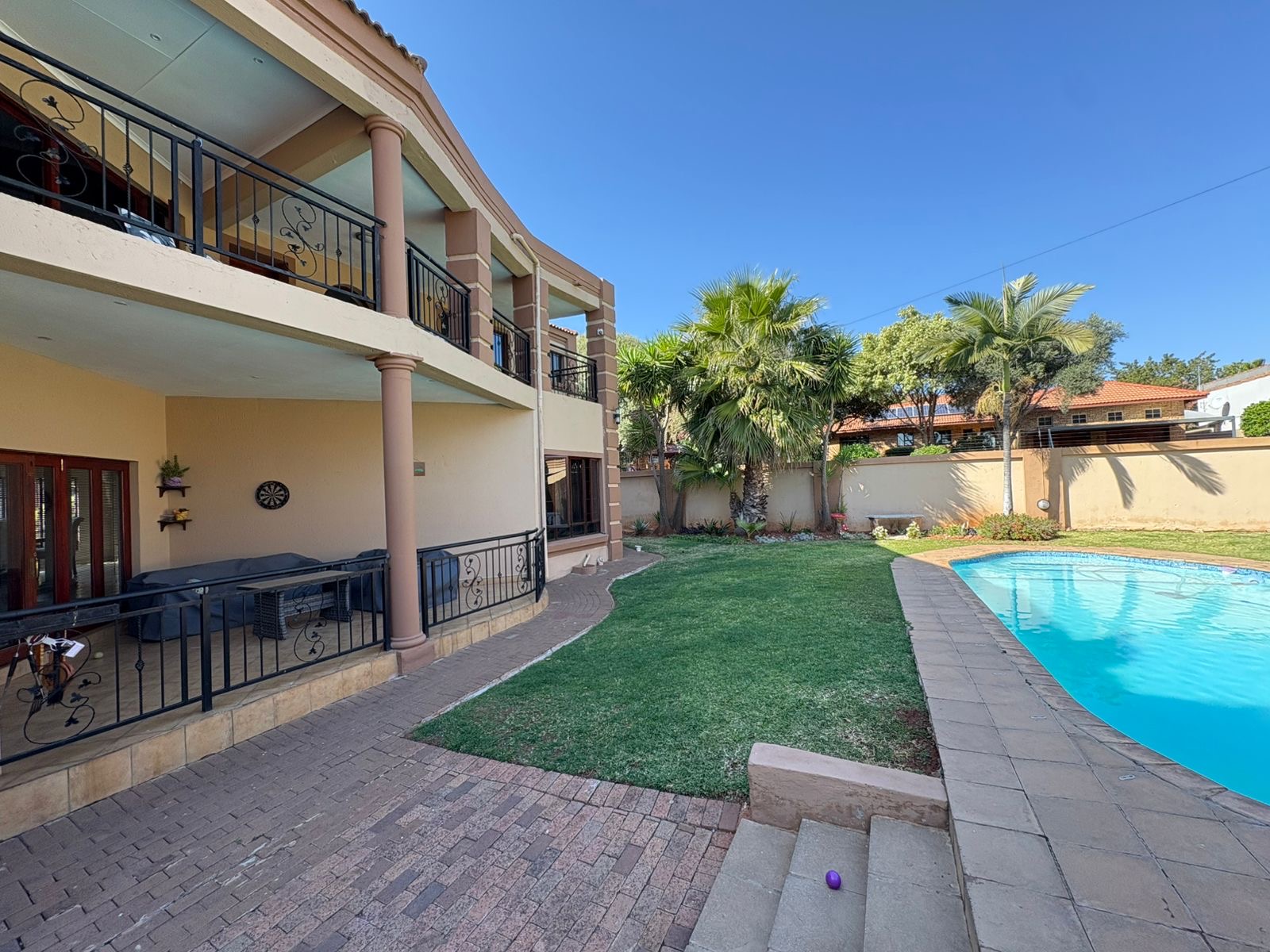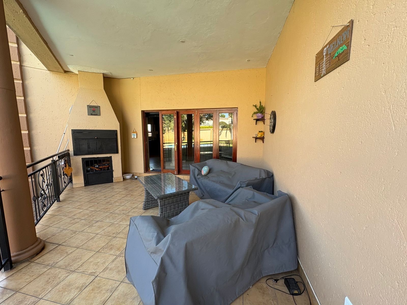 The outdoor area, featuring an enclosed entertainment space with a built-in braai, ideally positioned next to the sparkling swimming pool. There’s also a covered patio with a second built-in braai, creating the perfect flow from outdoor to indoor living.