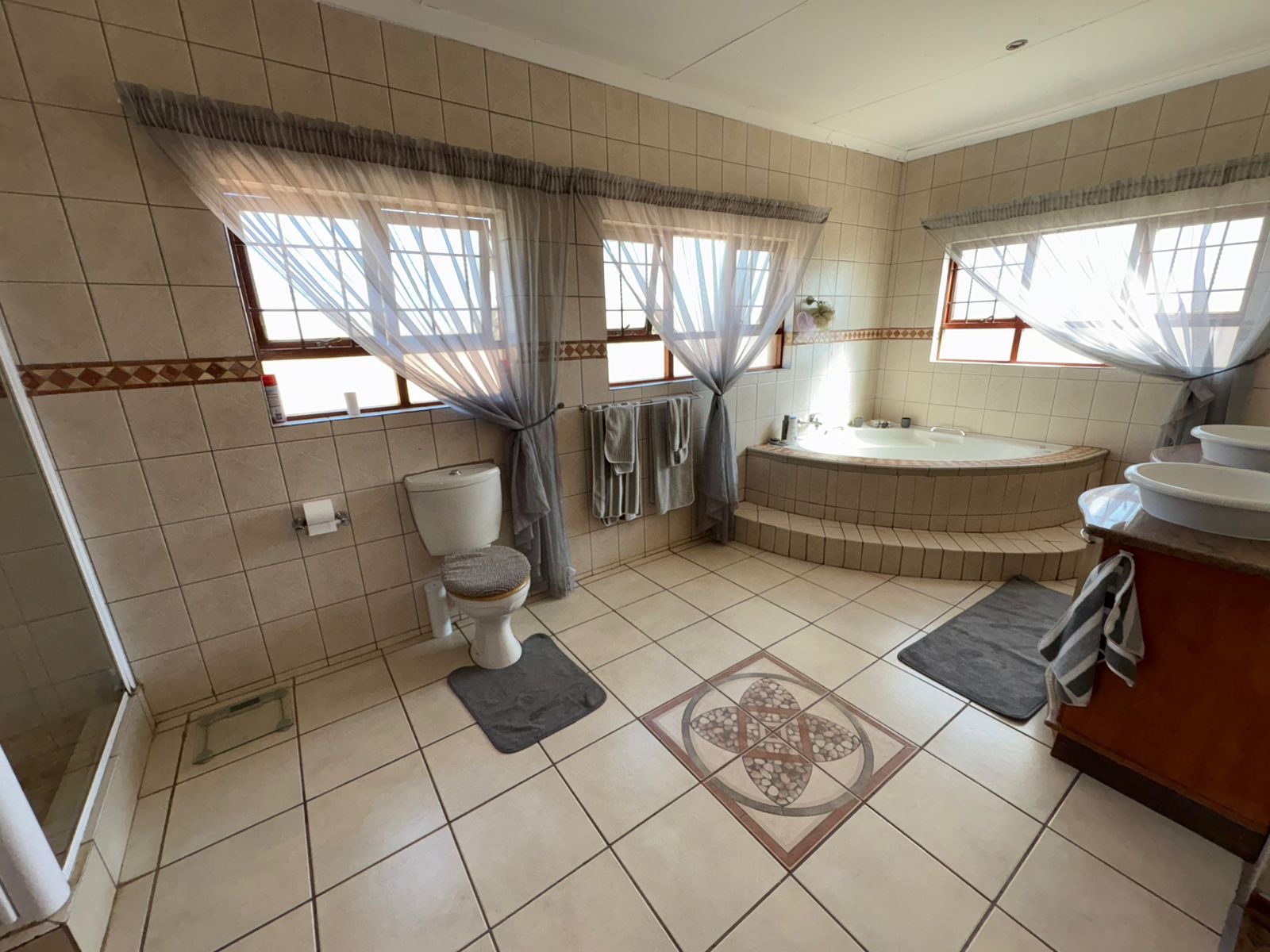 Step inside to discover generous living areas on the ground floor. The spacious kitchen is a chef’s delight with a separate scullery and laundry, flowing effortlessly into the dining room and lounge — perfect for family gatherings or hosting guests. A guest toilet and a private downstairs bedroom with en-suite bathroom complete the ground level.