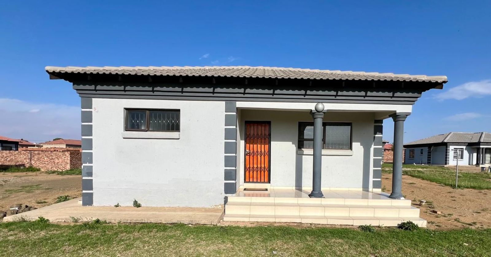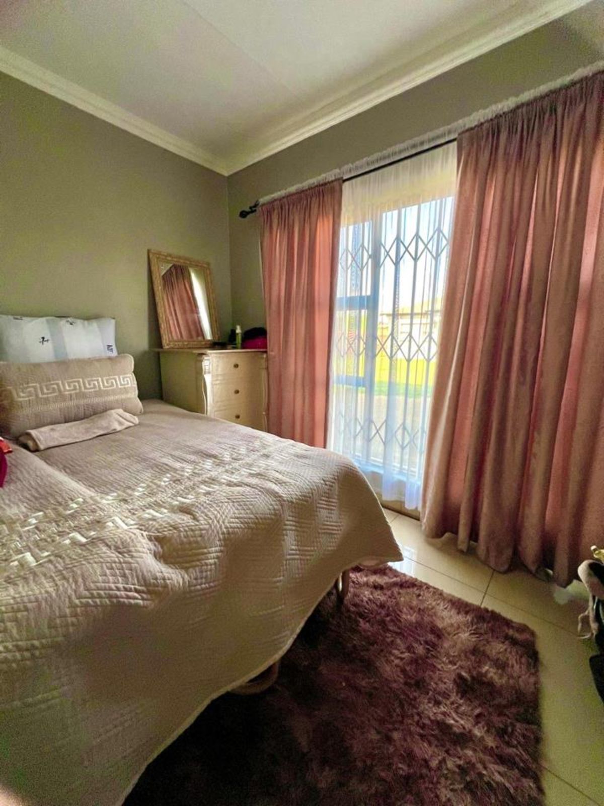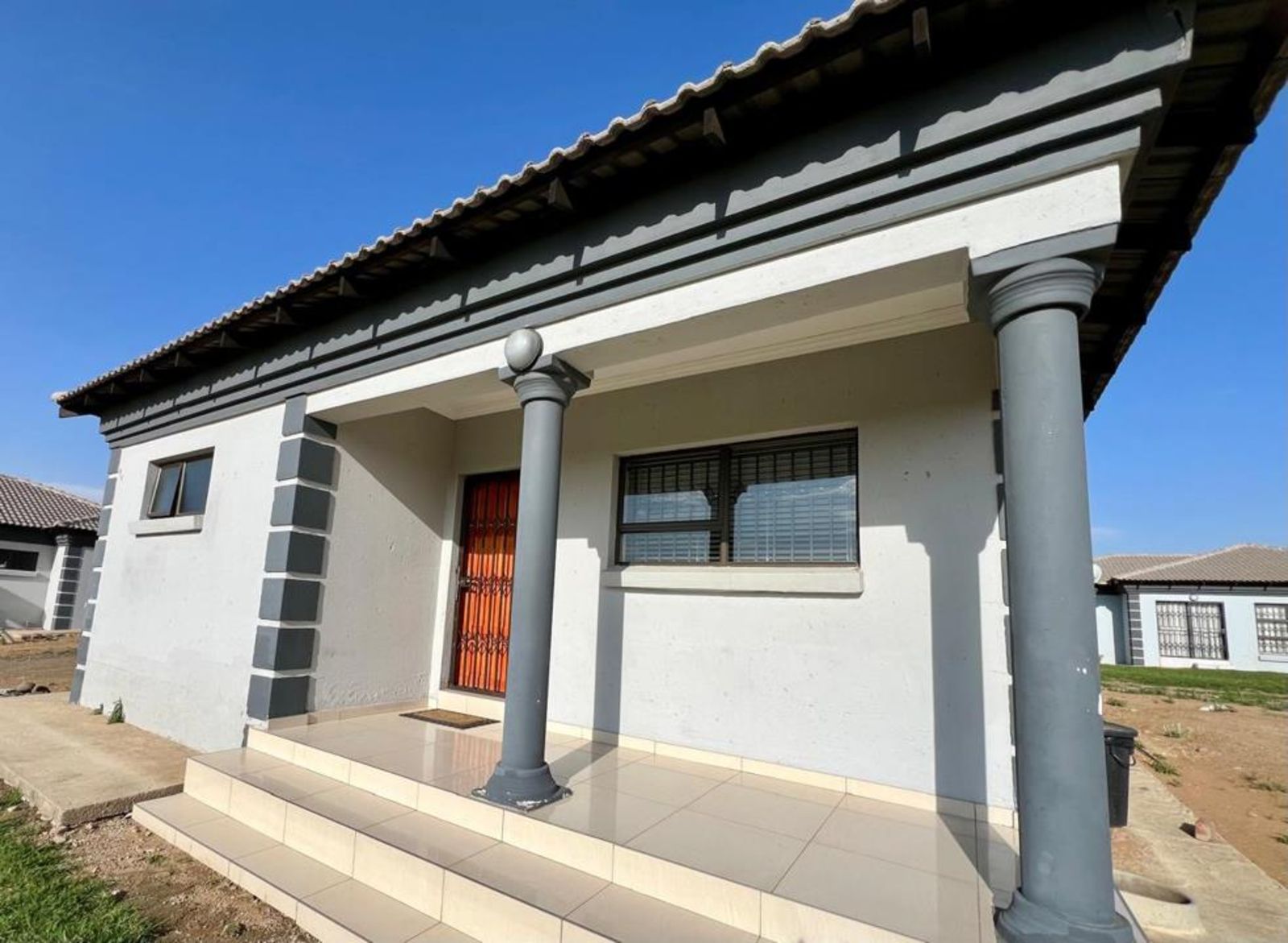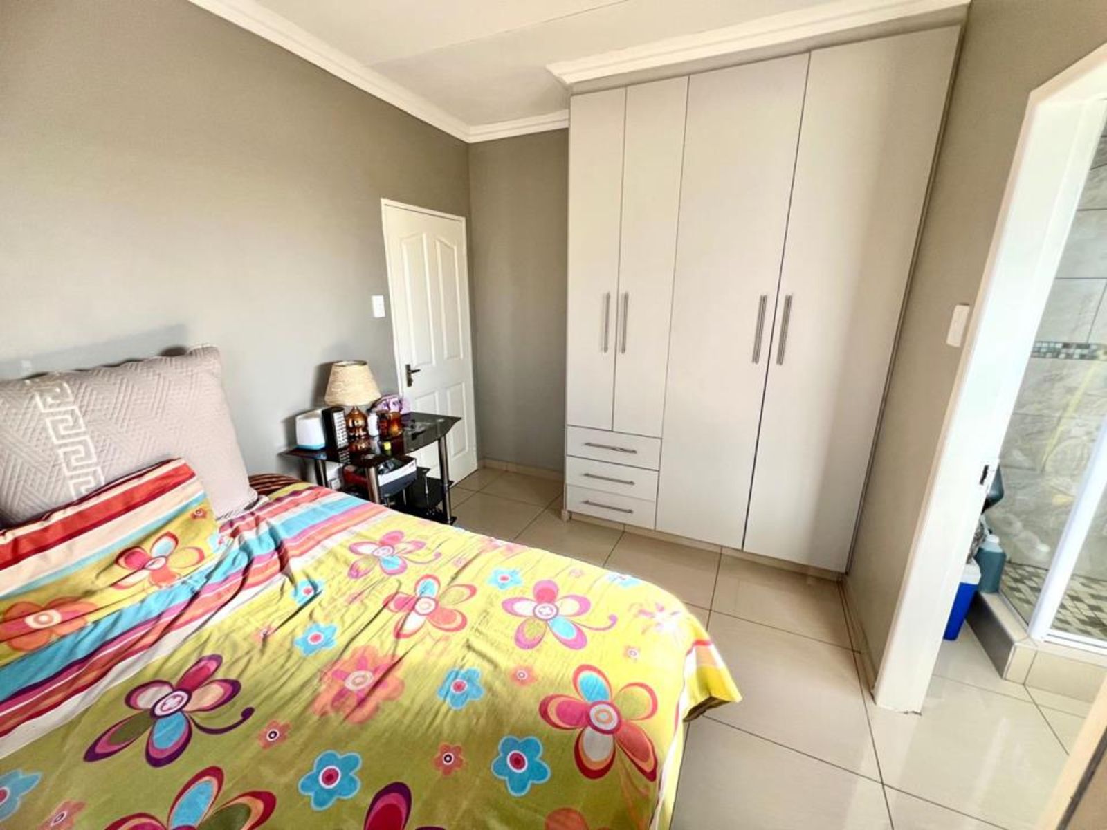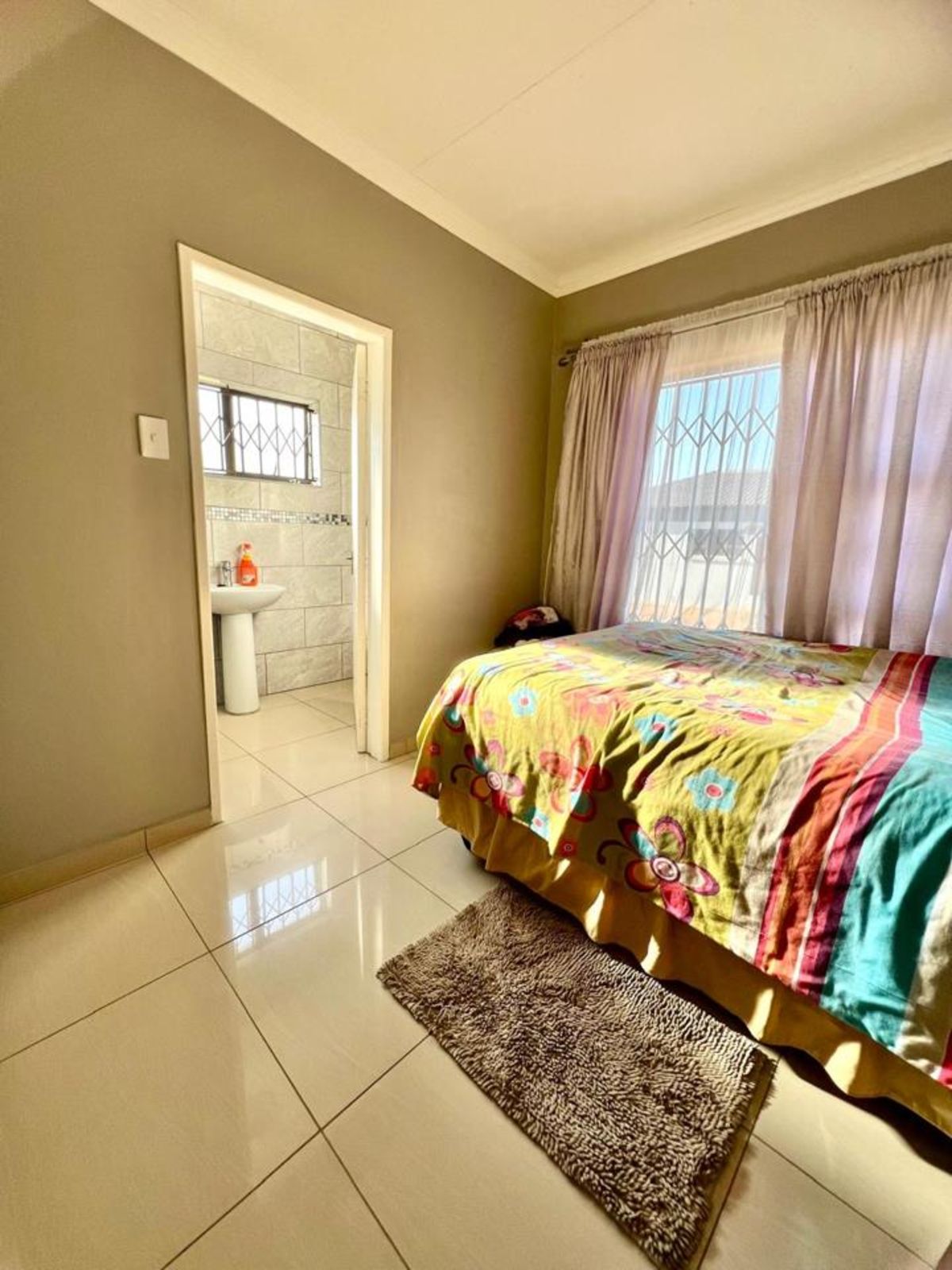 The main bedroom comes with its own en-suite bathroom for added privacy, while sleek tiles throughout the home and aluminum-framed windows add a modern touch. With added security features like burglar bars and a Trellidoor, this home promises peace of mind.