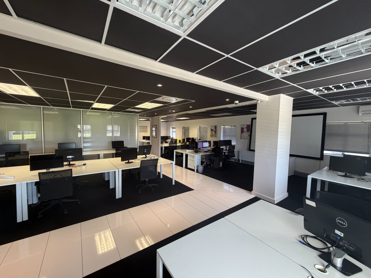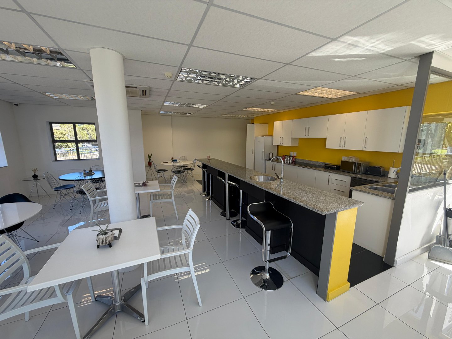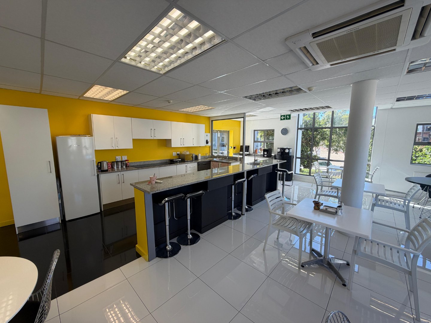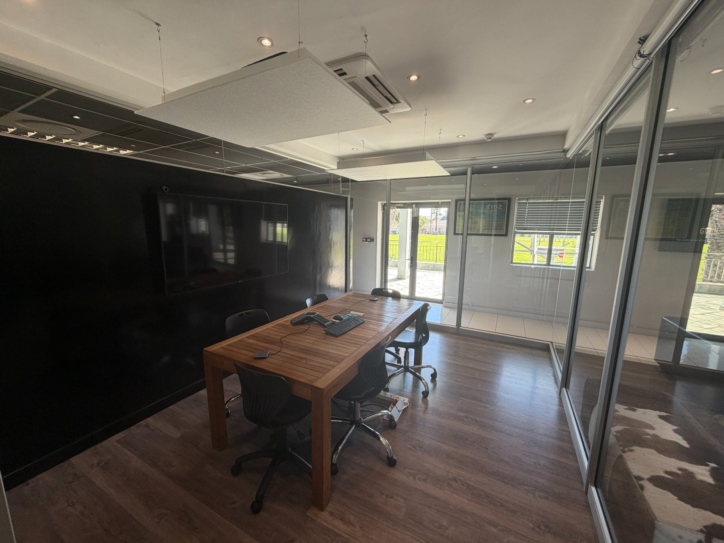 The ground floor features a spacious open-plan office area, complemented by two well-sized boardrooms that can easily double as private offices. Multiple meeting pods support collaborative working, while a large canteen area provides an excellent staff amenity. The floor is further serviced by private ablutions, an on-site shower, and a balcony with direct access overlooking the landscaped park area, creating a pleasant and functional working environment.