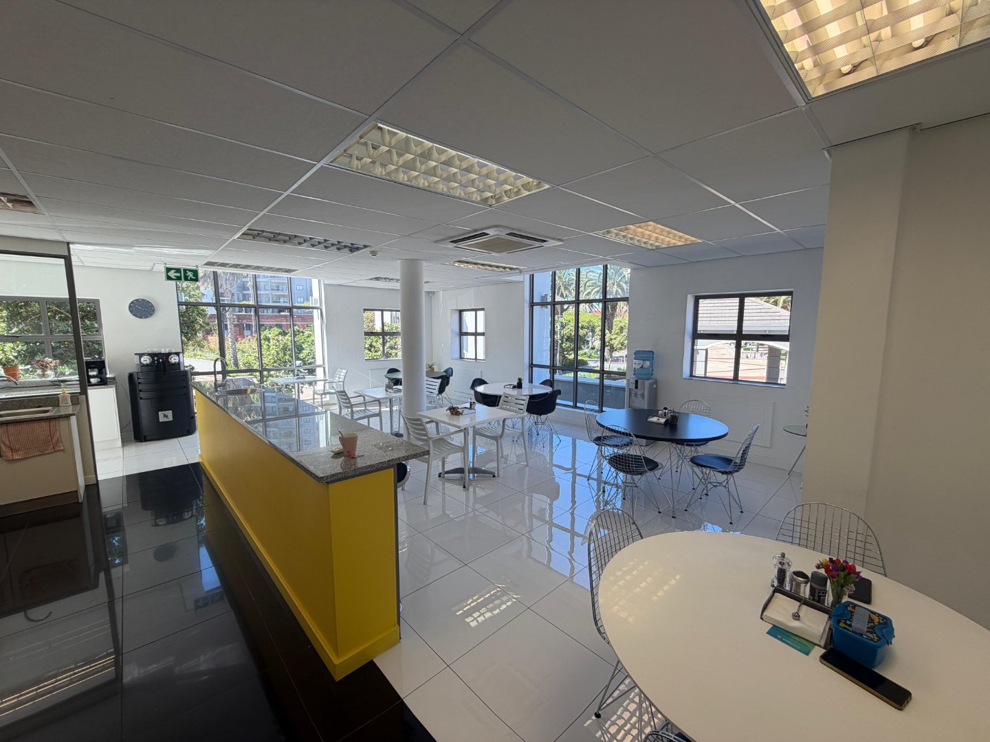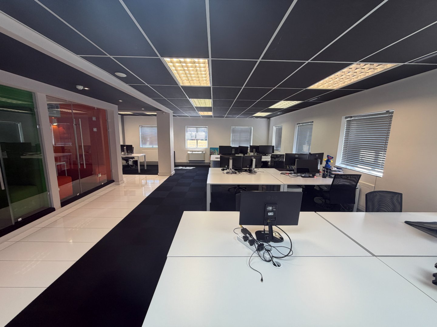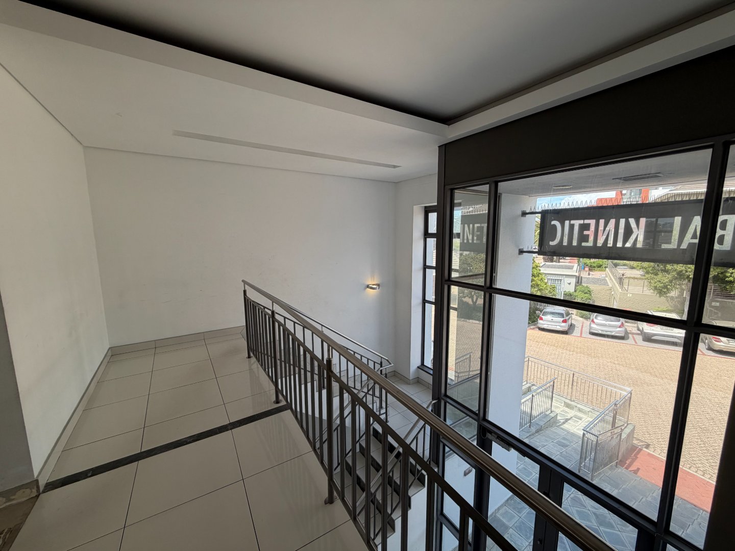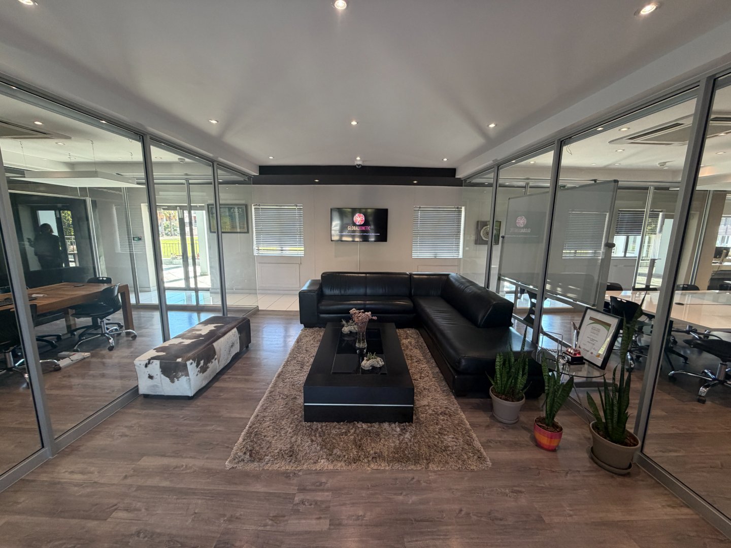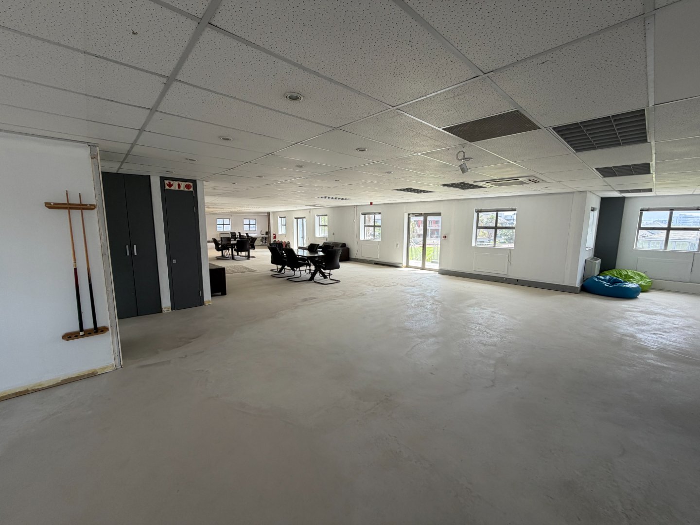 The ground floor features a spacious open-plan office area, complemented by two well-sized boardrooms that can easily double as private offices. Multiple meeting pods support collaborative working, while a large canteen area provides an excellent staff amenity. The floor is further serviced by private ablutions, an on-site shower, and a balcony with direct access overlooking the landscaped park area, creating a pleasant and functional working environment.
