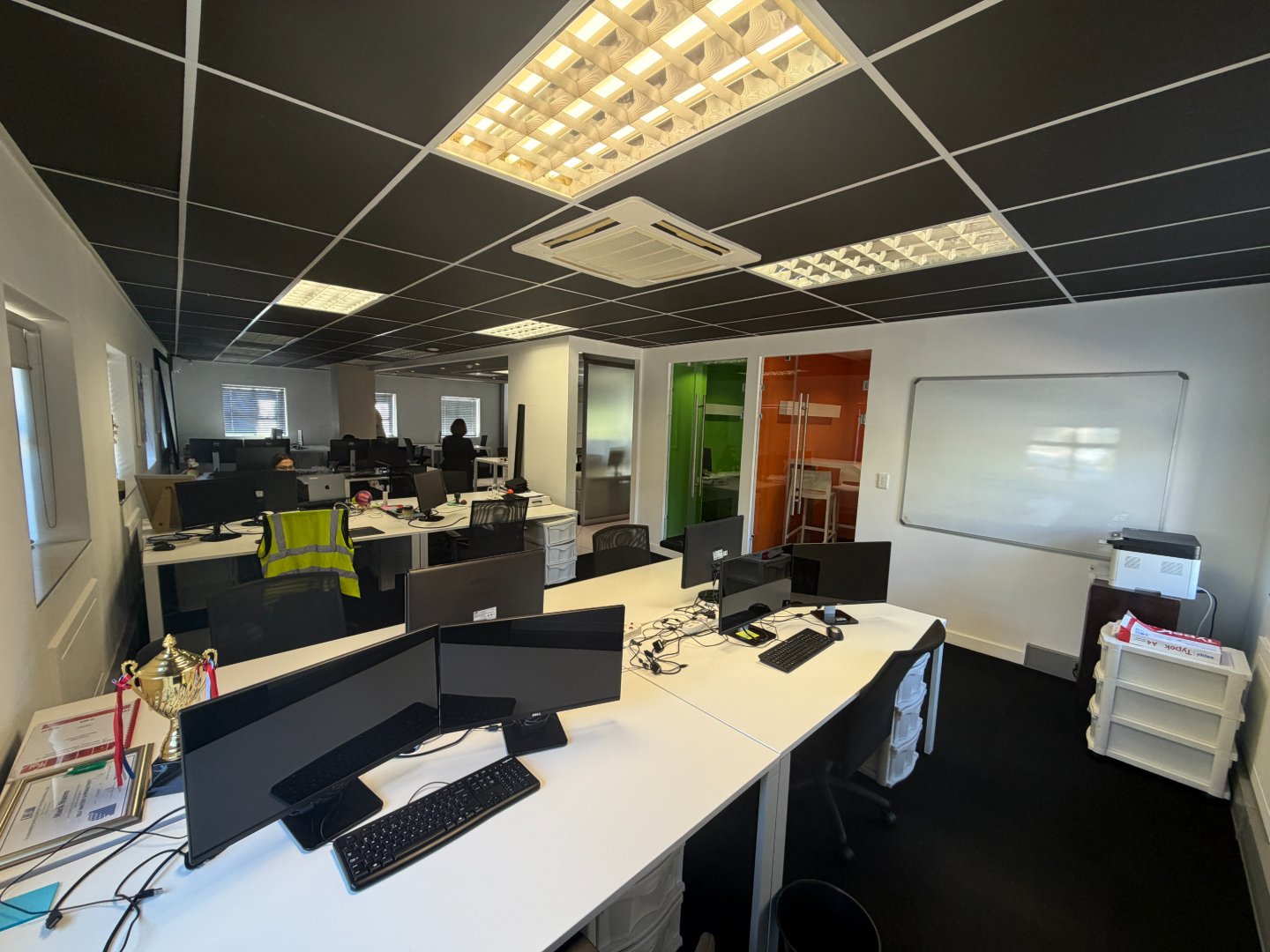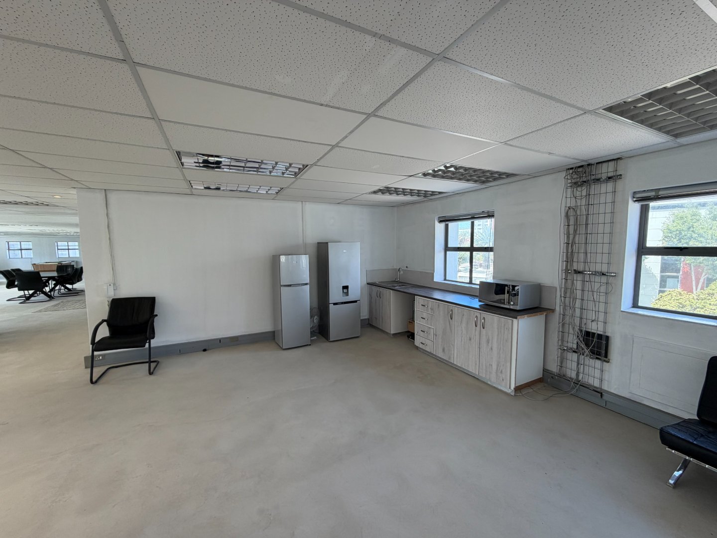 The second floor offers a fully open-plan layout, allowing for complete flexibility in office configuration. This level includes a dedicated kitchen area, private ablution facilities, and access to a balcony that enhances natural light and provides an outdoor pause space for staff or informal meetings.