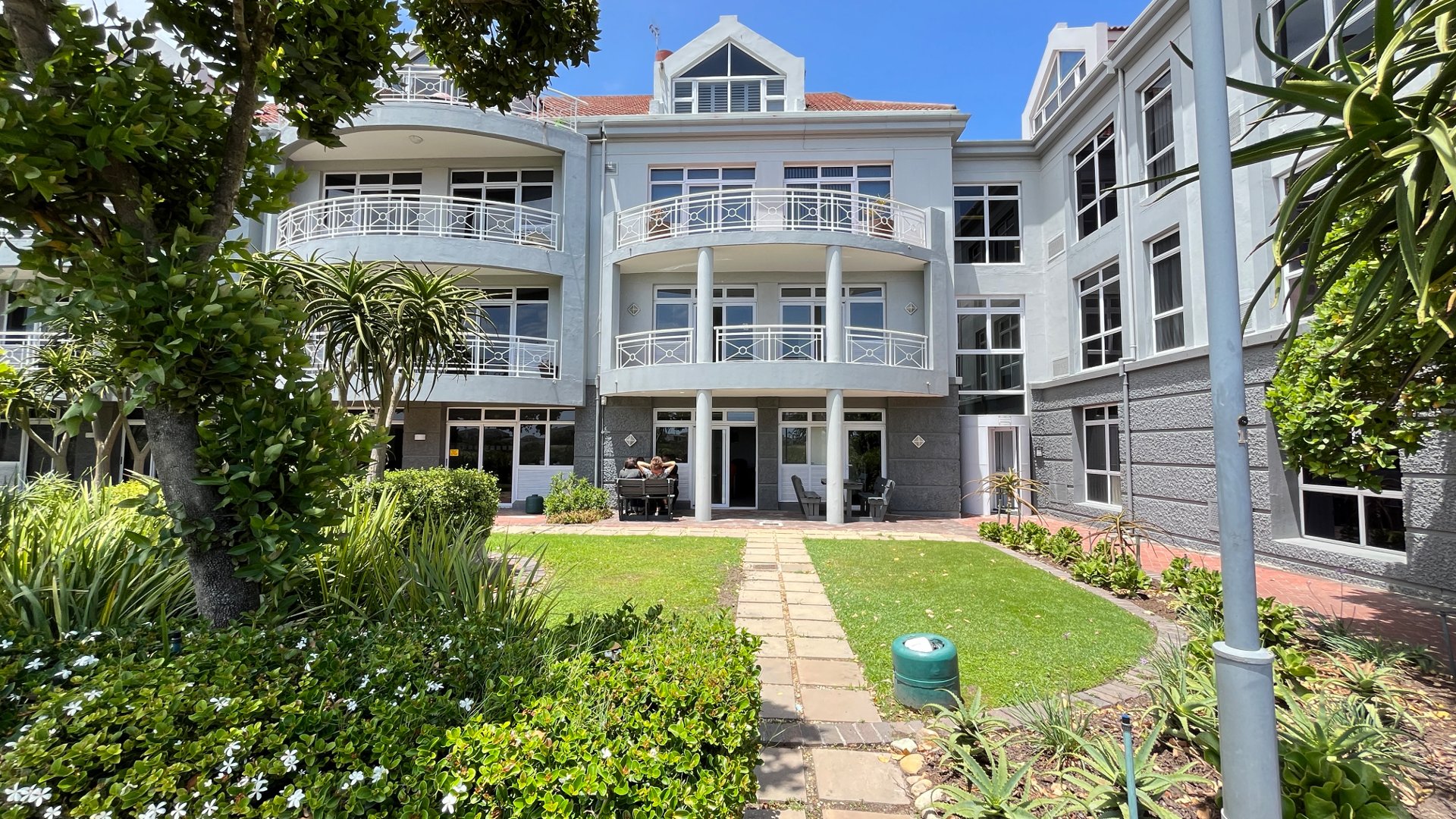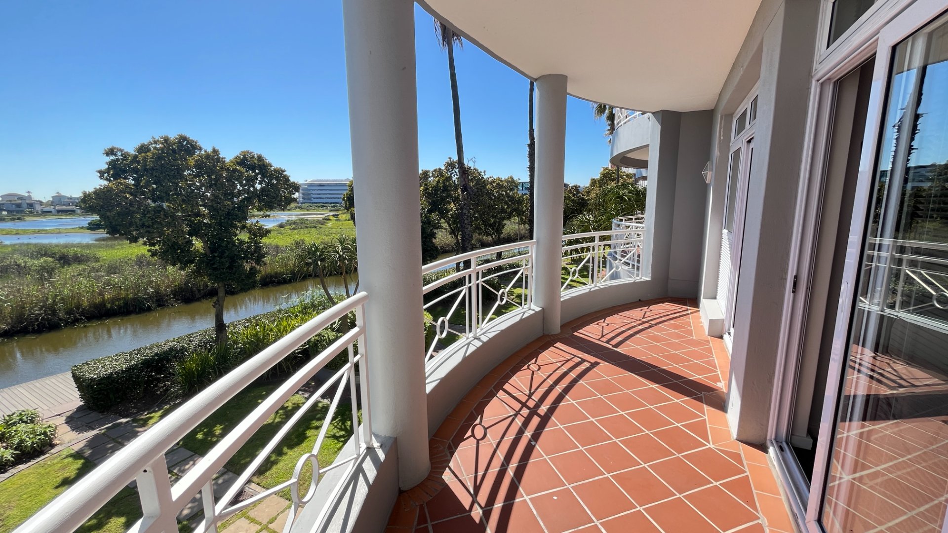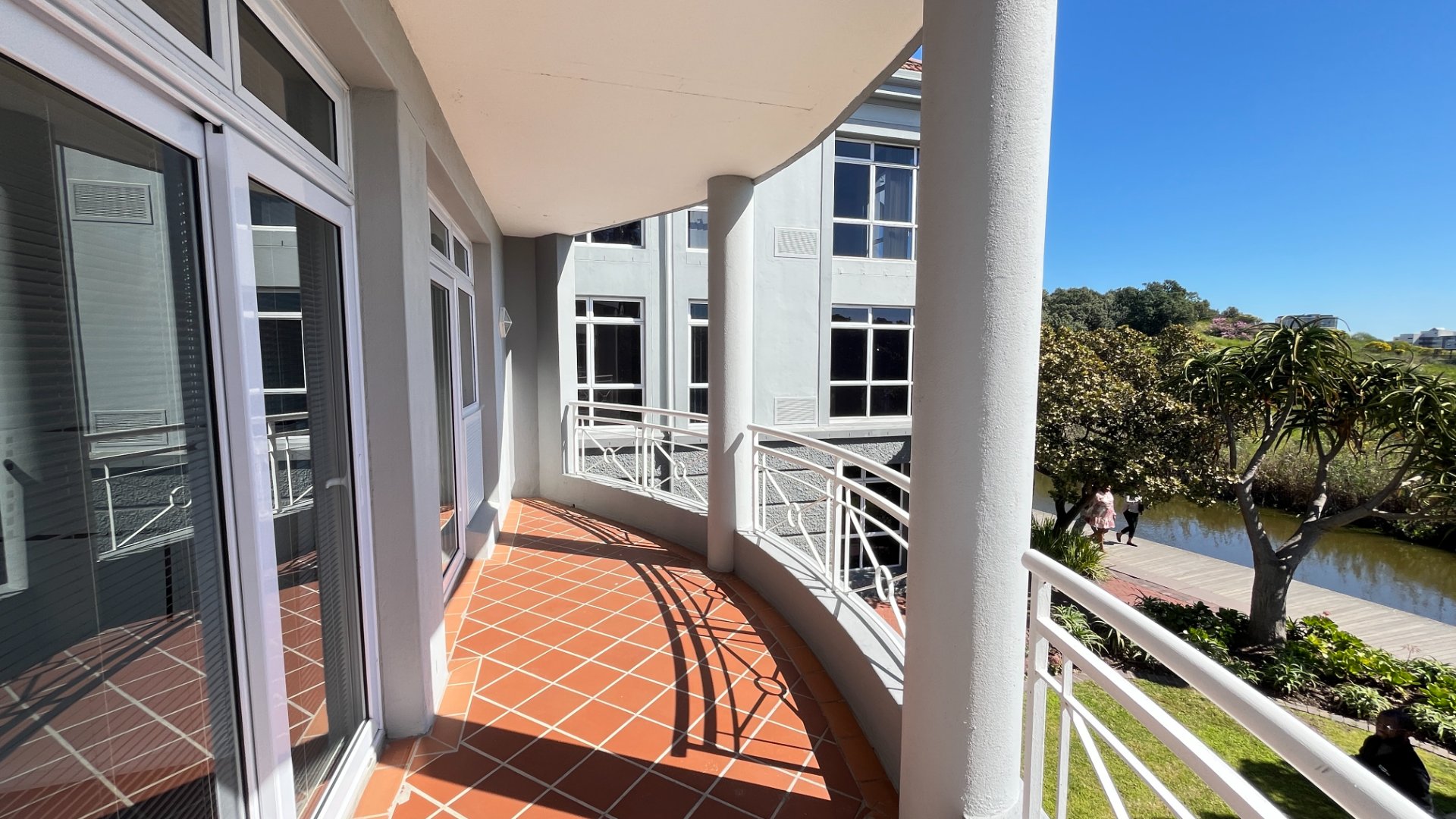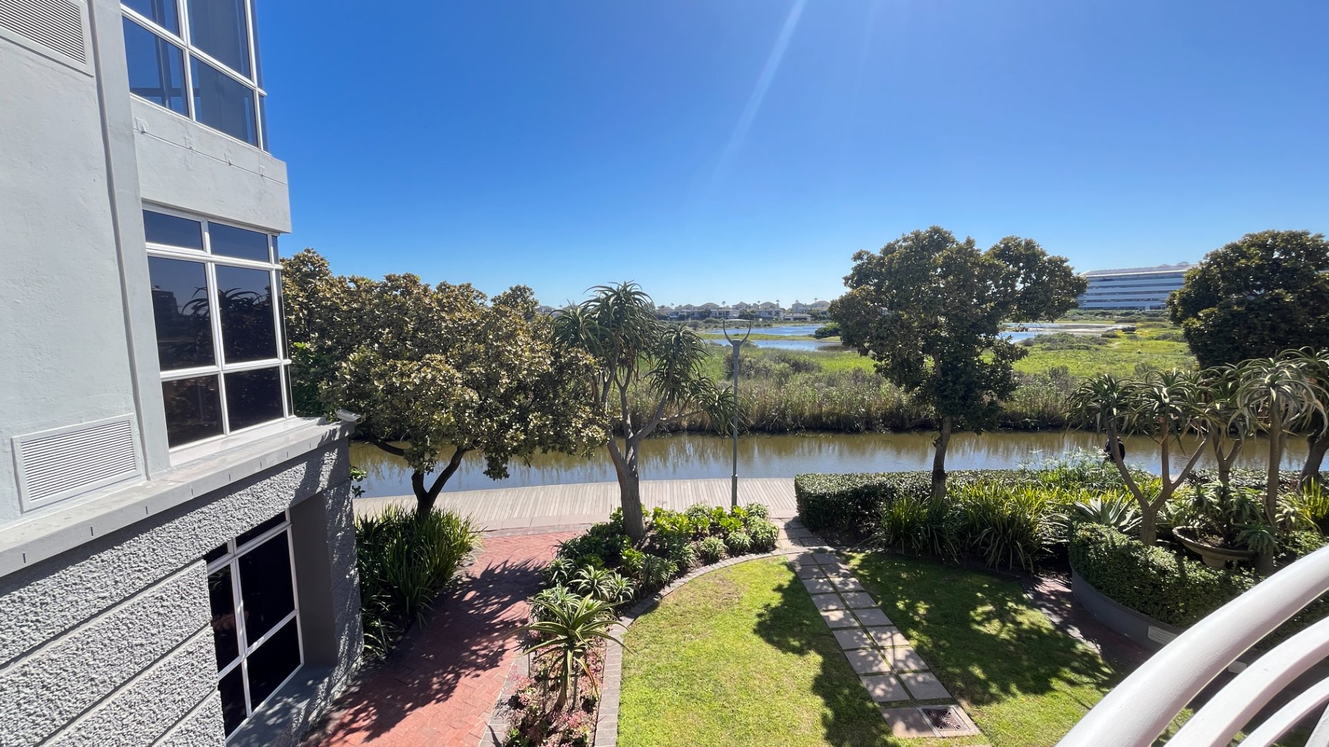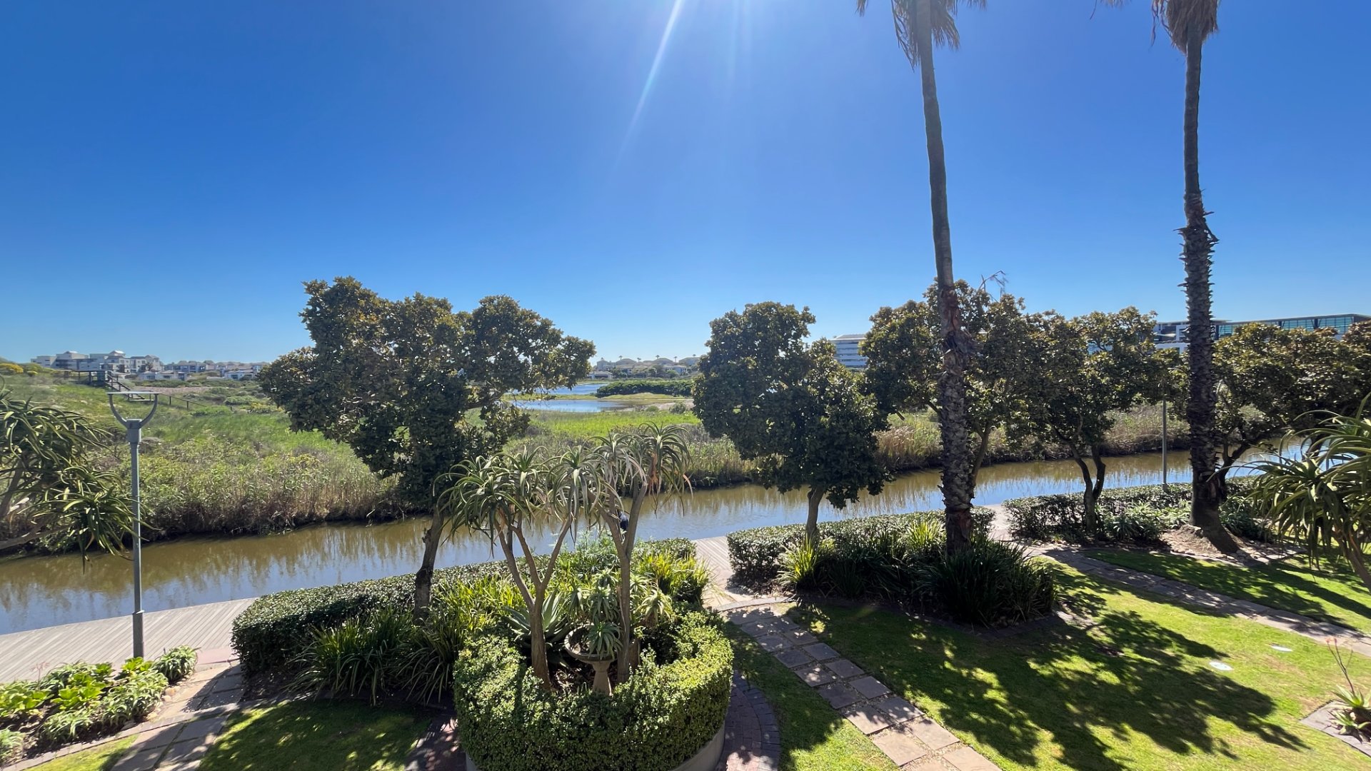 Direct access to a beautifully landscaped outdoor entertainment area with lush greenery, trees, and tranquil canal views – perfect for team gatherings and client functions