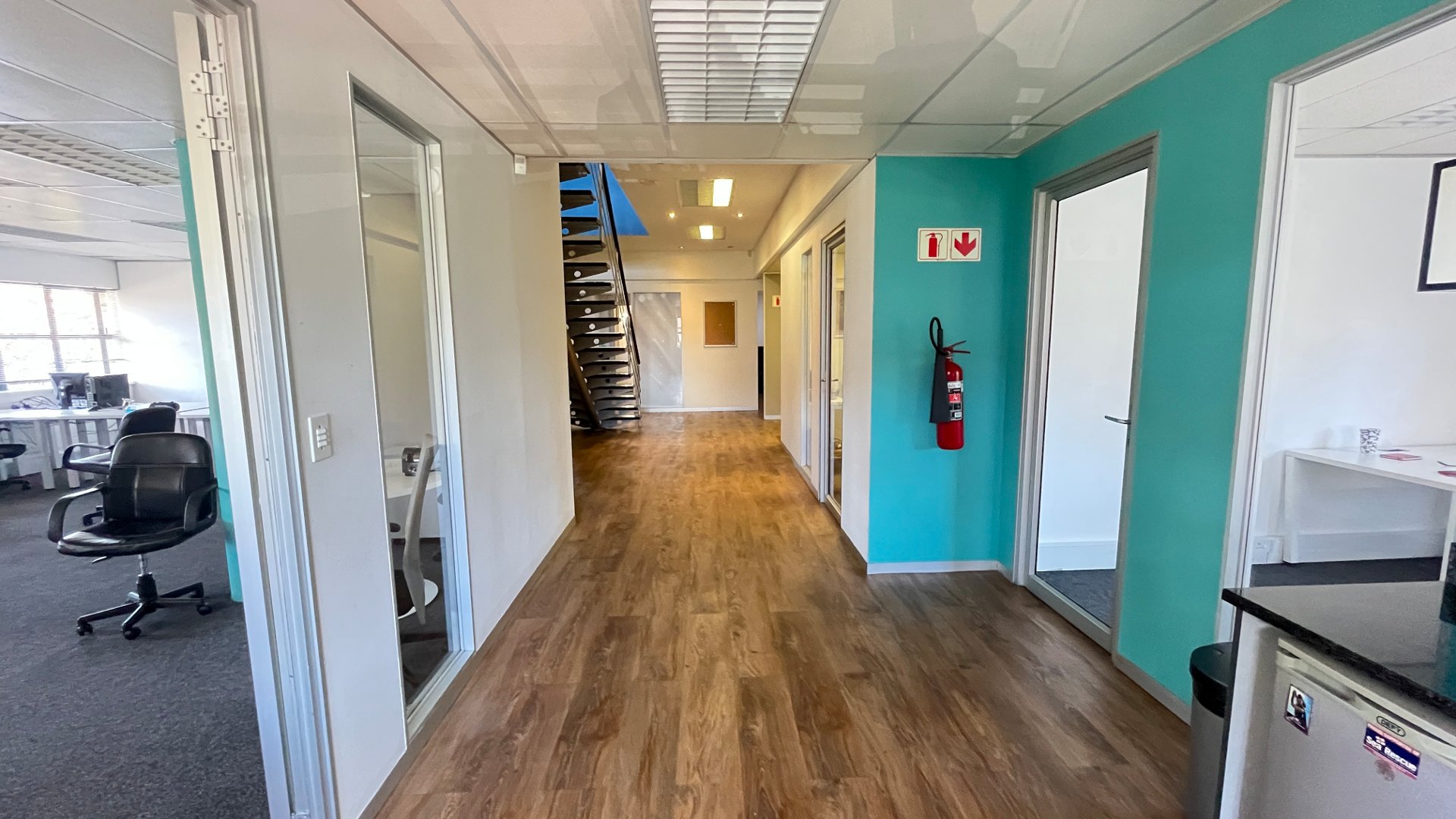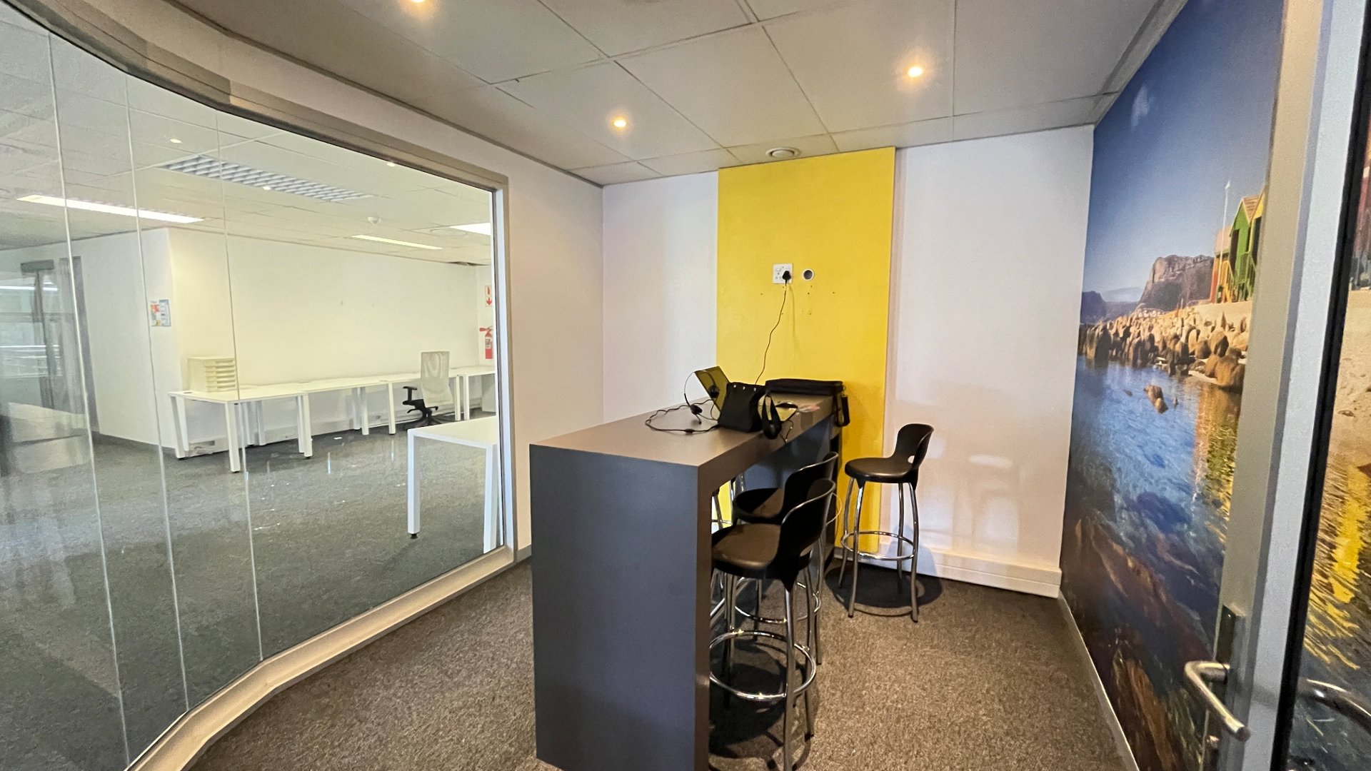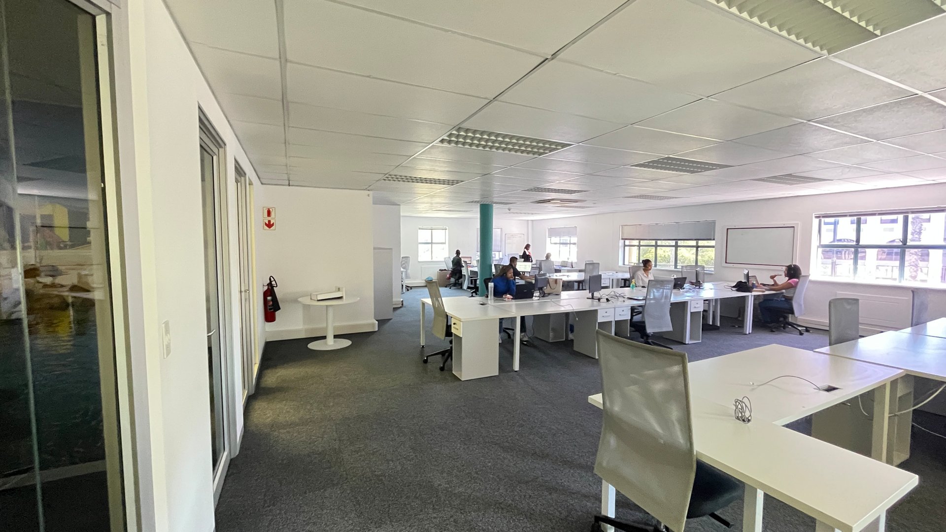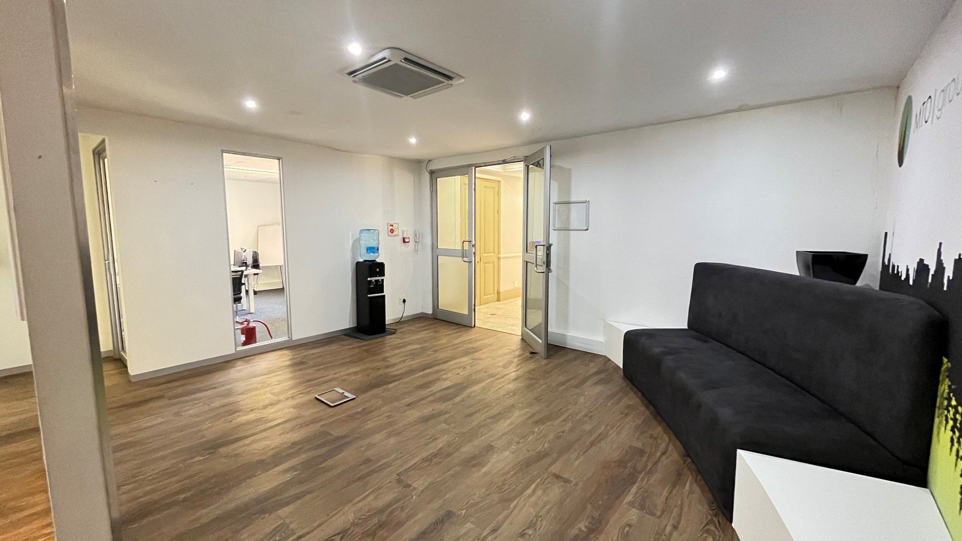 To the left of reception, the office offers multiple boardrooms and a substantial open-plan workspace suitable for 40–50 employees, complemented by a relaxed chill area.