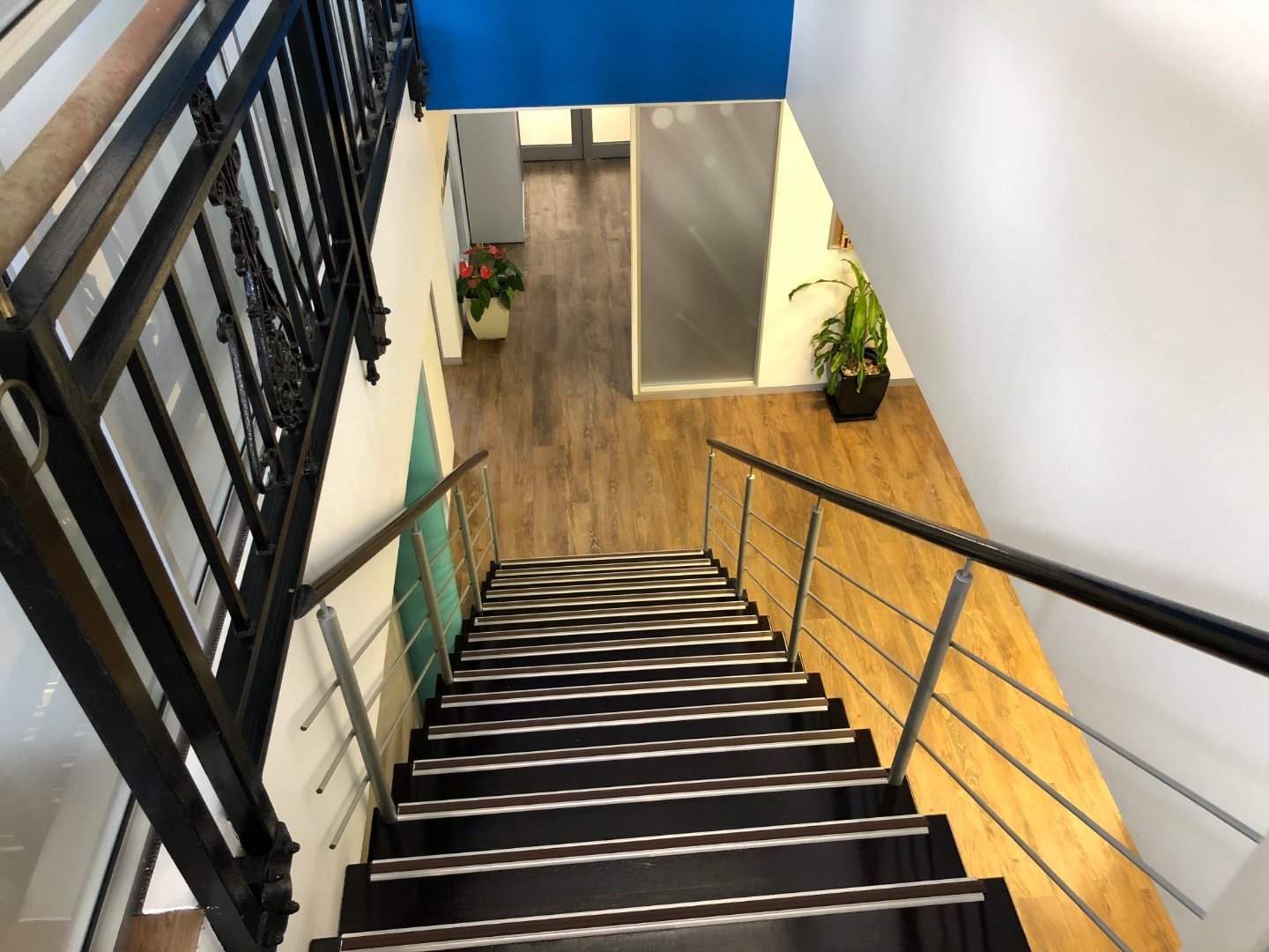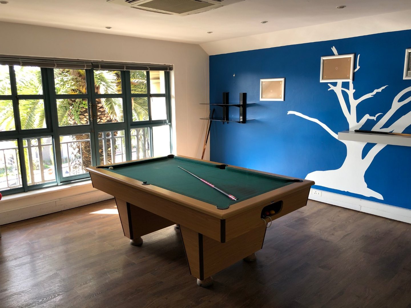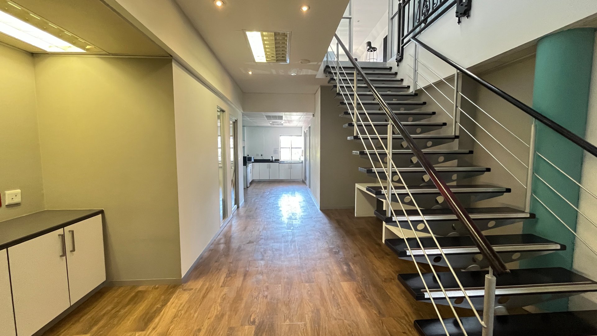 A staircase behind reception leads to a dedicated entertainment level, complete with a separate kitchen, an additional chill area, and a pool table—perfect for staff downtime and team culture.