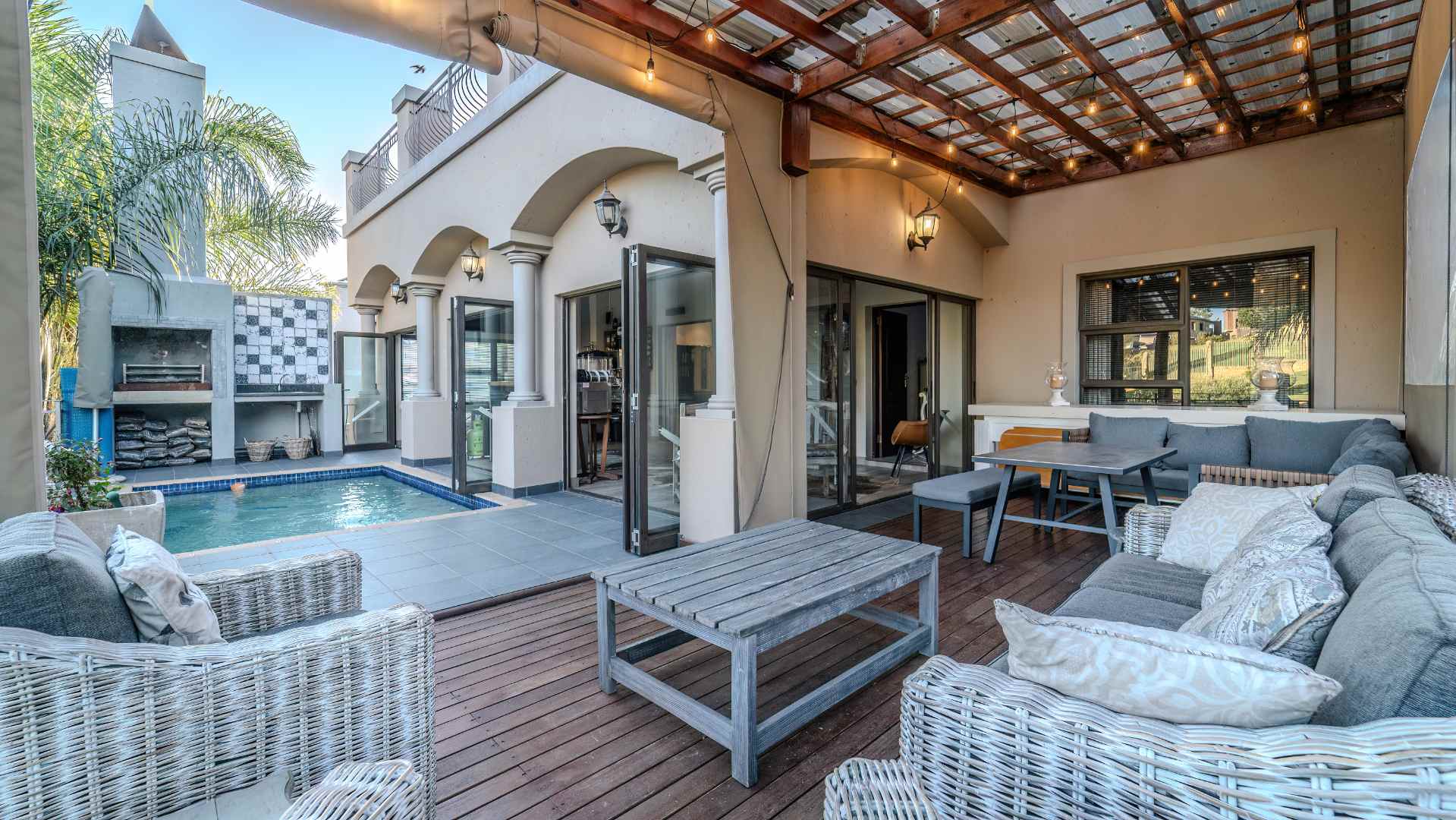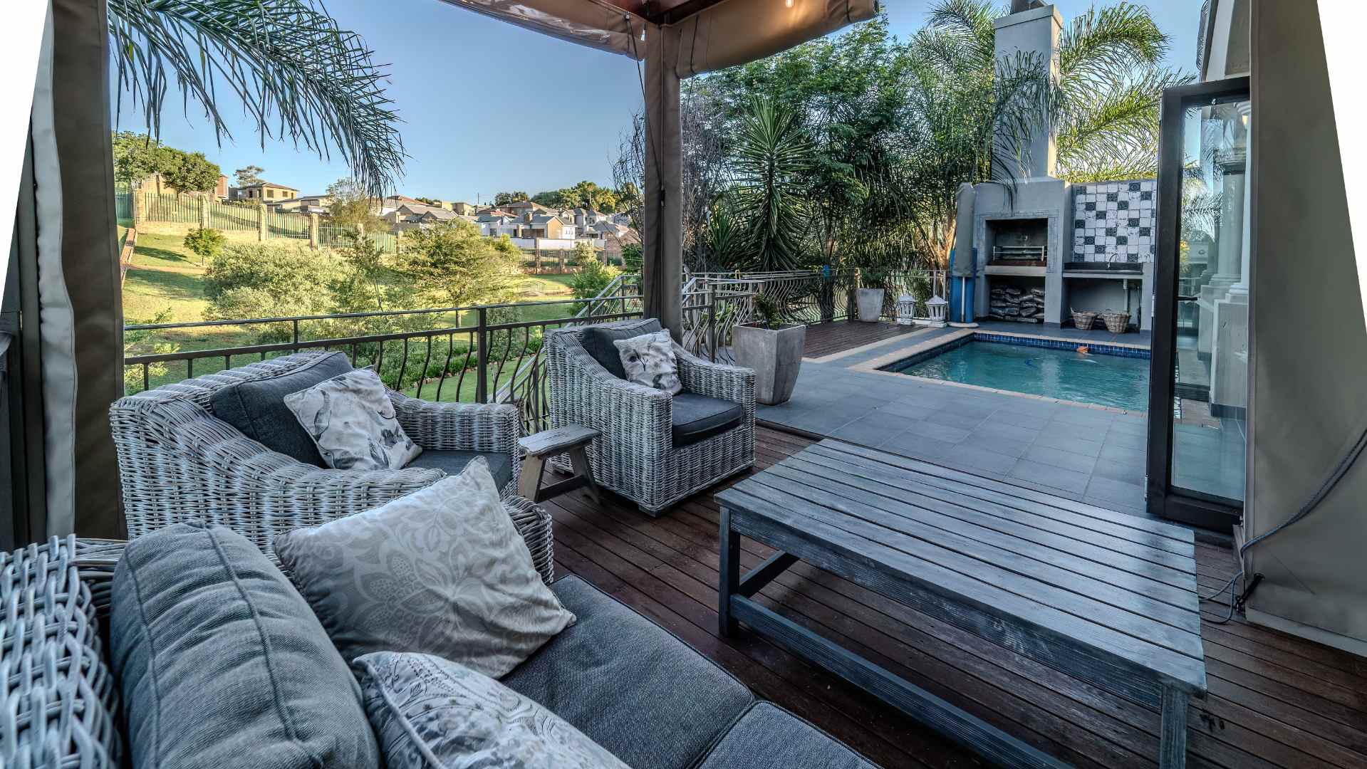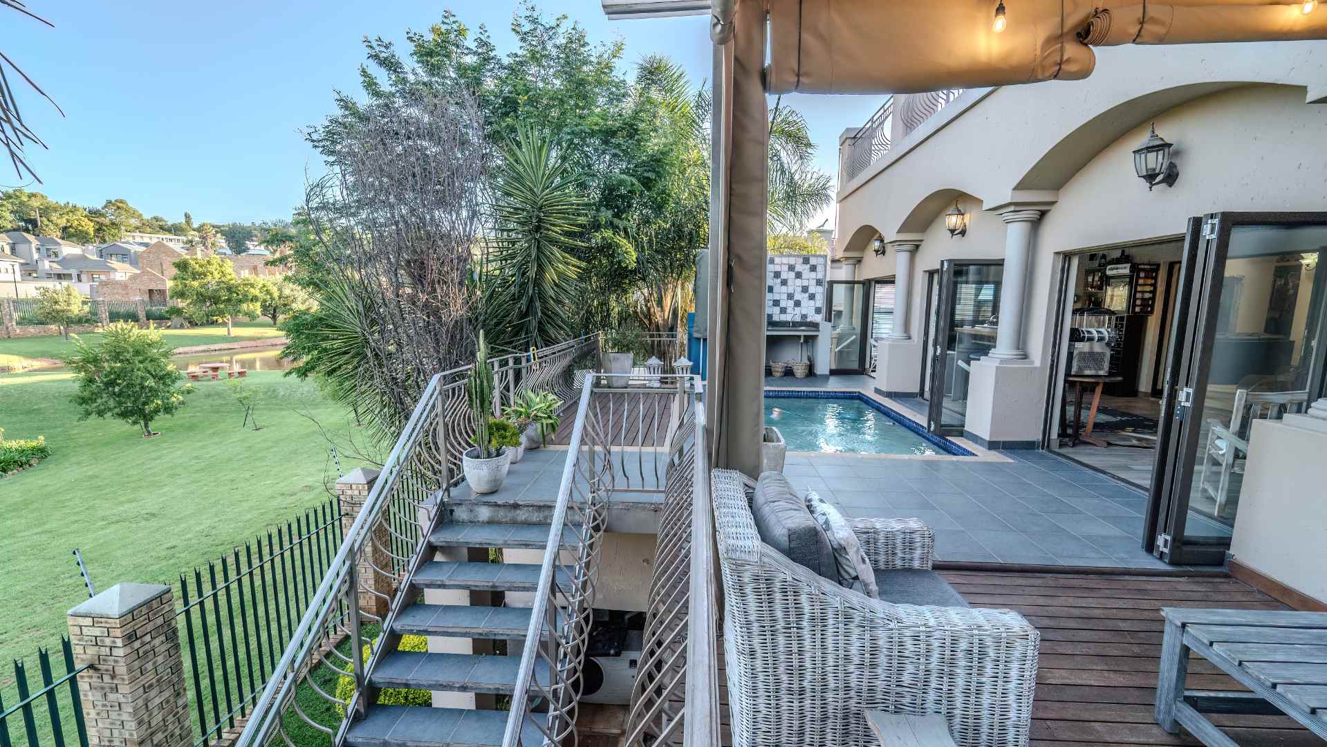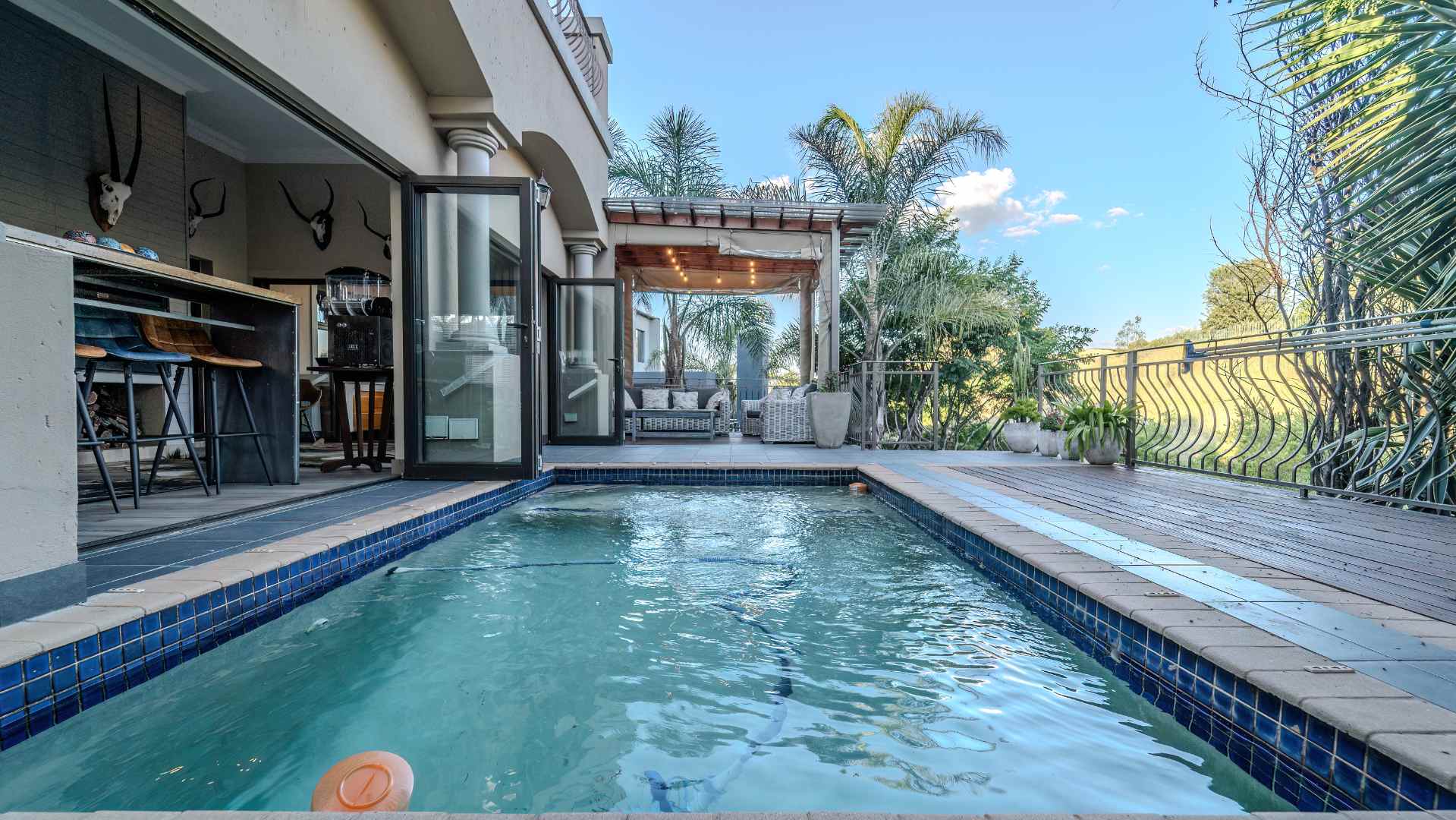 Step into a realm where the entertainment area seamlessly opens onto a veranda, treating you to panoramic views that redefine luxury. Dive into the heated swimming pool, surrounded by lush greenery, and revel in the tranquility of two enchanting fish ponds.