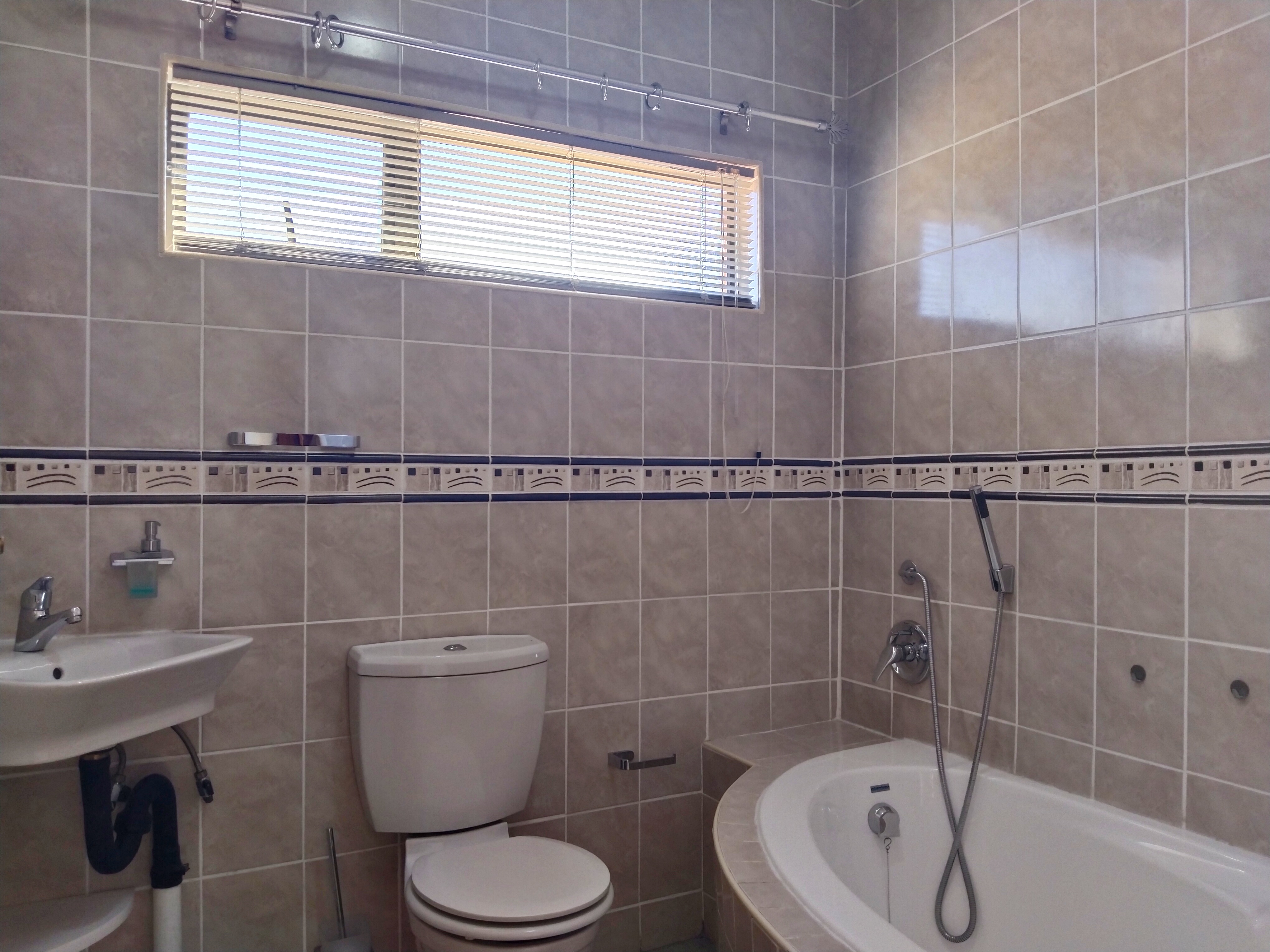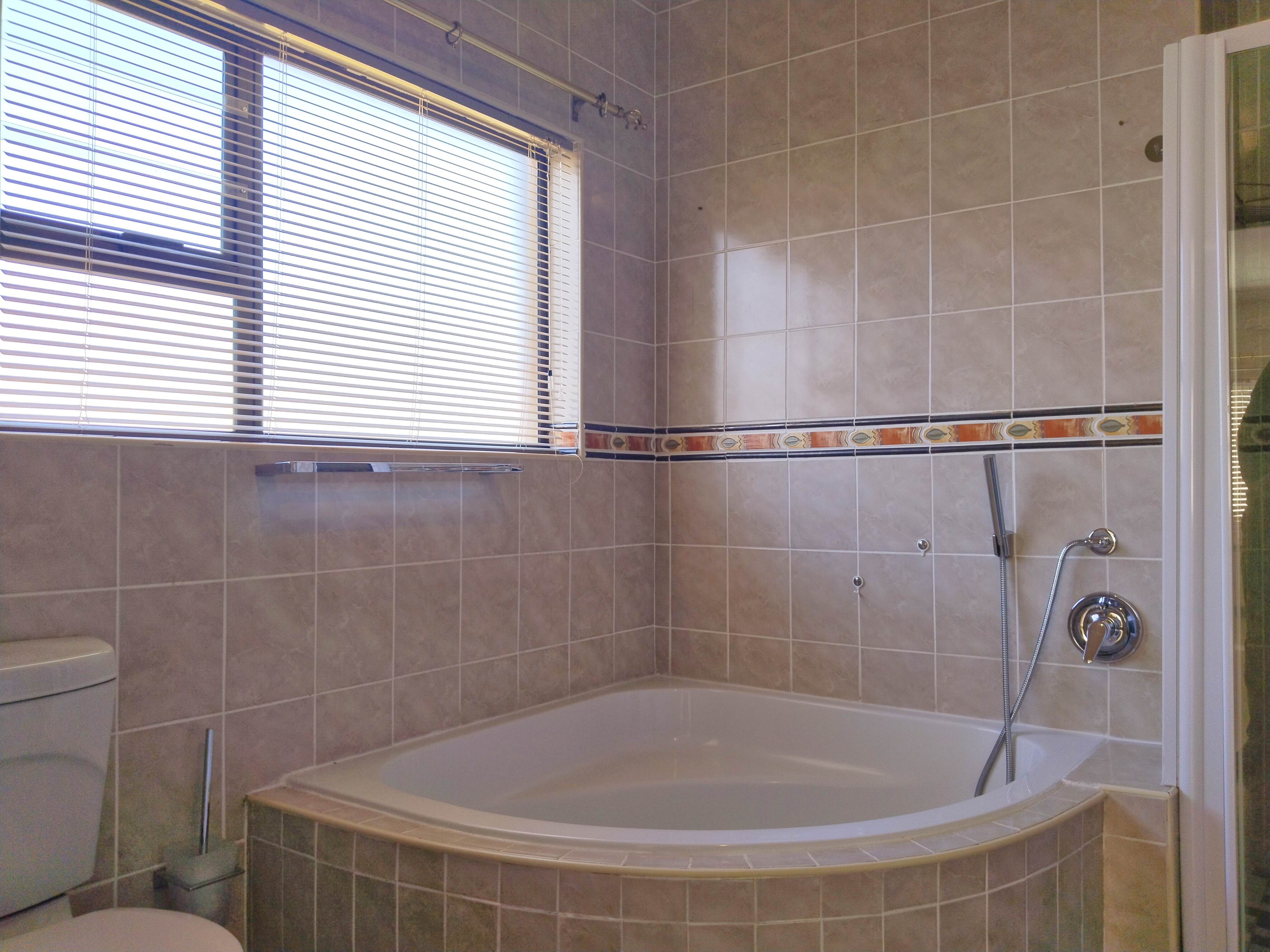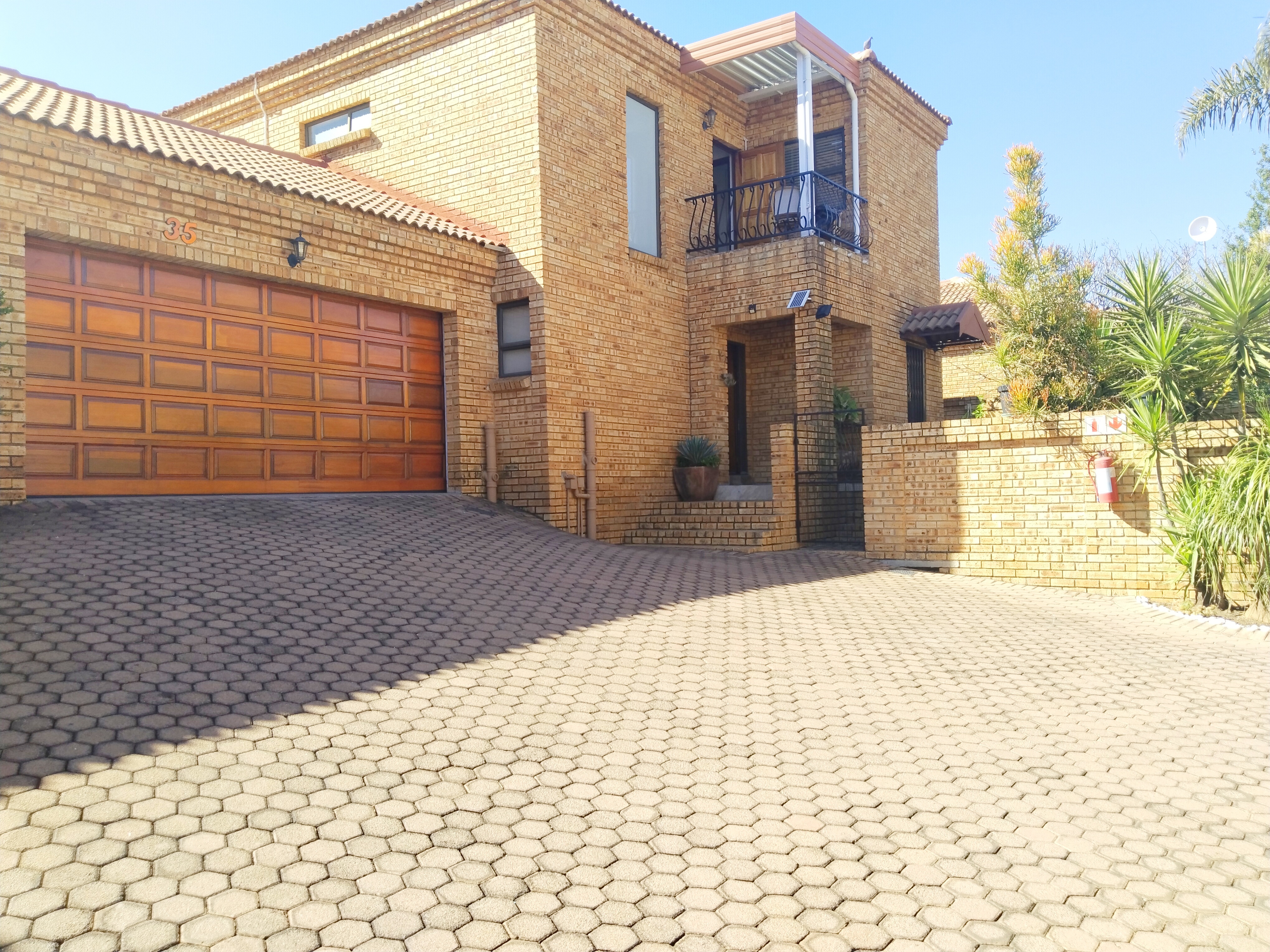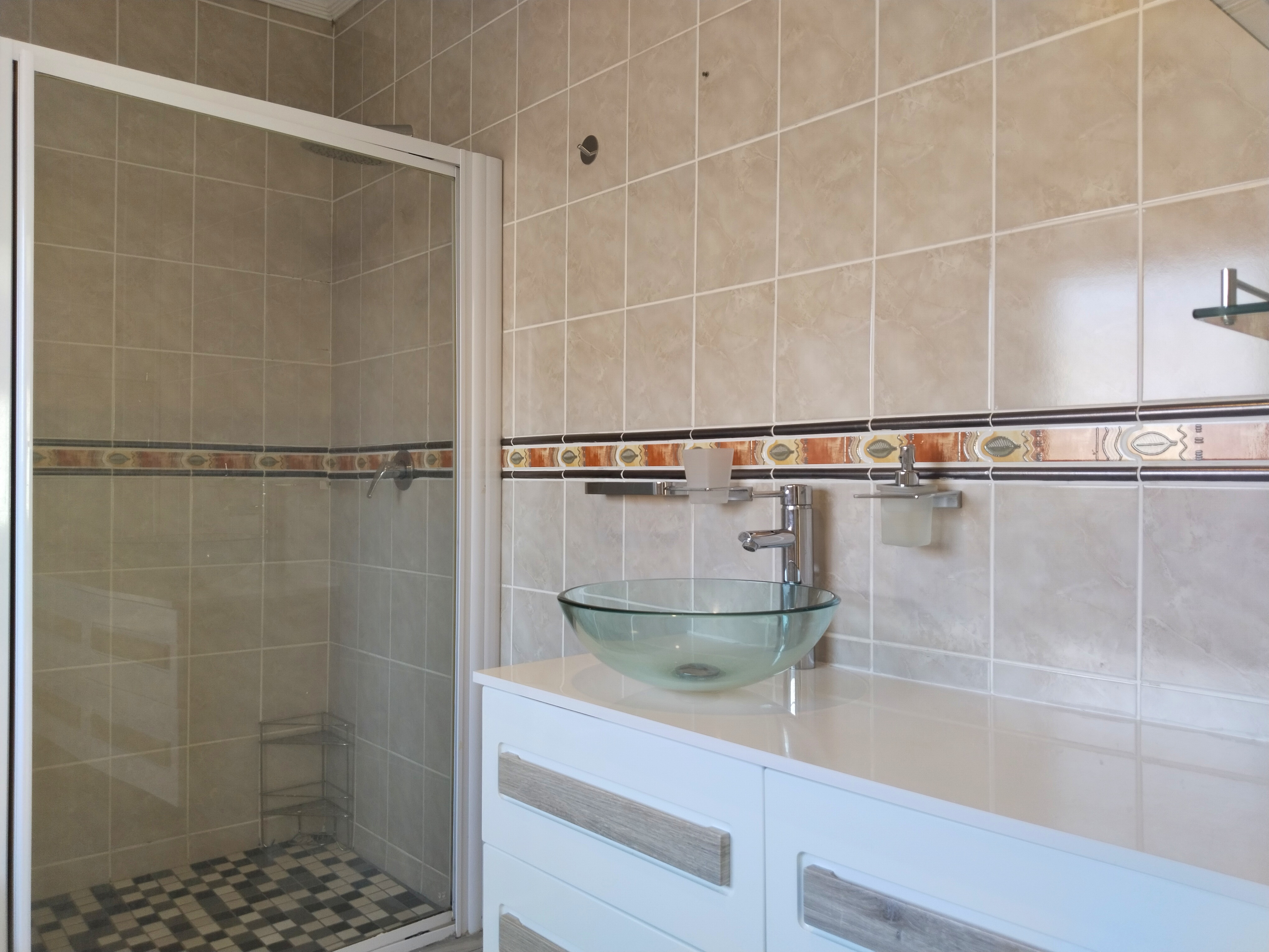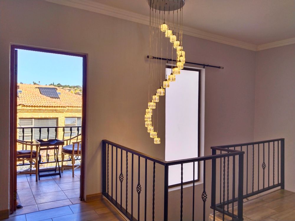 The modern kitchen offers ample built-in cupboards, a wine rack, and a separate scullery with space for a washing machine and dishwasher. A striking chandelier lights up the staircase leading to the upper level, where you’ll find three generously sized bedrooms. The main bedroom includes an en-suite bathroom with heated lights and extra cupboards, while the second bathroom has a bath, hand shower, toilet, and basin.