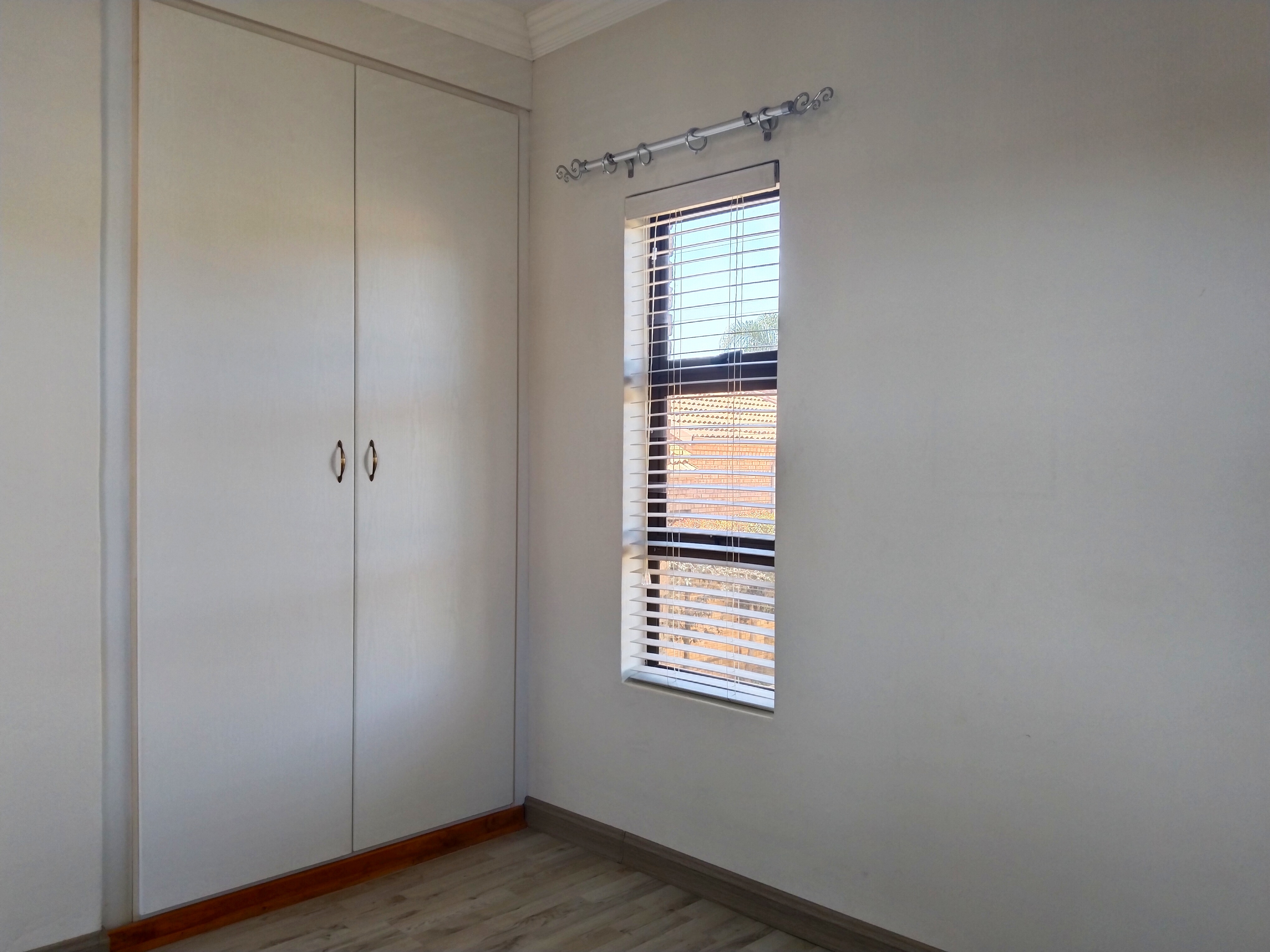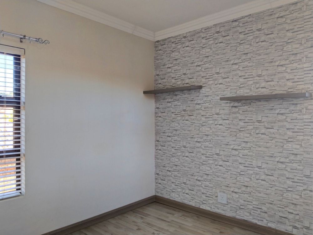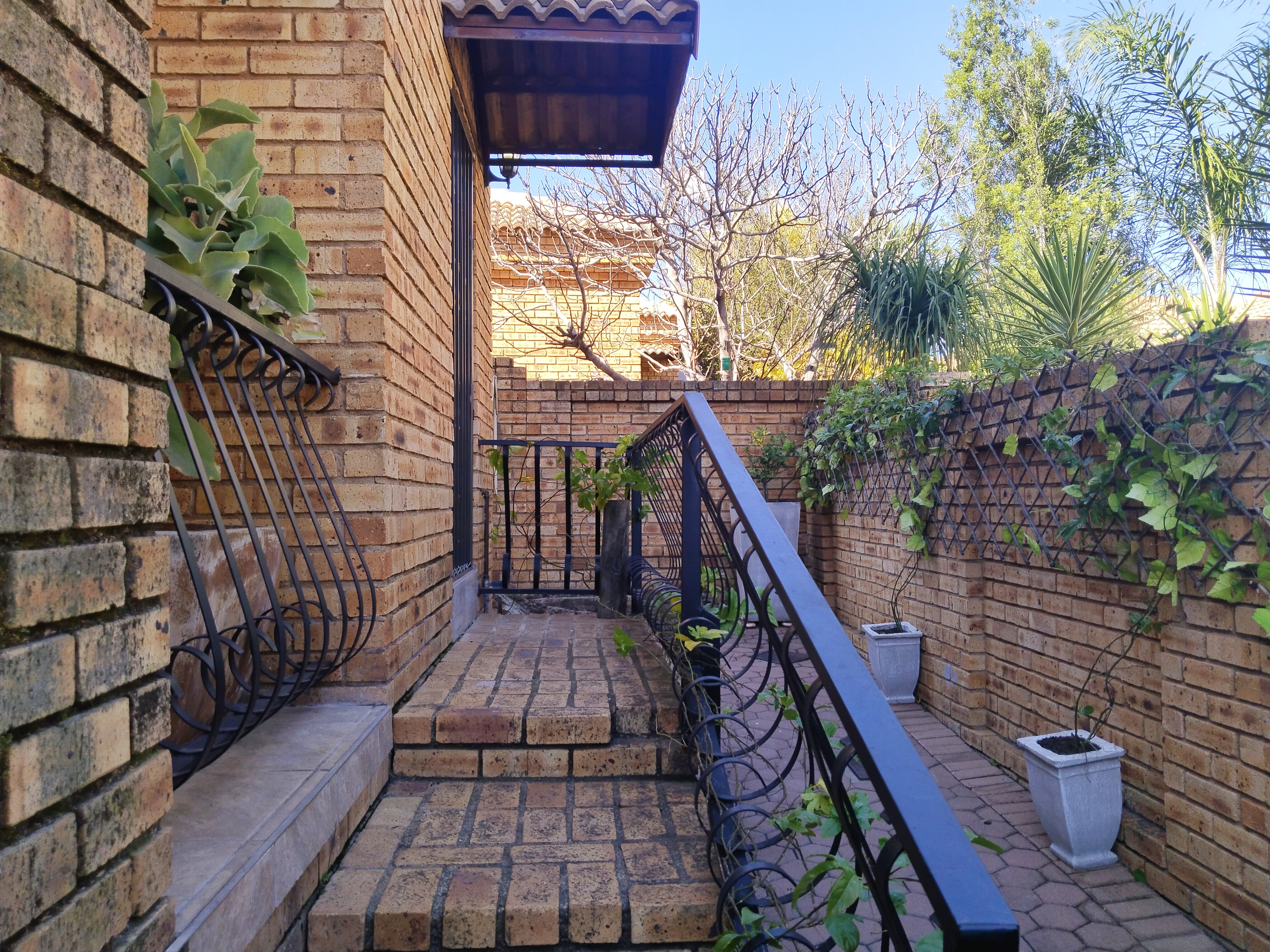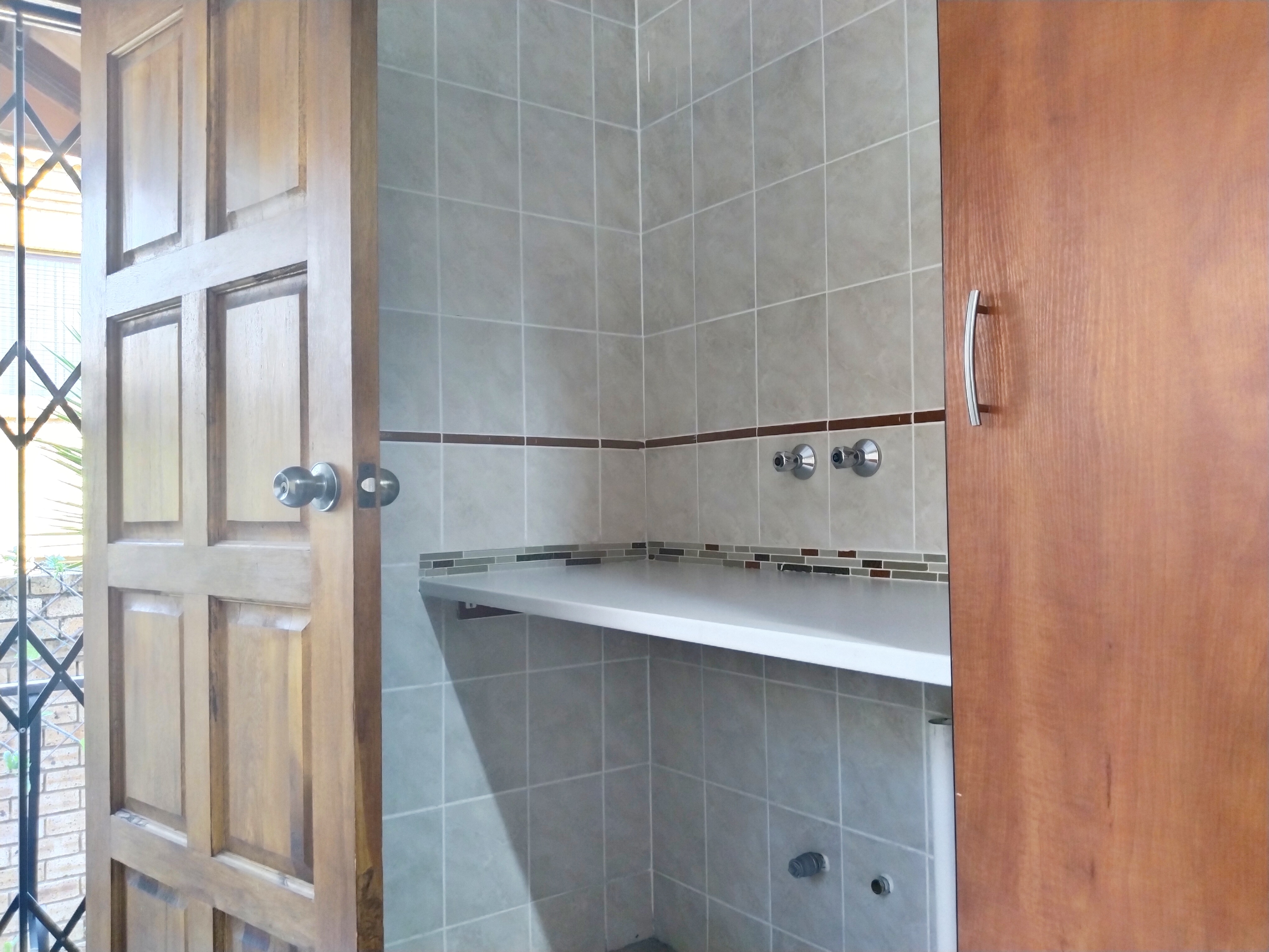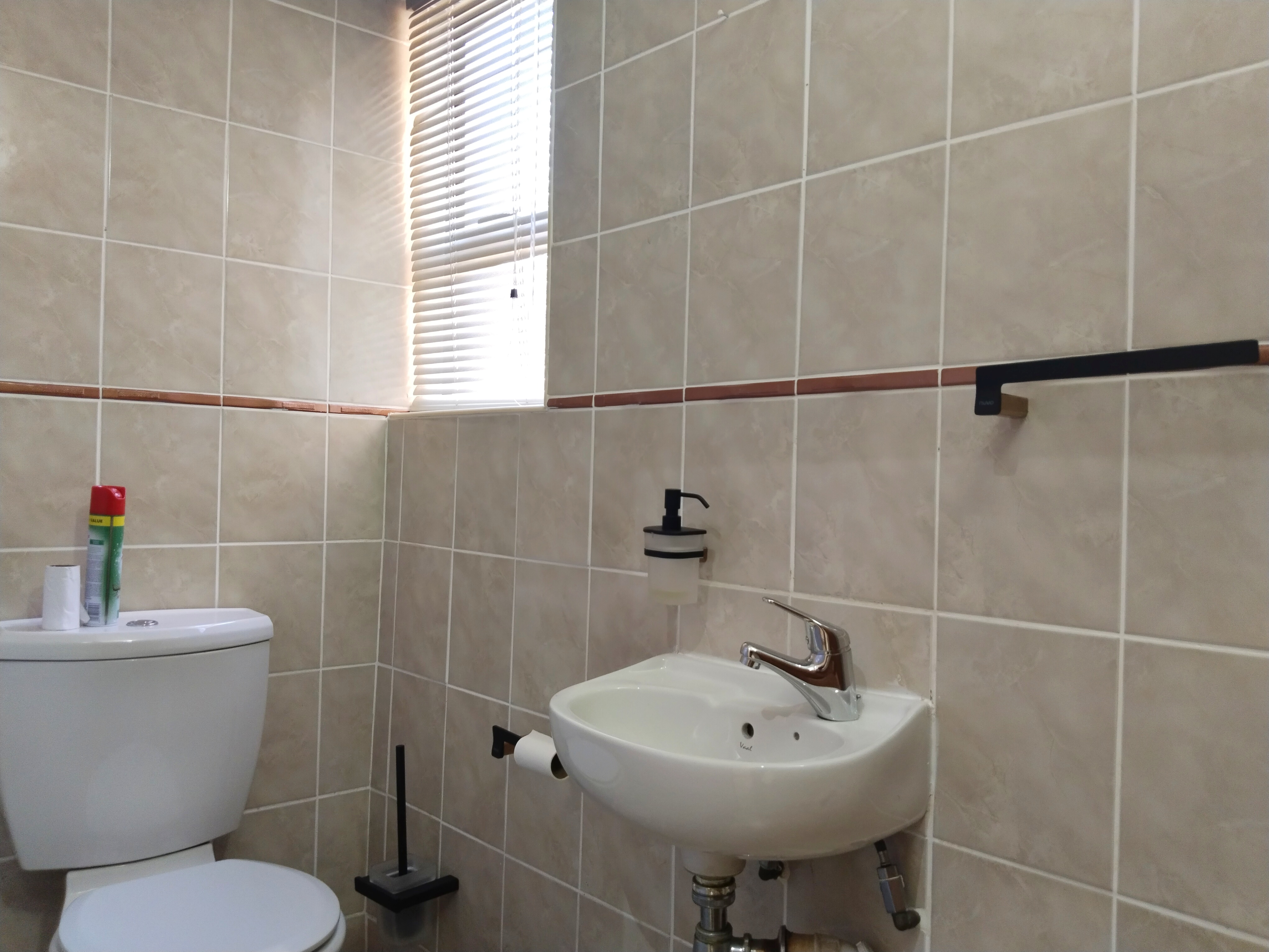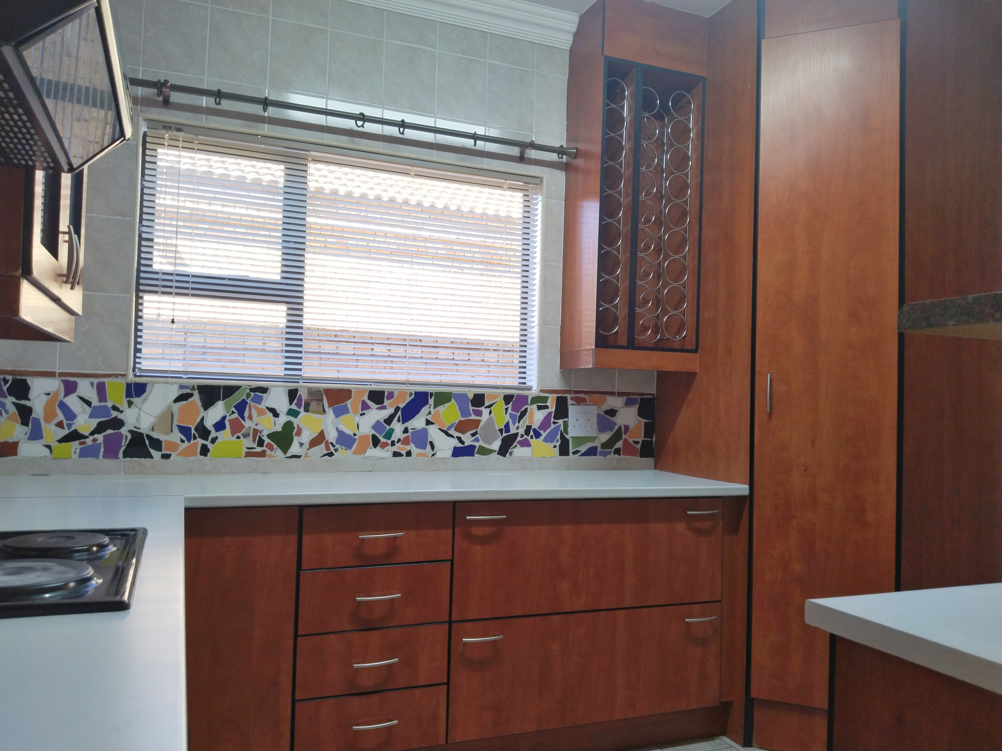 The modern kitchen offers ample built-in cupboards, a wine rack, and a separate scullery with space for a washing machine and dishwasher. A striking chandelier lights up the staircase leading to the upper level, where you’ll find three generously sized bedrooms. The main bedroom includes an en-suite bathroom with heated lights and extra cupboards, while the second bathroom has a bath, hand shower, toilet, and basin.