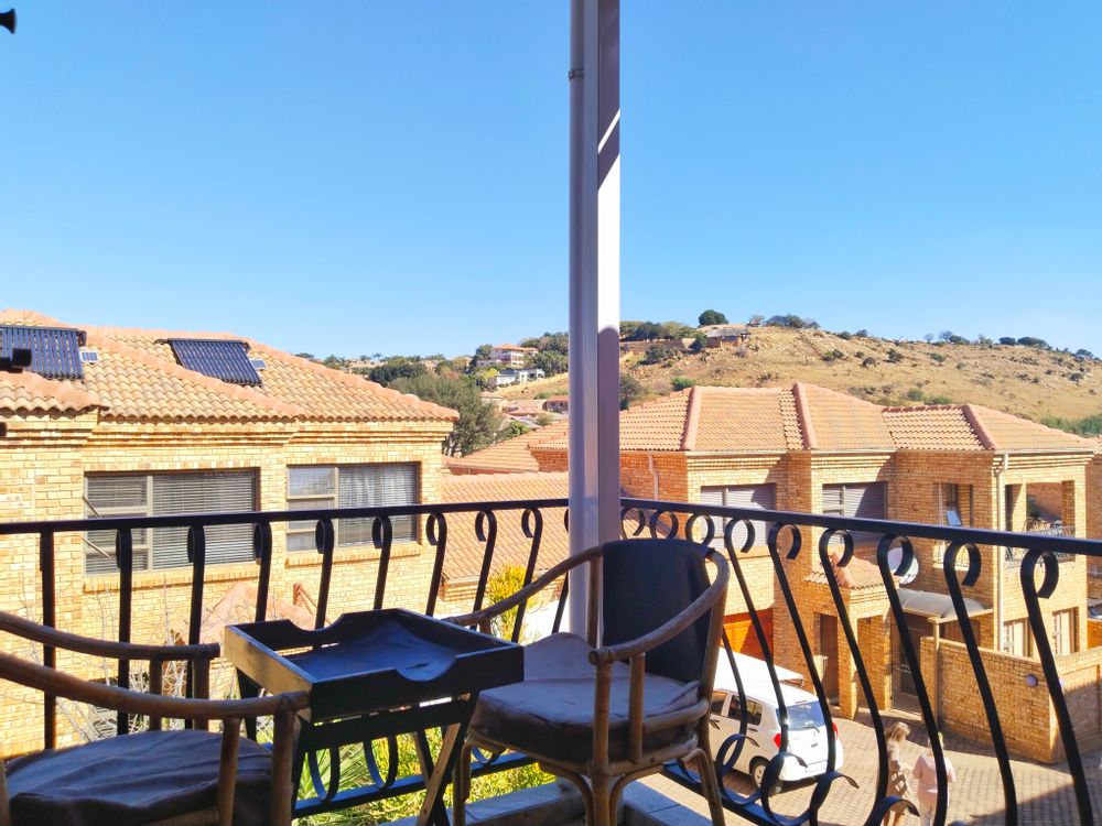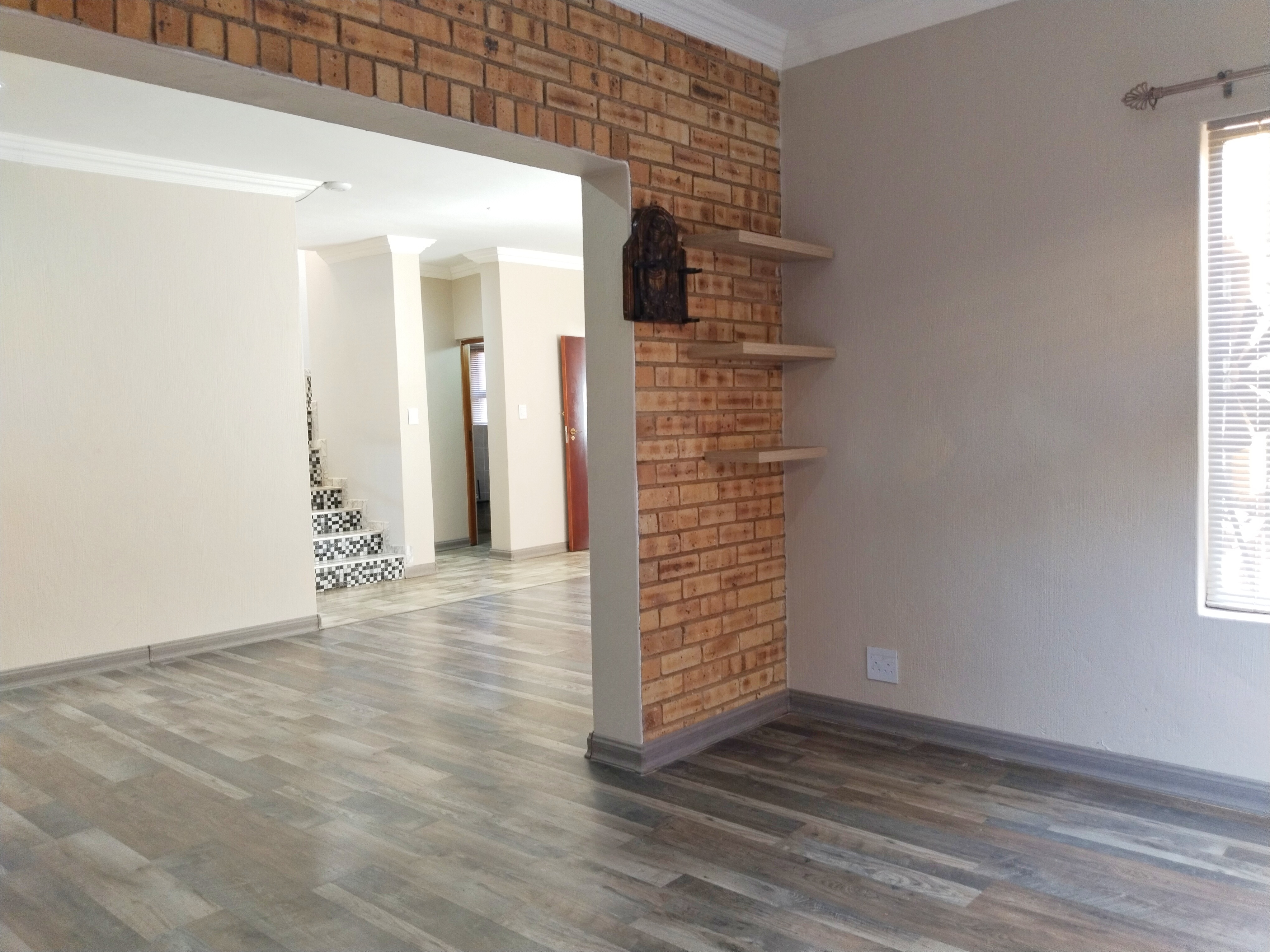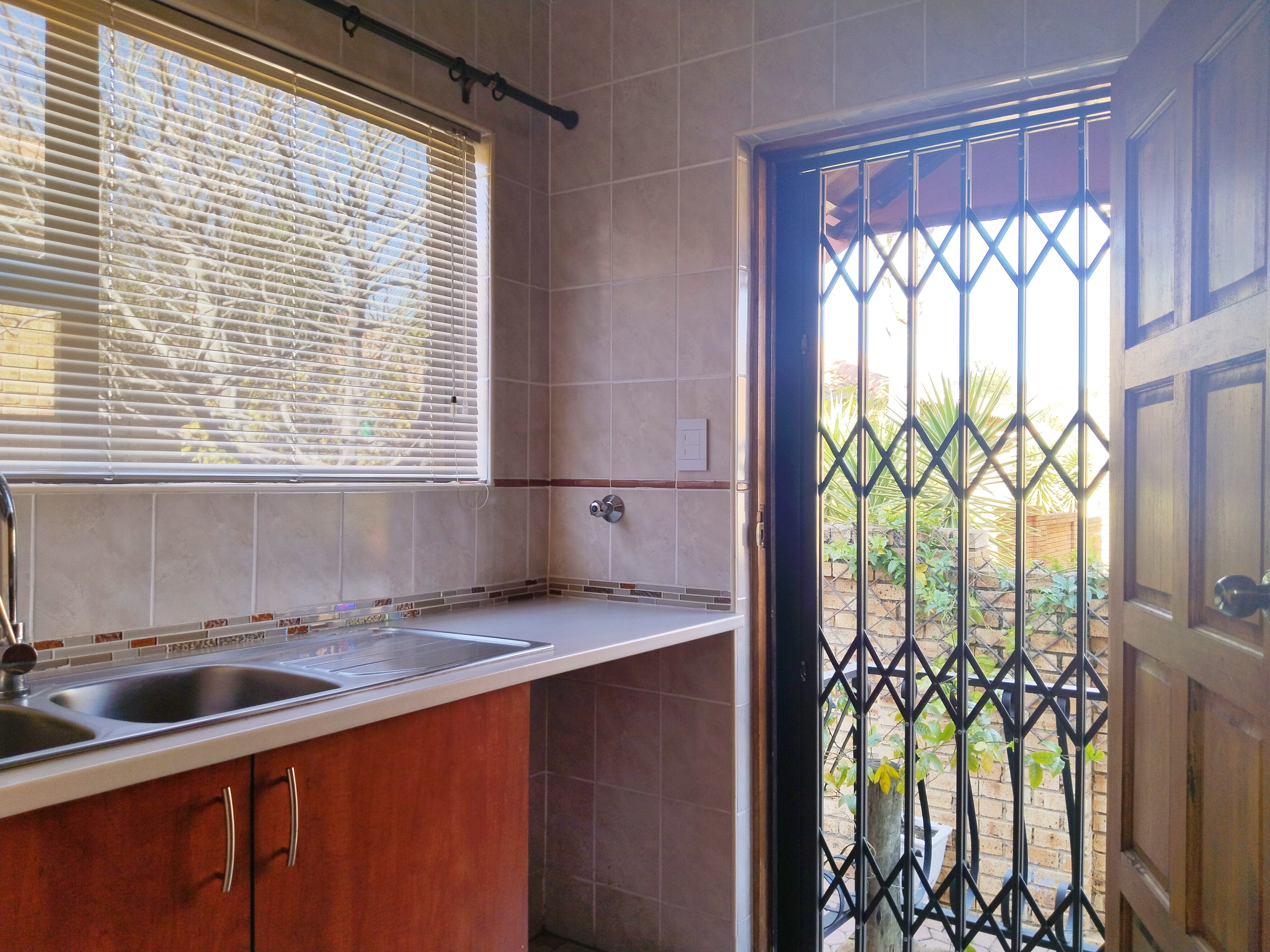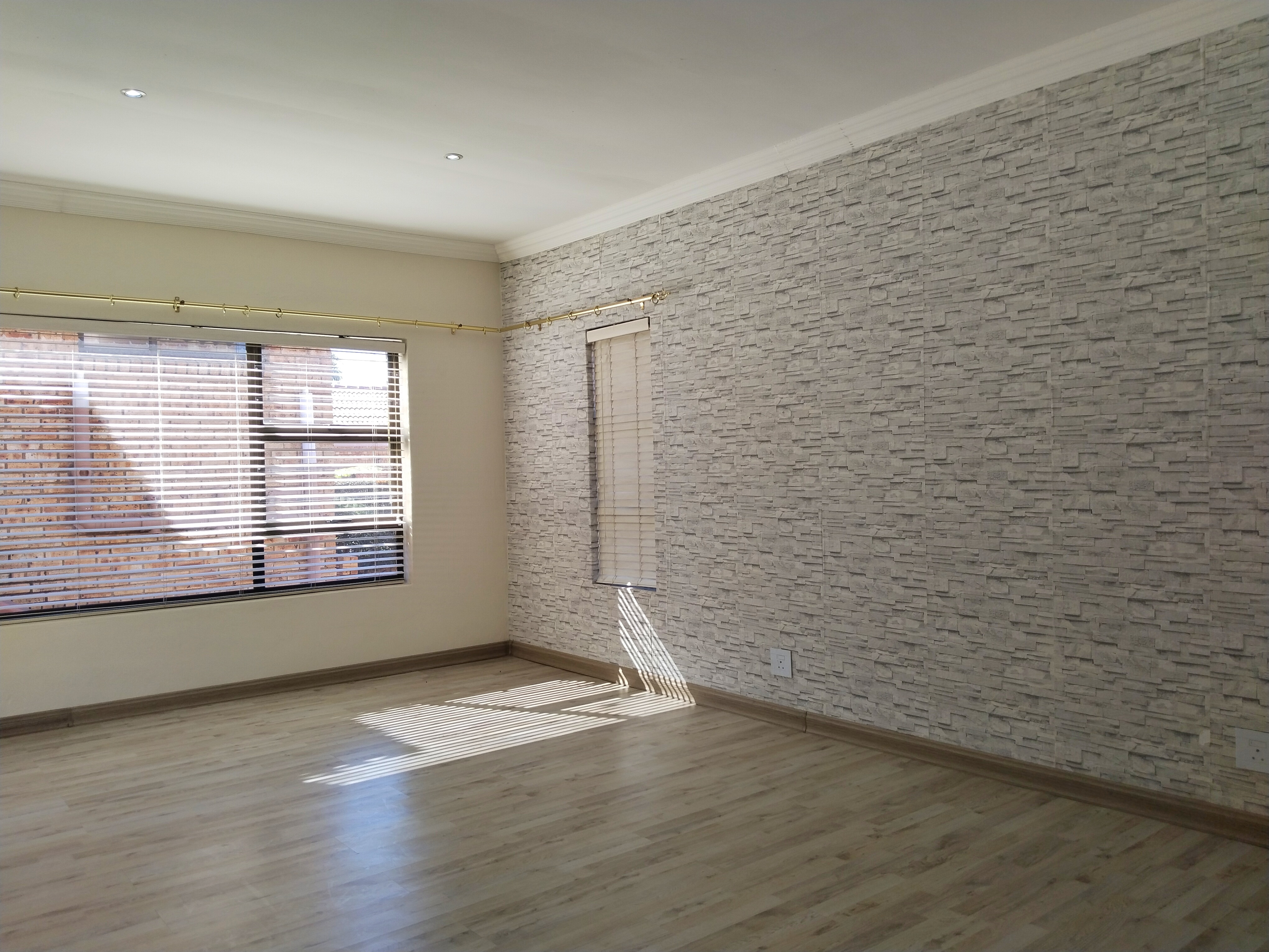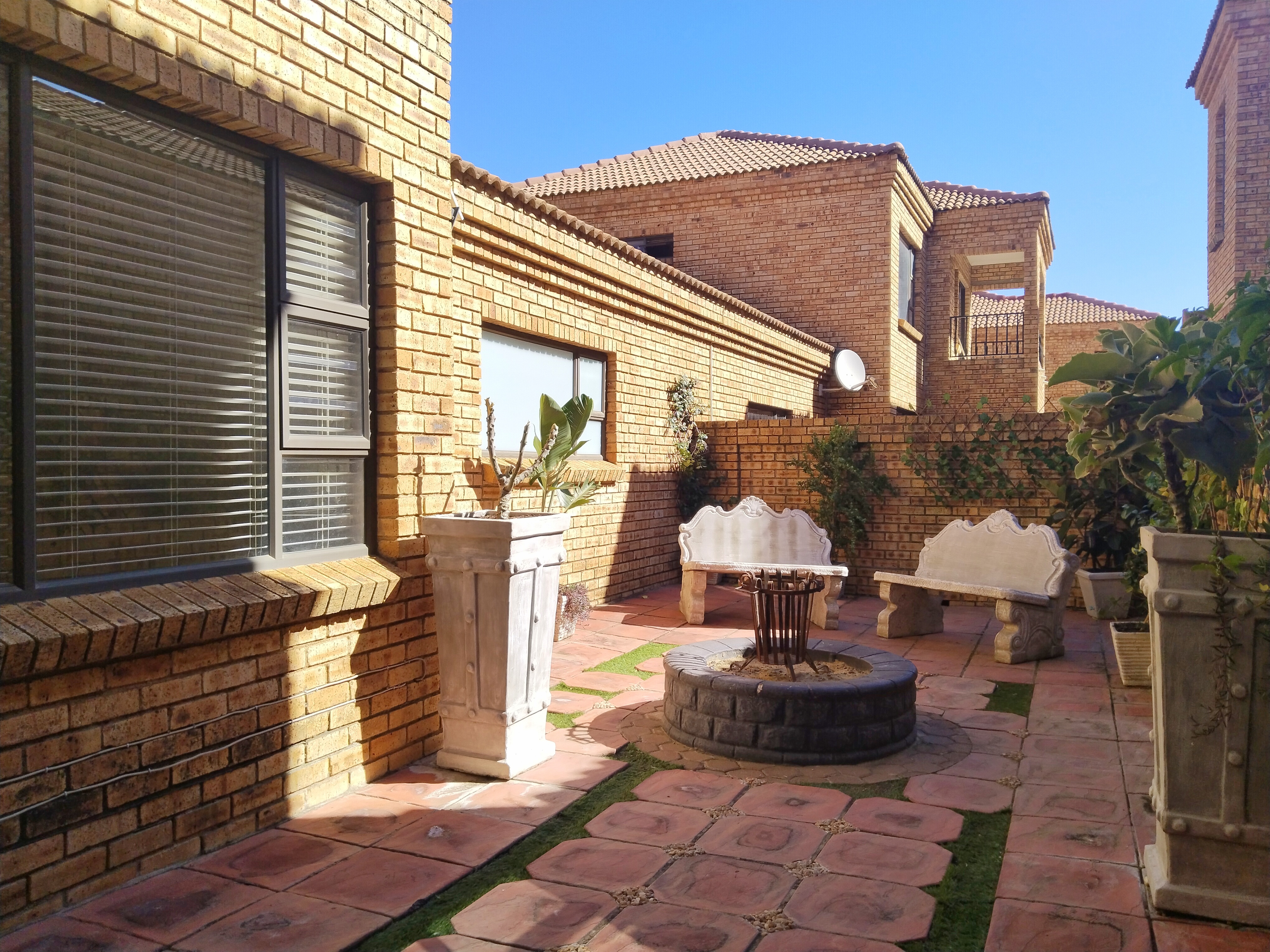 The modern kitchen offers ample built-in cupboards, a wine rack, and a separate scullery with space for a washing machine and dishwasher. A striking chandelier lights up the staircase leading to the upper level, where you’ll find three generously sized bedrooms. The main bedroom includes an en-suite bathroom with heated lights and extra cupboards, while the second bathroom has a bath, hand shower, toilet, and basin.