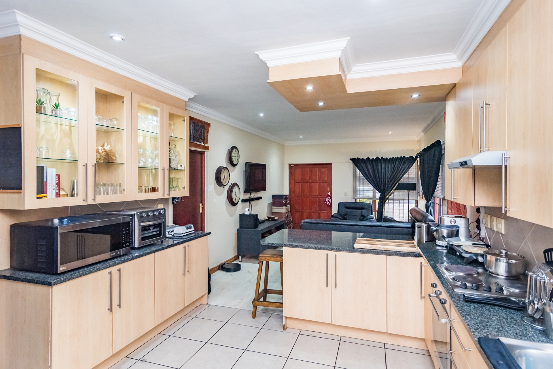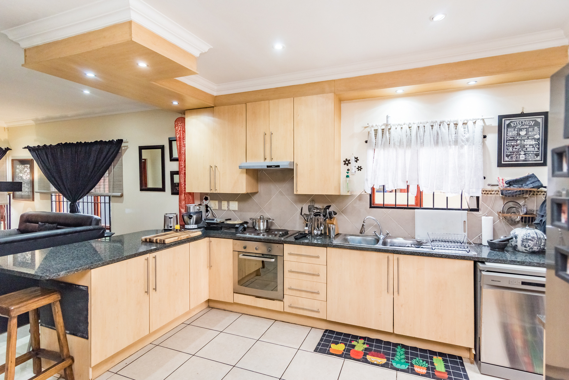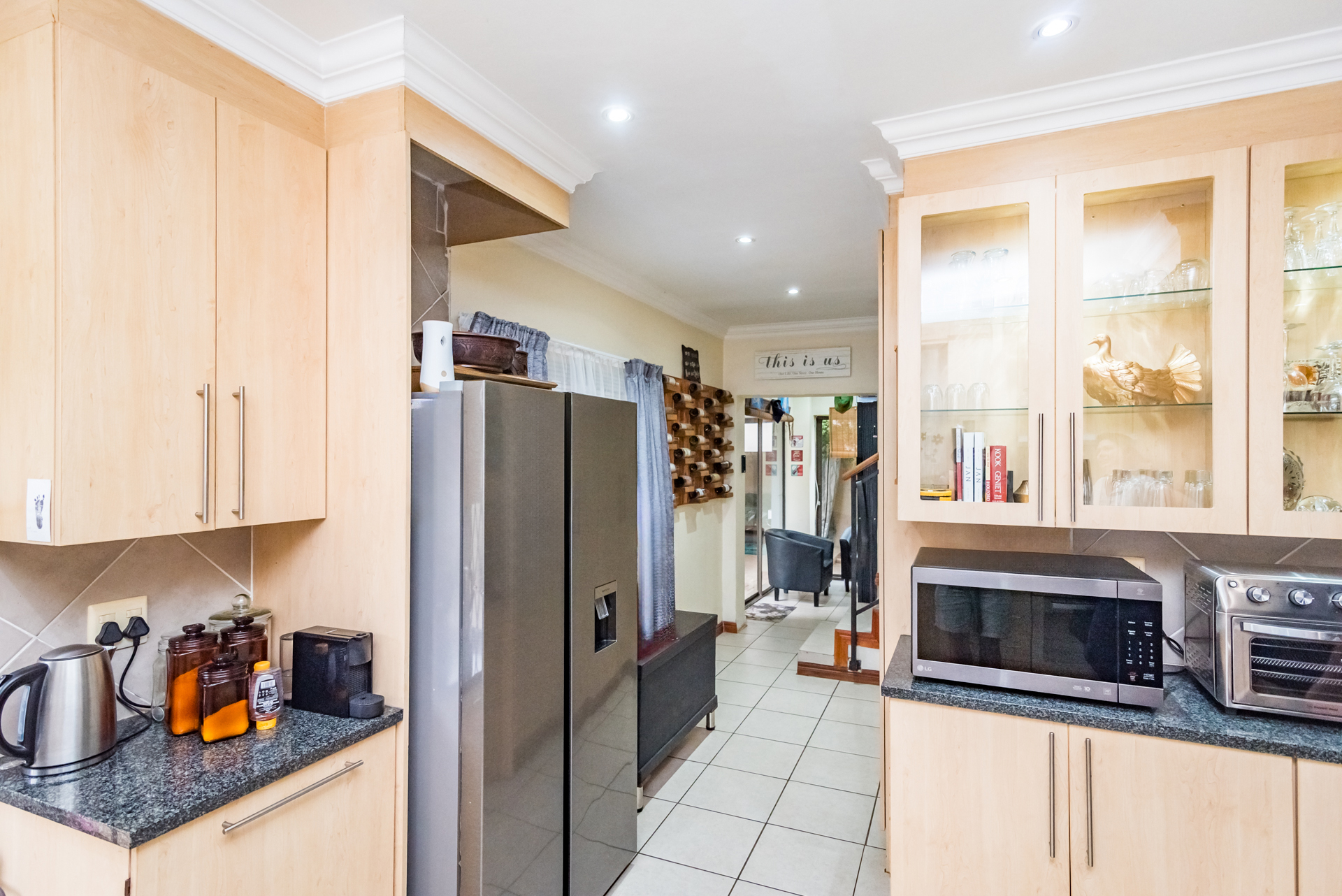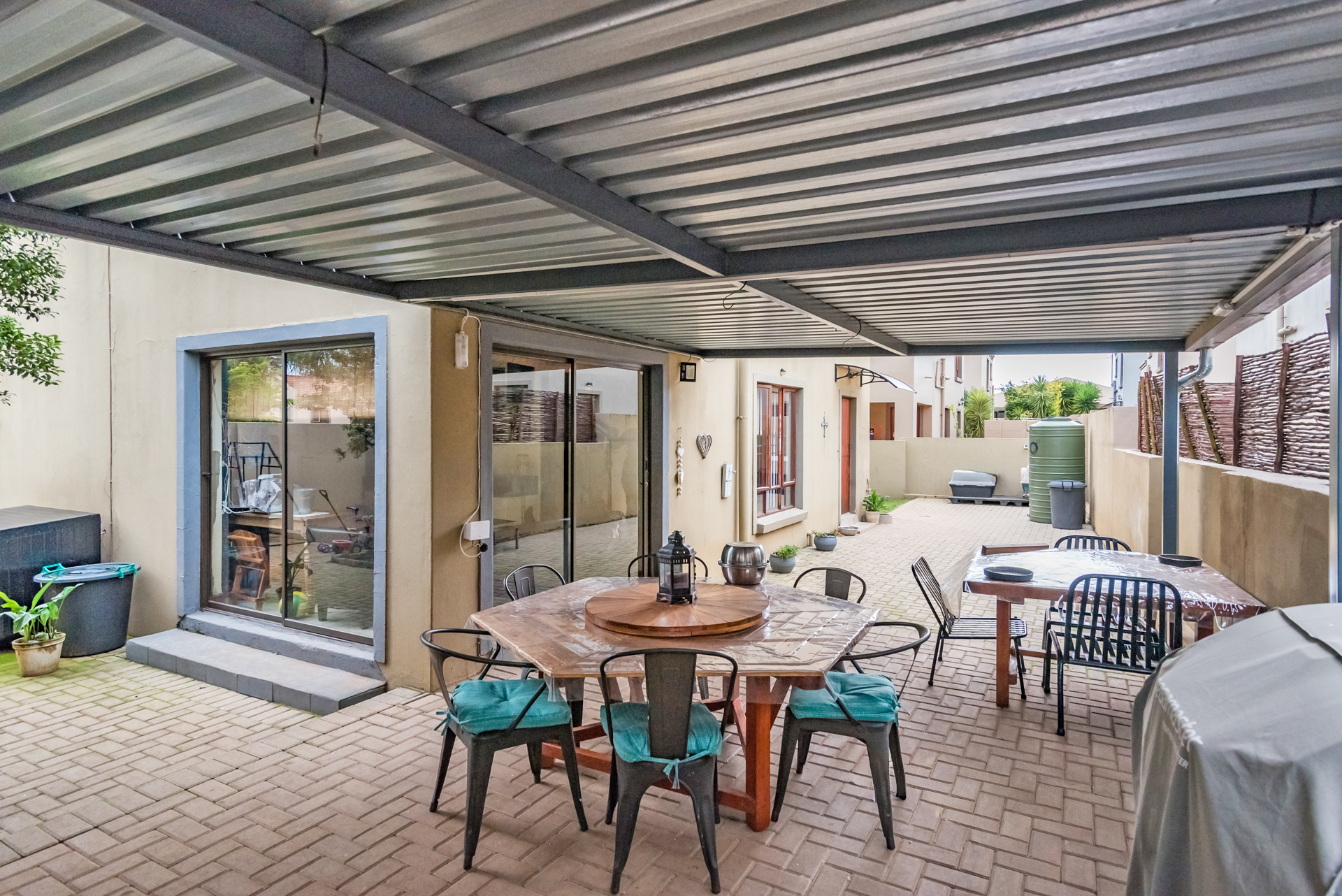 The stylish, contemporary kitchen is well-appointed with ample built-in cupboards, a dishwasher connection, space for a double-door refrigerator, and an electric stove. The kitchen flows seamlessly into both a private courtyard and an inviting enclosed patio featuring a built-in braai—perfect for effortless entertaining with family and friends.