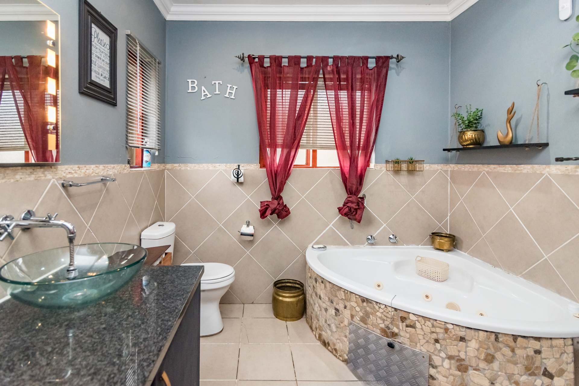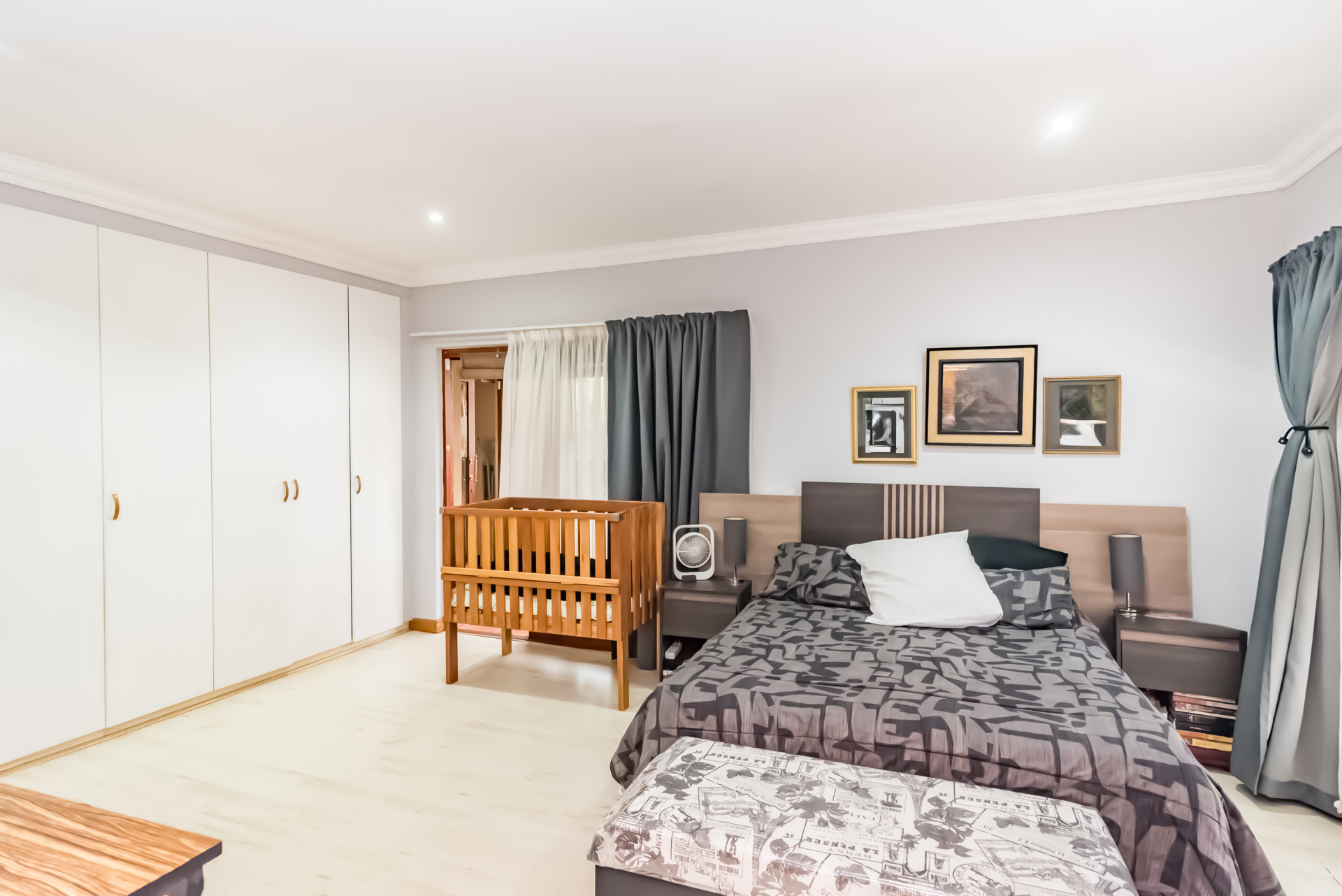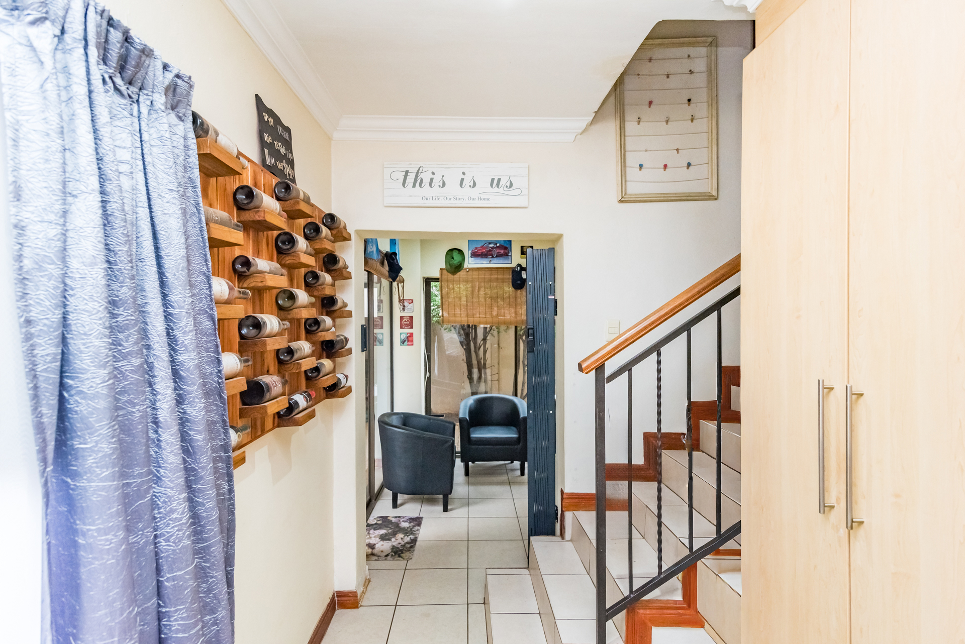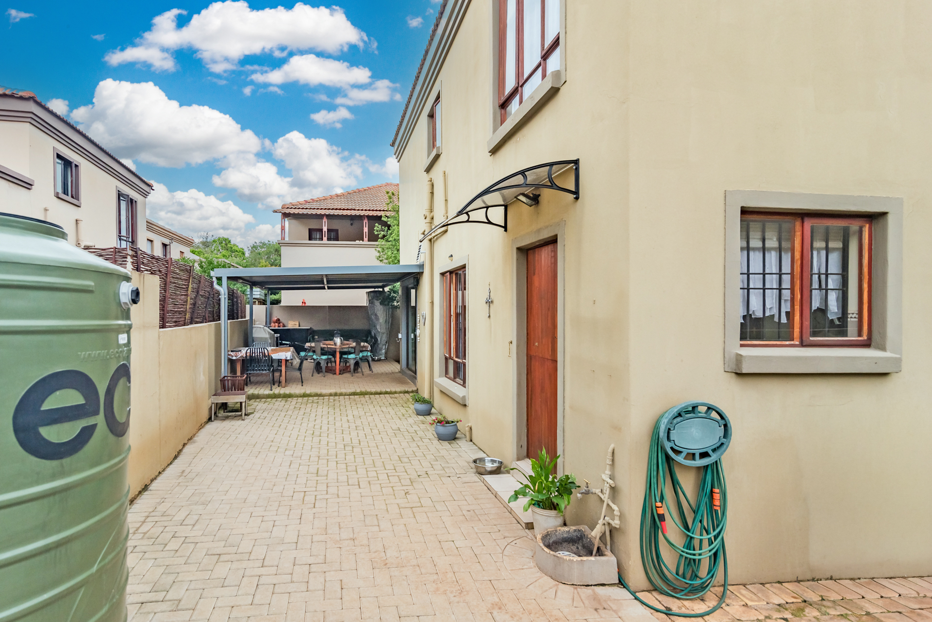 The stylish, contemporary kitchen is well-appointed with ample built-in cupboards, a dishwasher connection, space for a double-door refrigerator, and an electric stove. The kitchen flows seamlessly into both a private courtyard and an inviting enclosed patio featuring a built-in braai—perfect for effortless entertaining with family and friends.