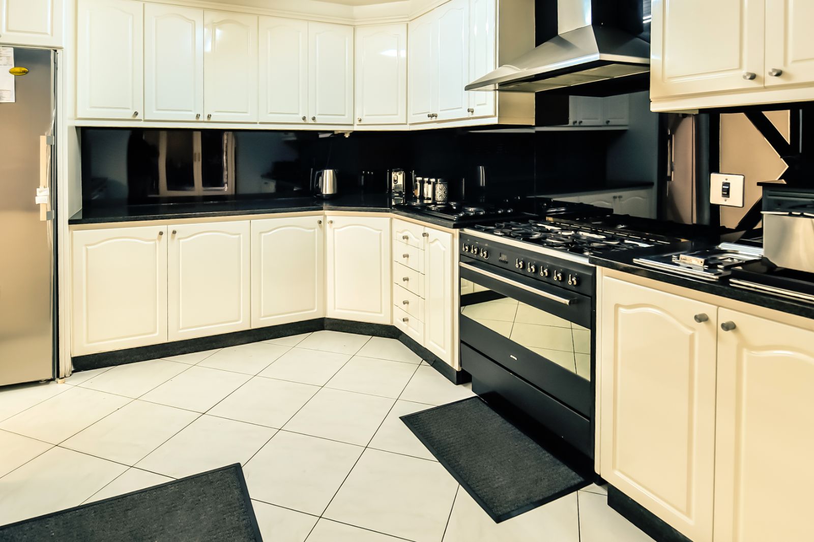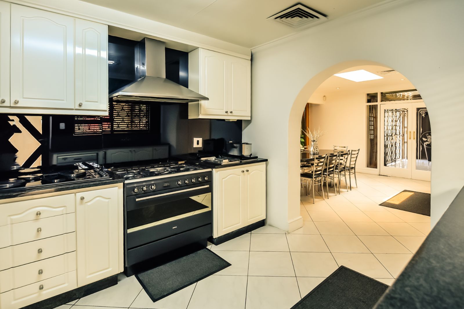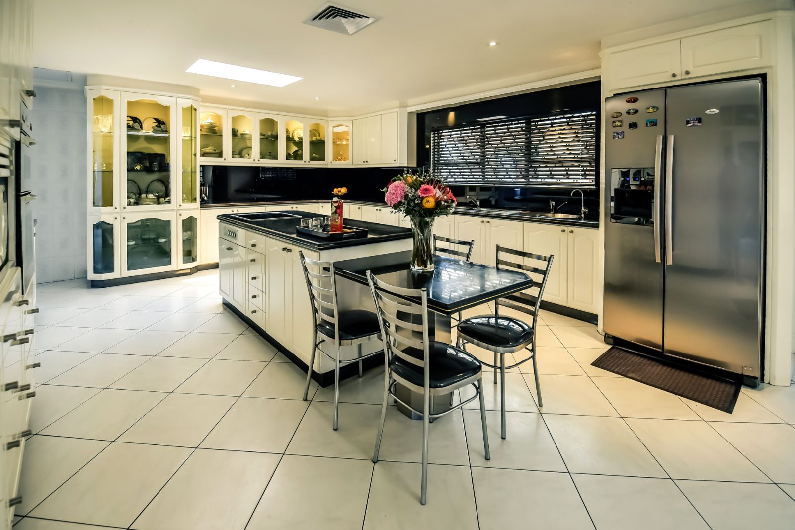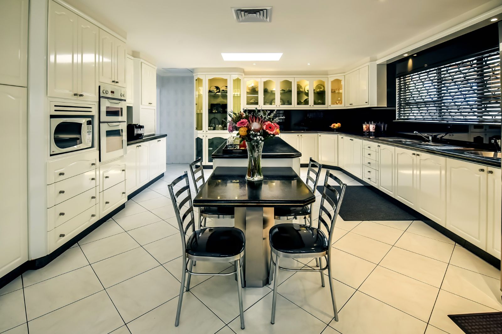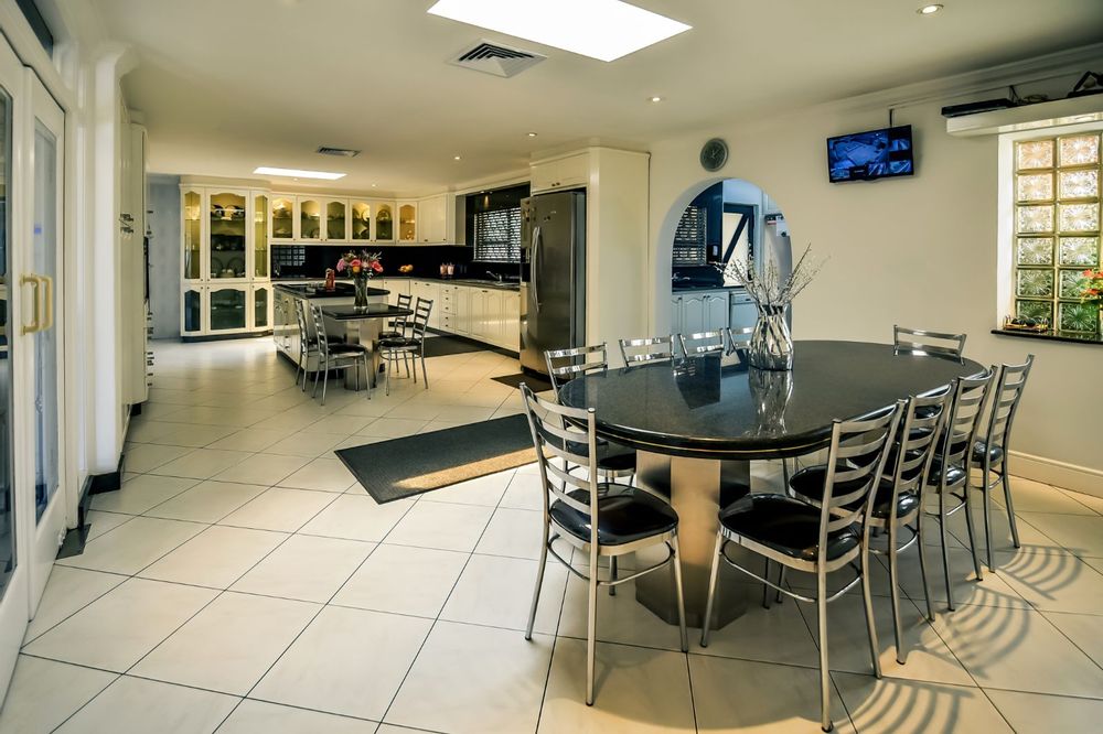 The kitchen is the highlight of this property, featuring two skylights for natural light and is finished with solid wood and has white gloss built-in cupboards with glass display cabinets. The kitchen tops are finished in granite and hosts a granite table with 14 steel chairs finished in chrome, complimenting the kitchen.