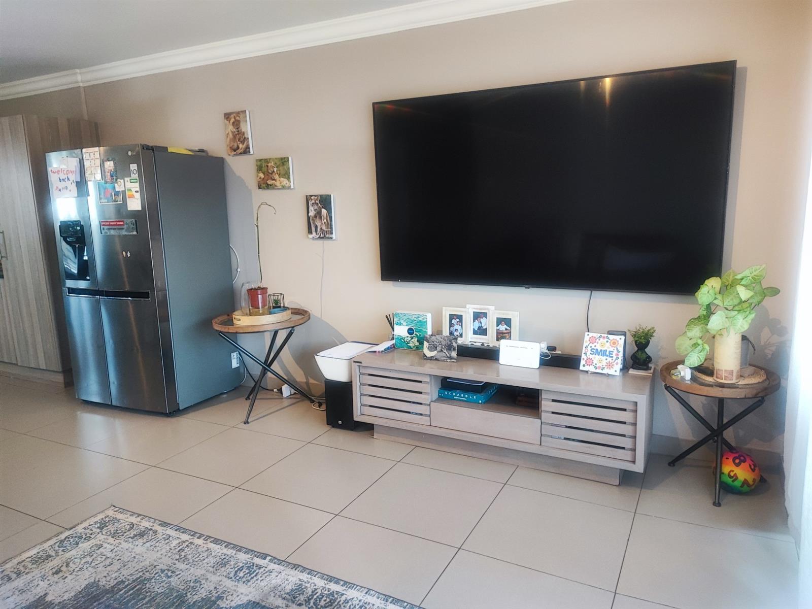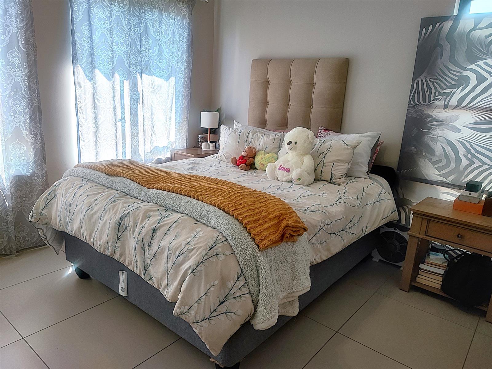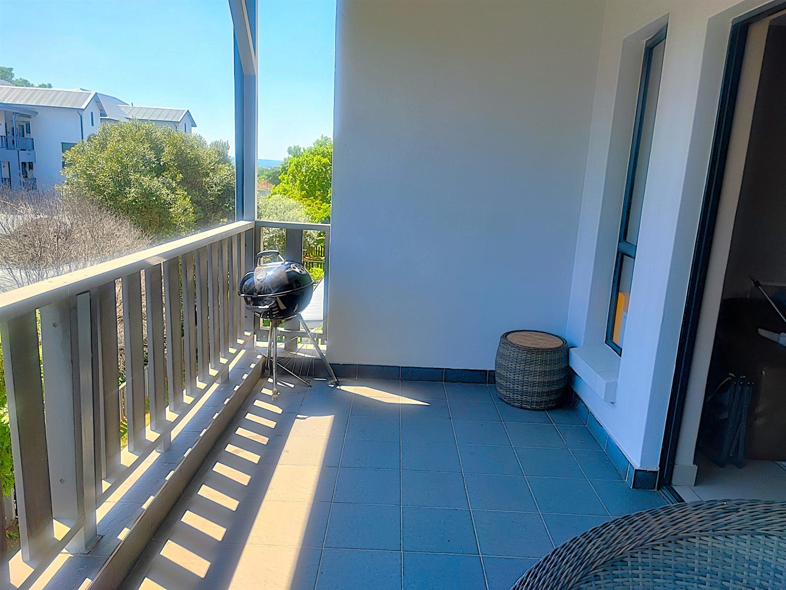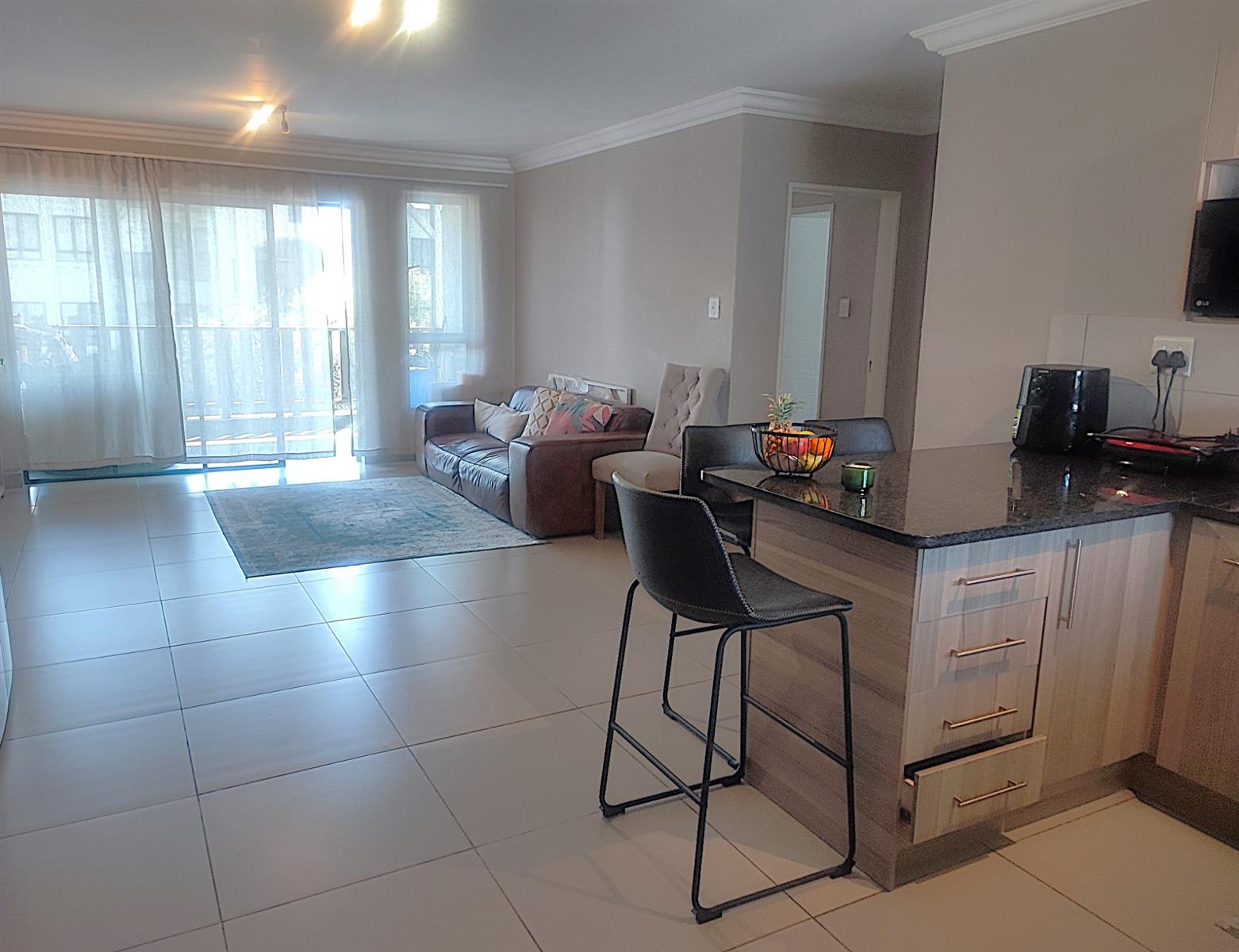 The spacious open plan living area and well-appointed kitchen open onto a large private balcony, suitable for entertaining. The modern kitchen features granite tops, with ample storage space. "The scullery/ laundry" area consists of cabinets, a sink and under counter space for two appliances. Both bedrooms are fitted with built- in cupboards. The main bedroom accommodates a Queen size bed while the second bedroom has space for a Double bed. There is one full bathroom, and the second bathroom has a shower. One carport and one open parking space are allocated to the apartment with ample visitors parking provided throughout the Complex. The well maintained gardens offer a peaceful green environment. There is a Clubhouse, swimming pool, jungle gym, and braai facilities.