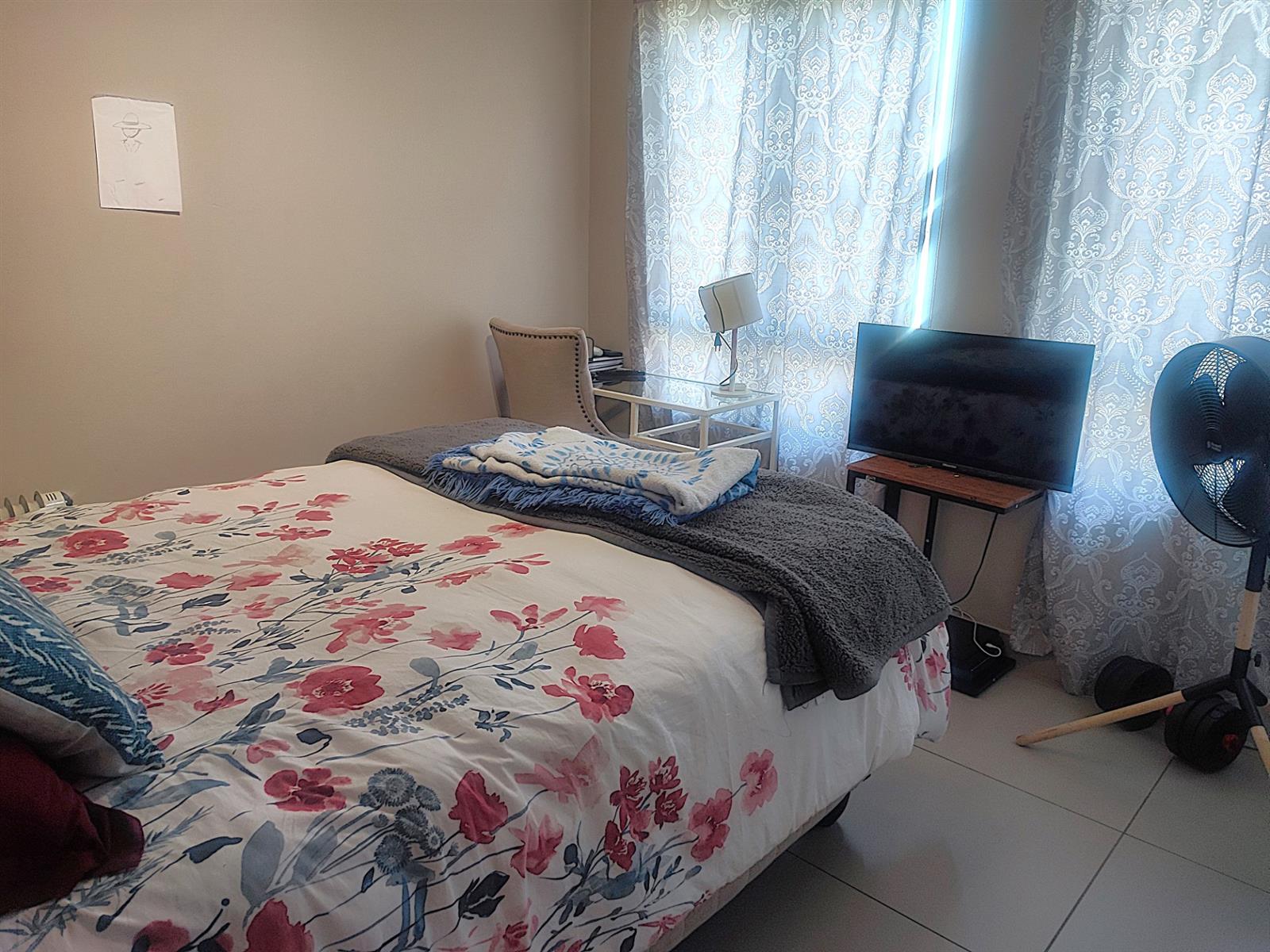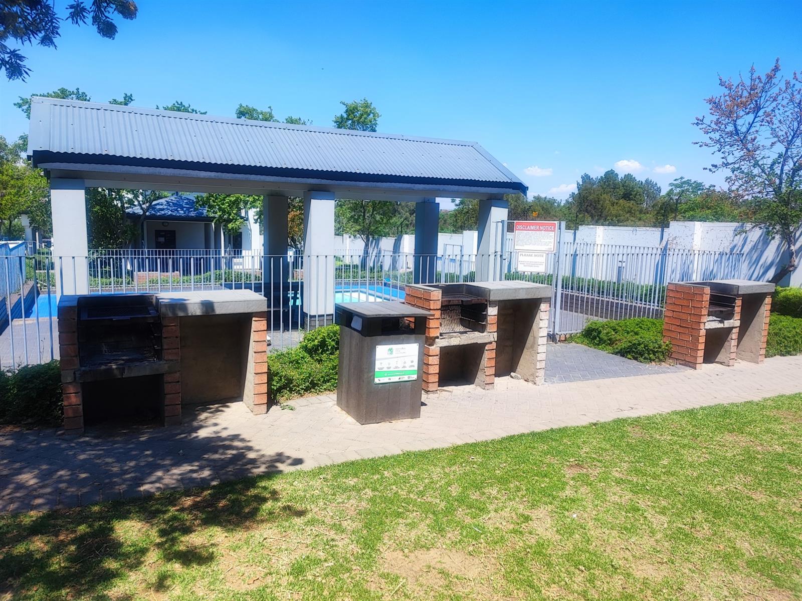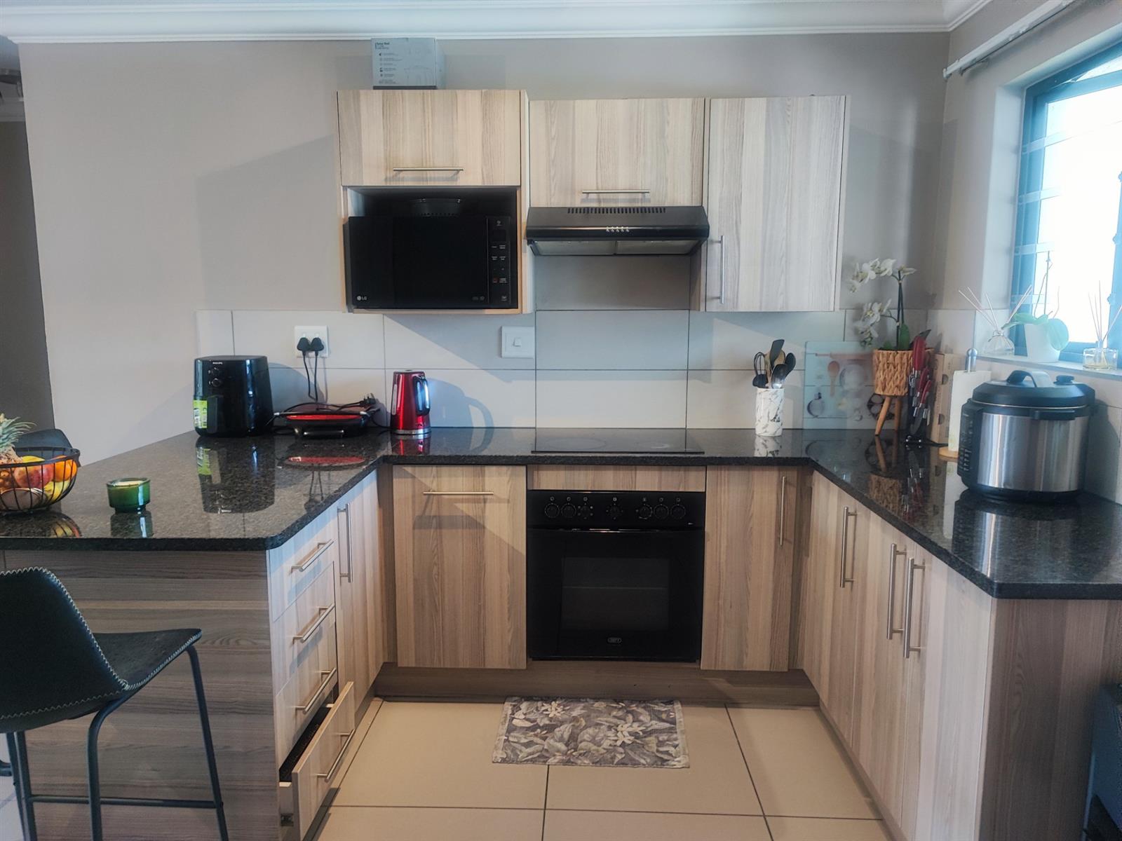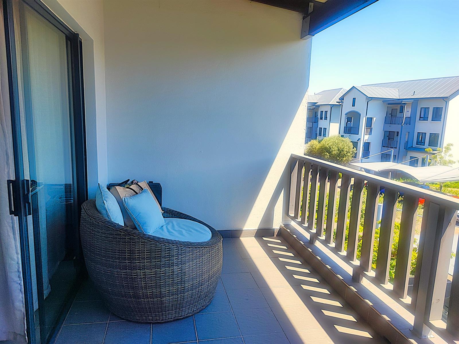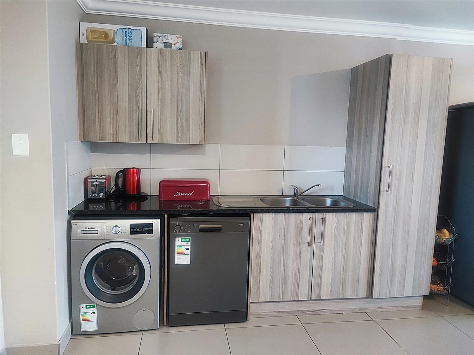 The spacious open plan living area and well-appointed kitchen open onto a large private balcony, suitable for entertaining. The modern kitchen features granite tops, with ample storage space. "The scullery/ laundry" area consists of cabinets, a sink and under counter space for two appliances. Both bedrooms are fitted with built- in cupboards. The main bedroom accommodates a Queen size bed while the second bedroom has space for a Double bed. There is one full bathroom, and the second bathroom has a shower. One carport and one open parking space are allocated to the apartment with ample visitors parking provided throughout the Complex. The well maintained gardens offer a peaceful green environment. There is a Clubhouse, swimming pool, jungle gym, and braai facilities.