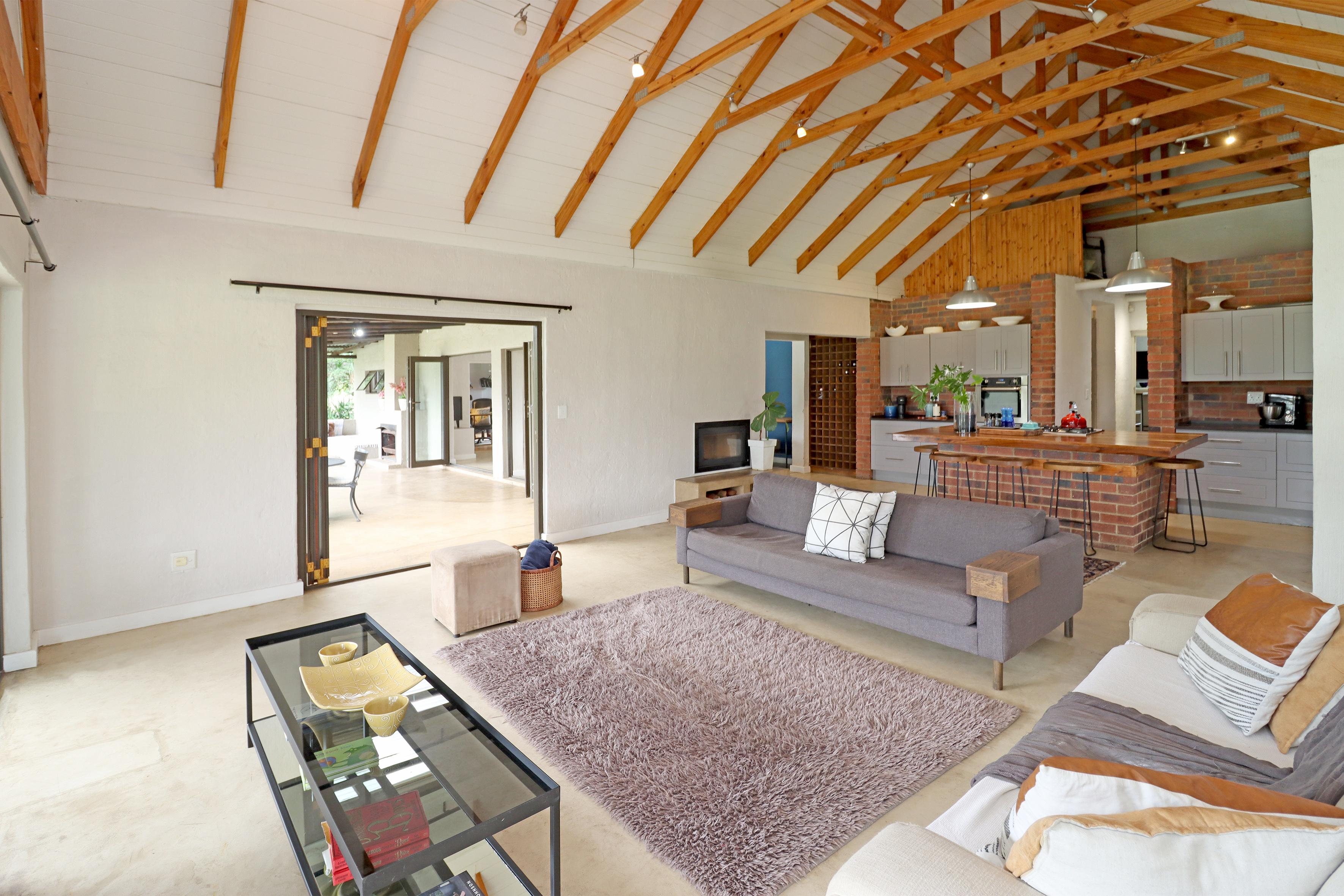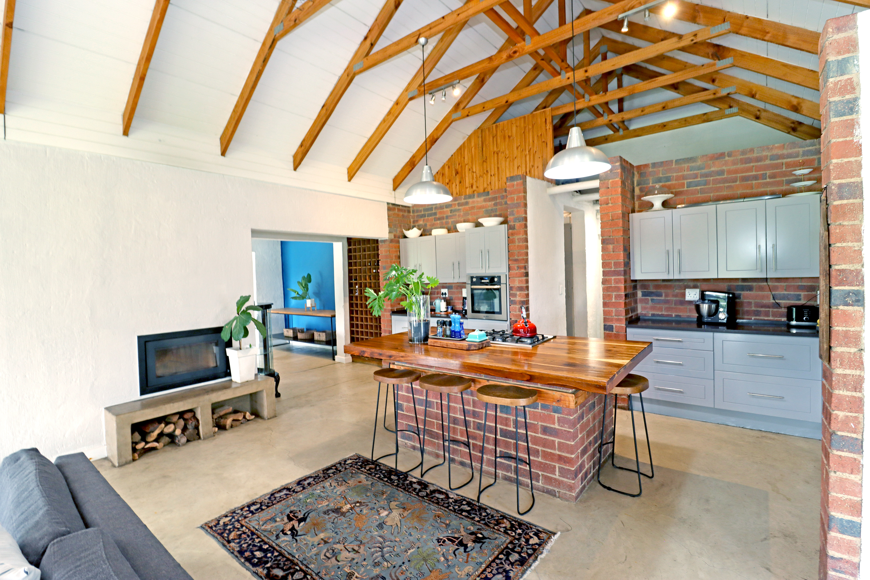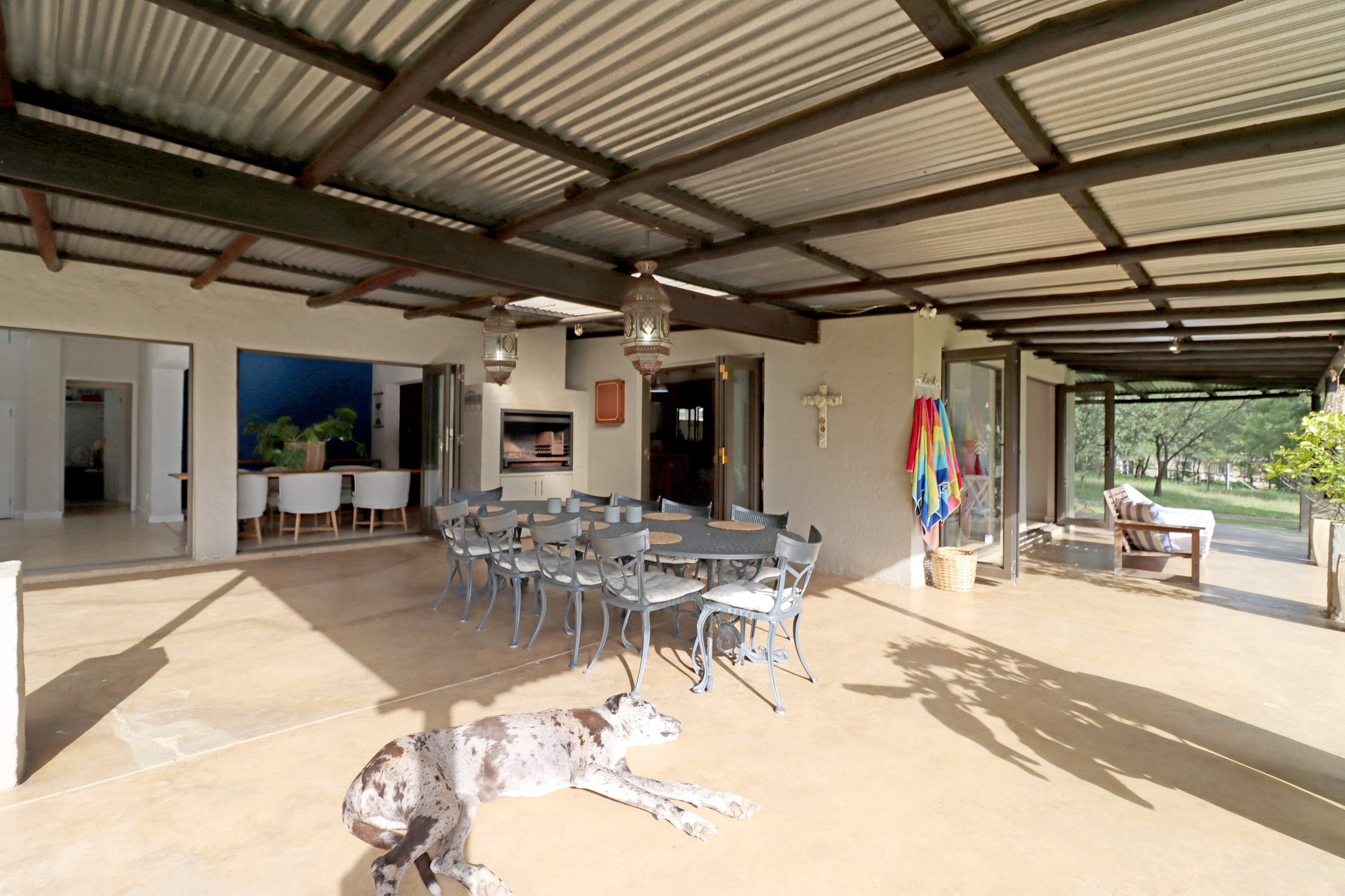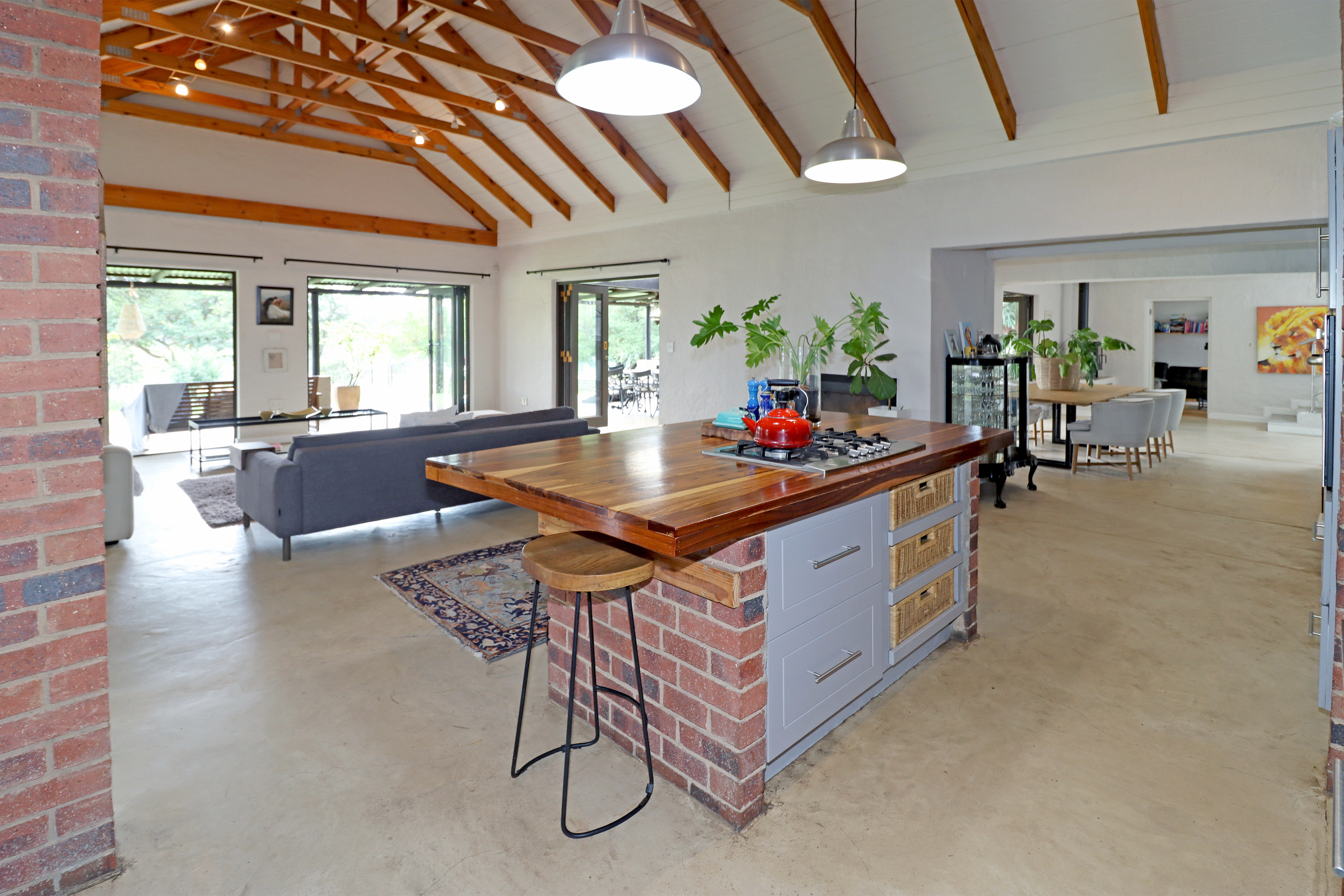 The dining area, with its cosy wood-burning stove, comfortably fits an 8-to-10-seater table, perfect for entertaining. Both the lounge and dining areas open onto a large, covered patio, offering space for dining and relaxing, complete with an outdoor fireplace and uninterrupted valley views.