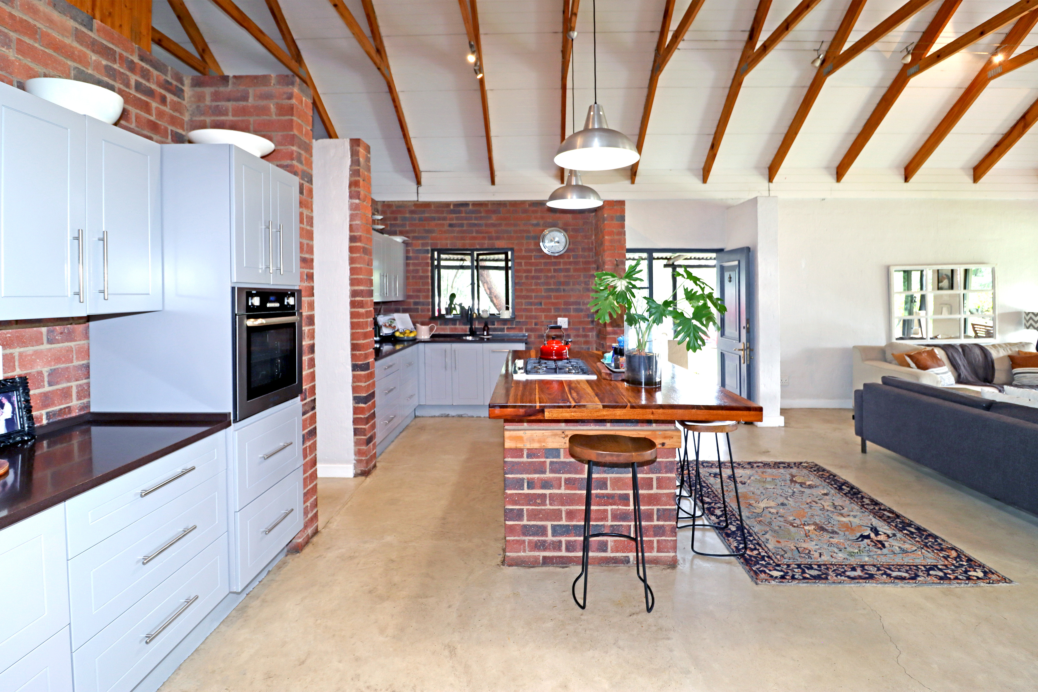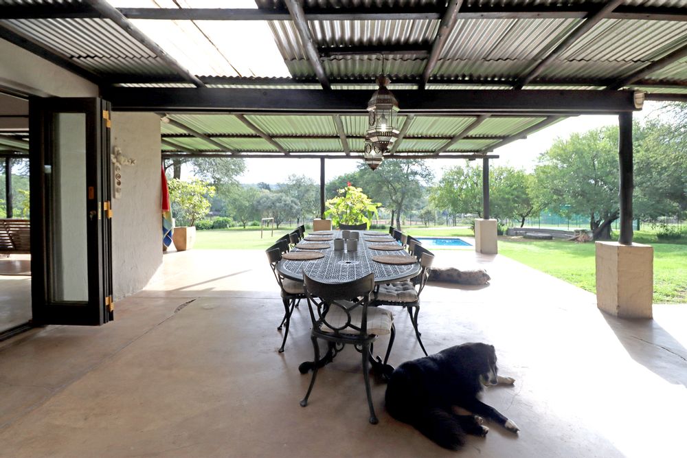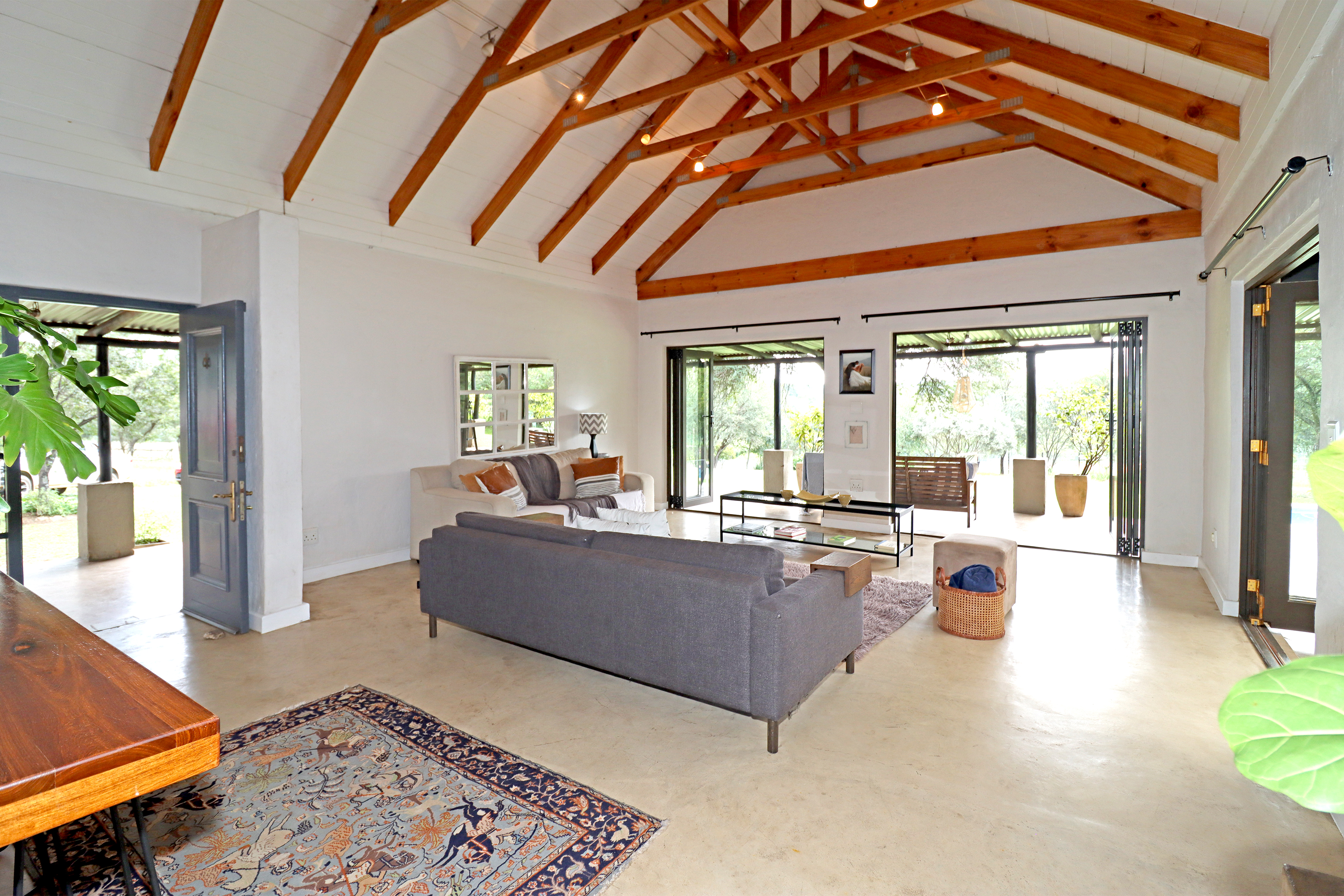 The dining area, with its cosy wood-burning stove, comfortably fits an 8-to-10-seater table, perfect for entertaining. Both the lounge and dining areas open onto a large, covered patio, offering space for dining and relaxing, complete with an outdoor fireplace and uninterrupted valley views.