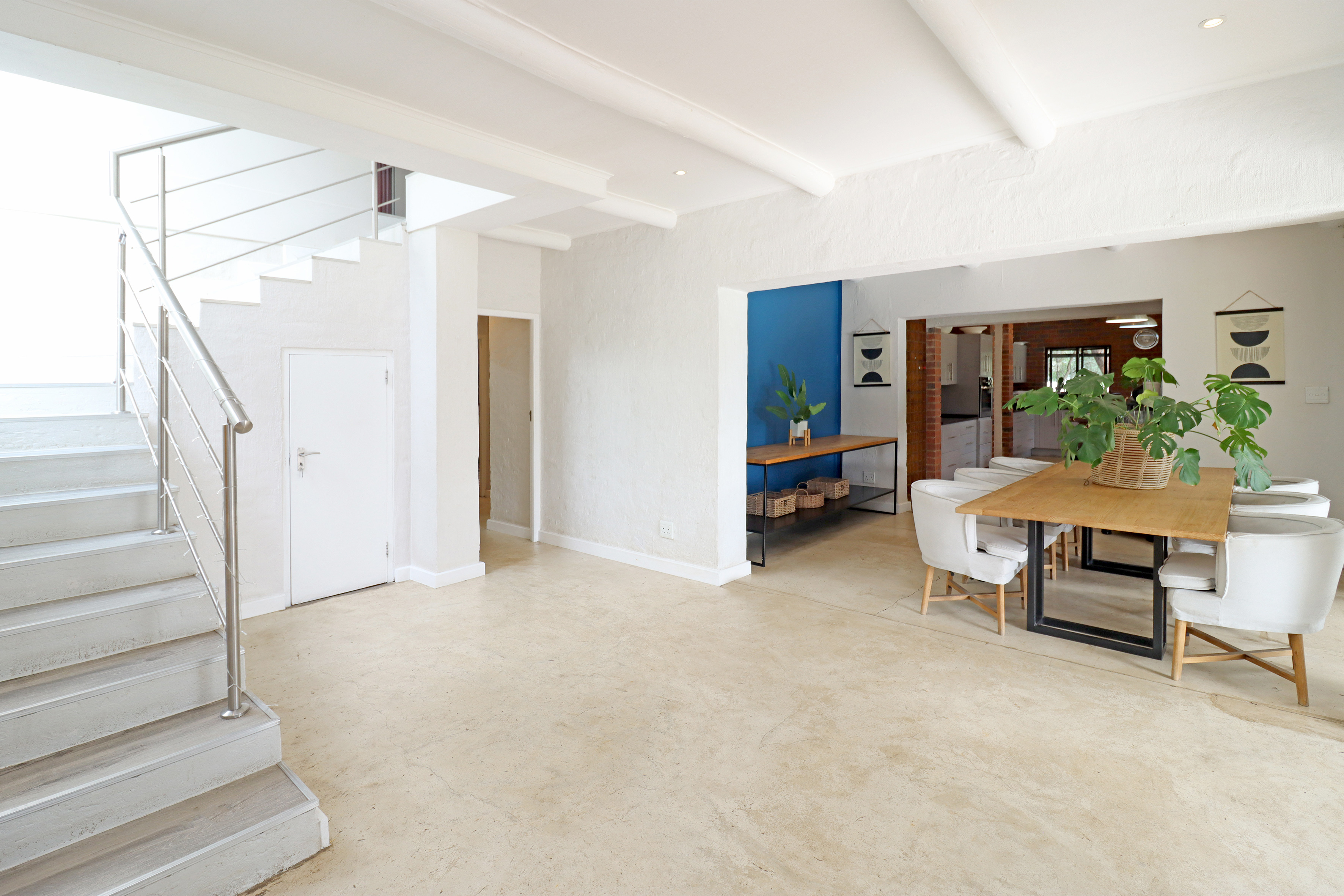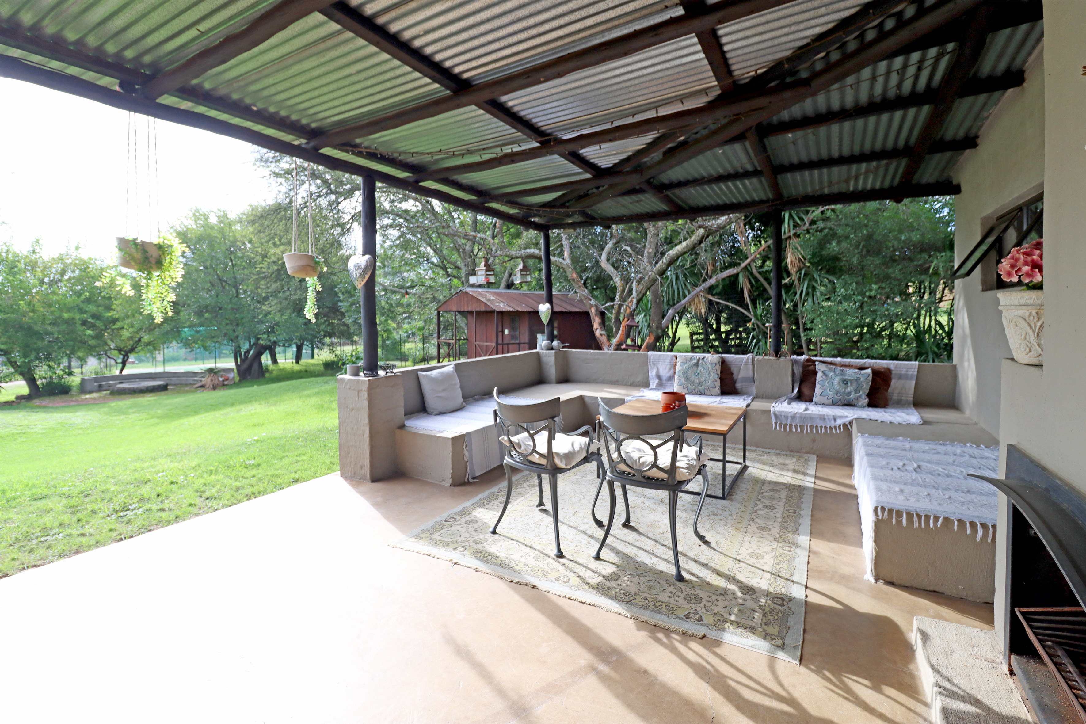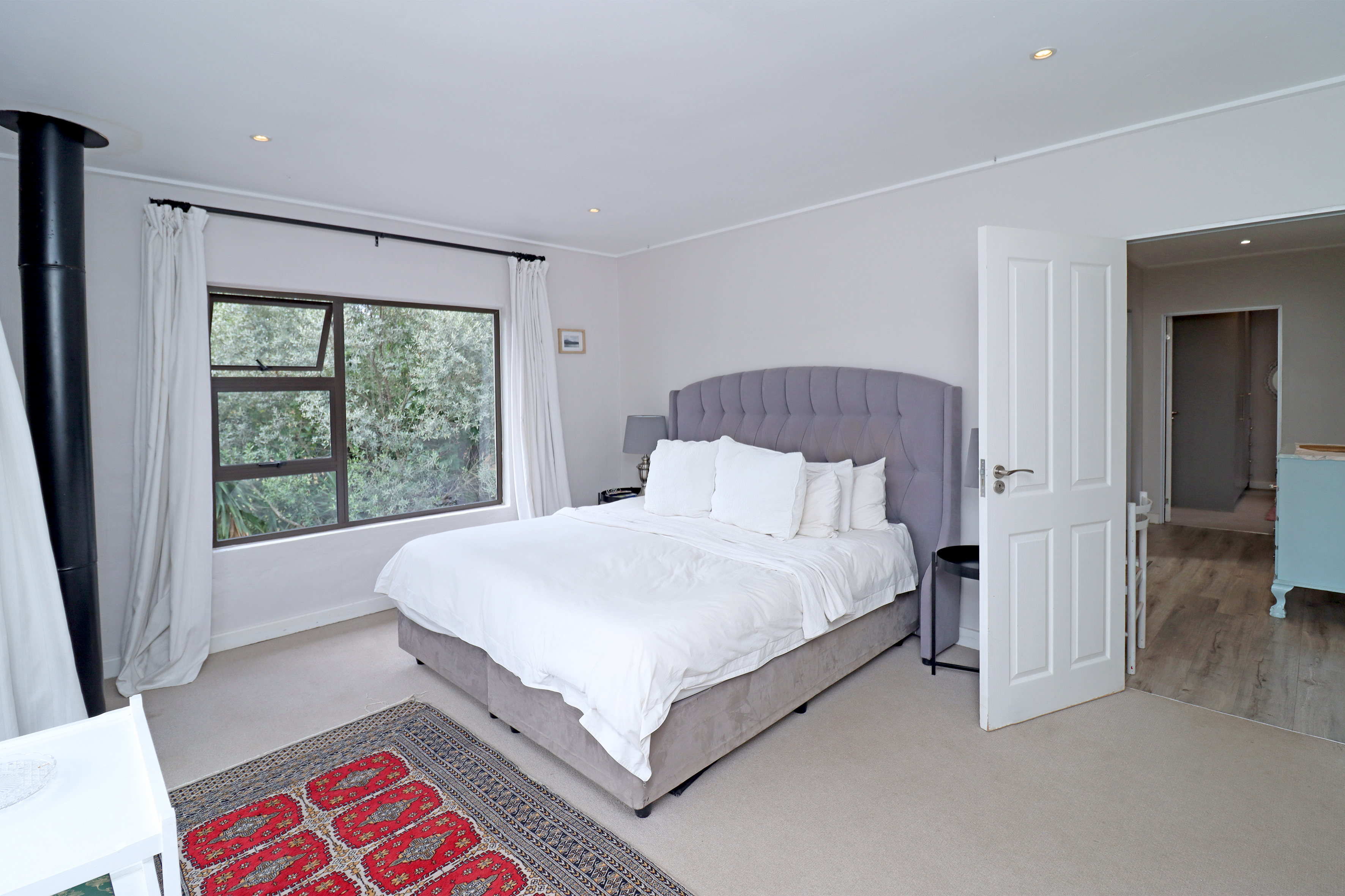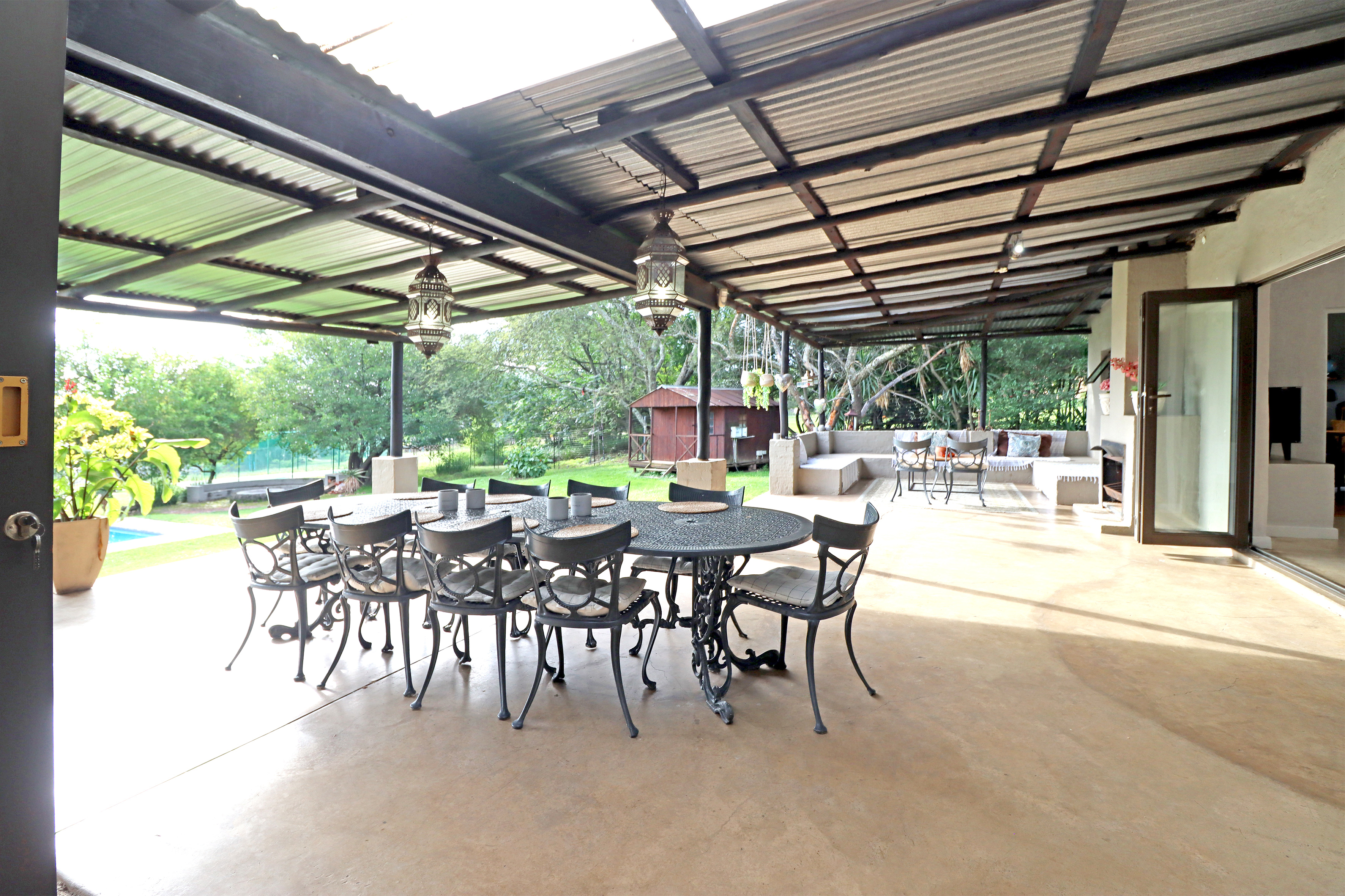 The dining area, with its cosy wood-burning stove, comfortably fits an 8-to-10-seater table, perfect for entertaining. Both the lounge and dining areas open onto a large, covered patio, offering space for dining and relaxing, complete with an outdoor fireplace and uninterrupted valley views.