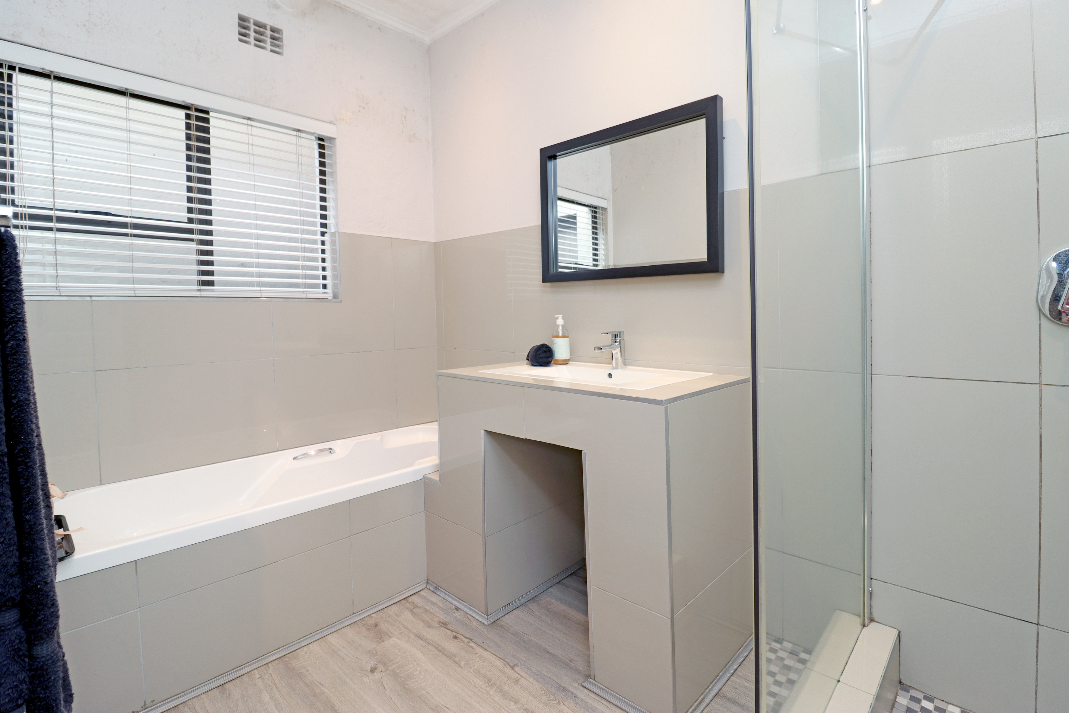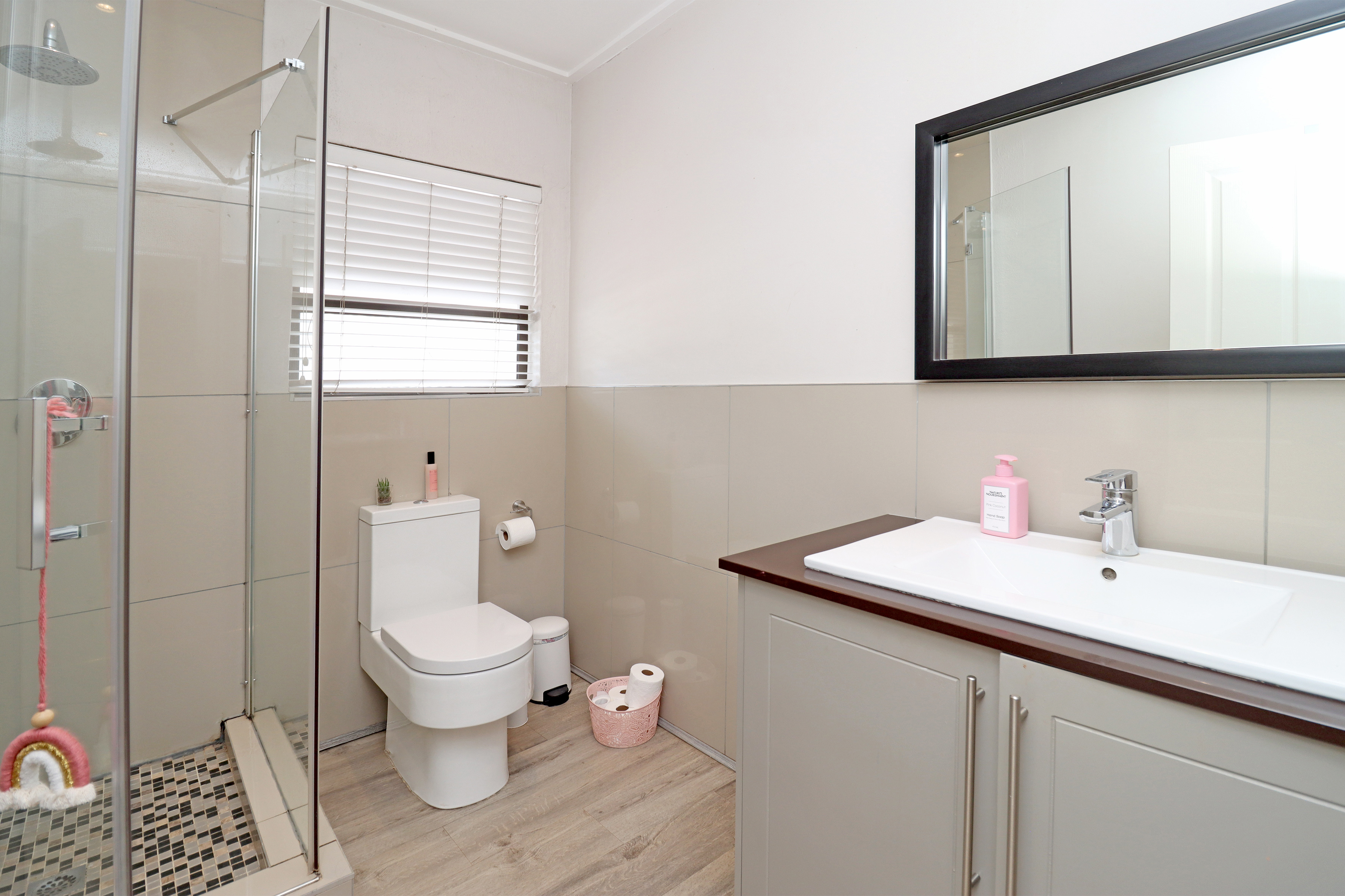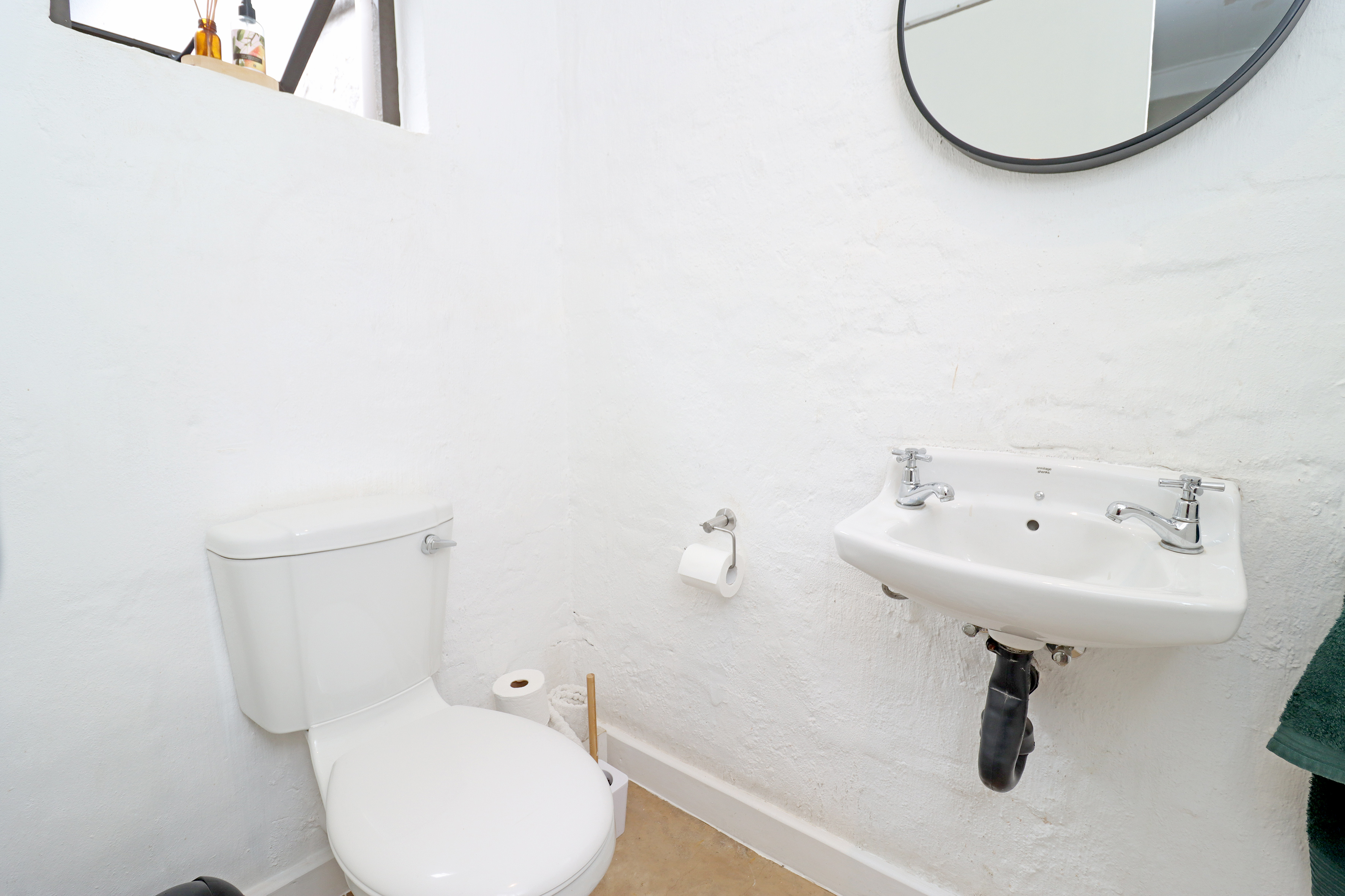 There are two bedrooms downstairs along with a full bathroom featuring a bath, shower, and basin, and a separate toilet.