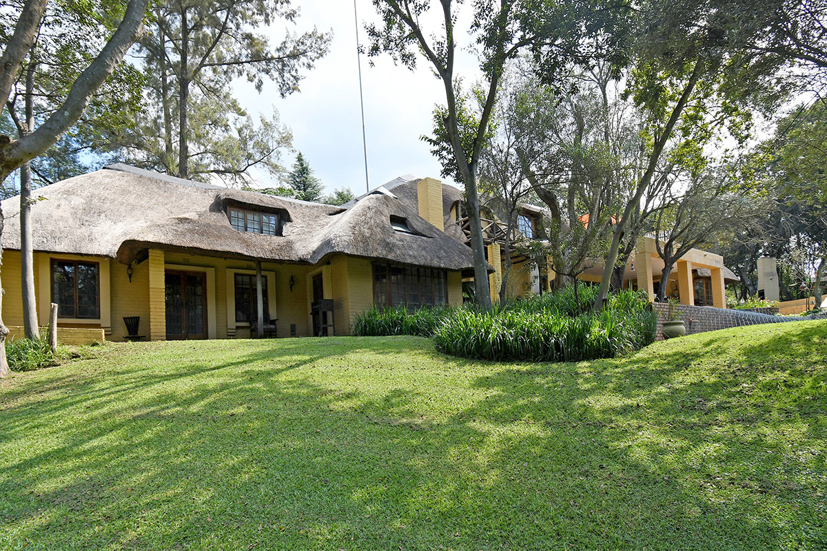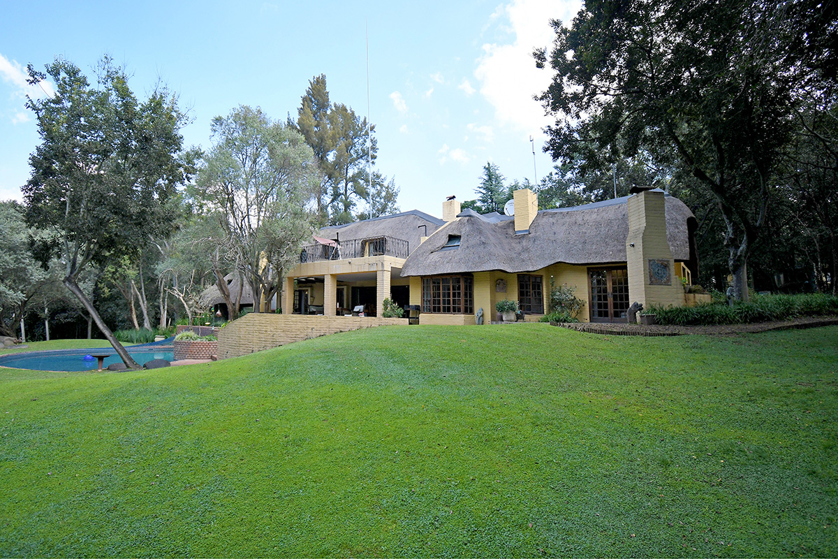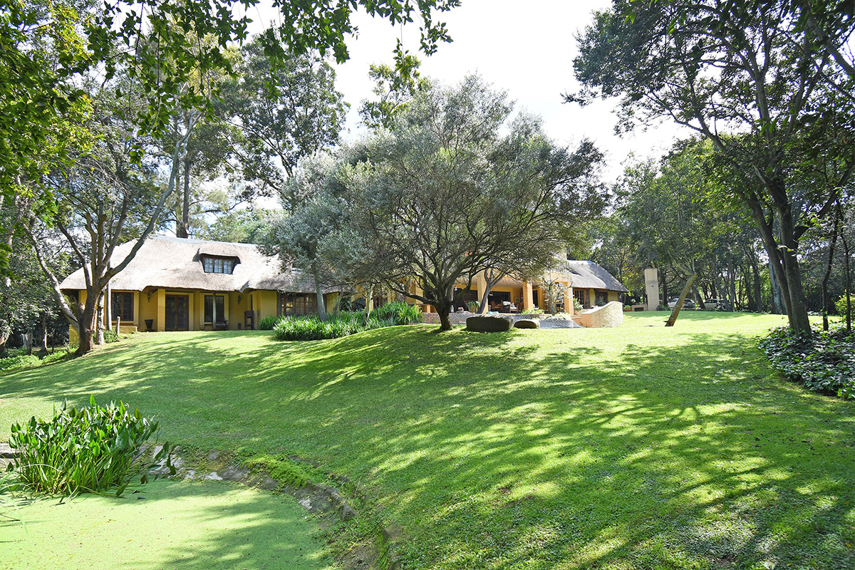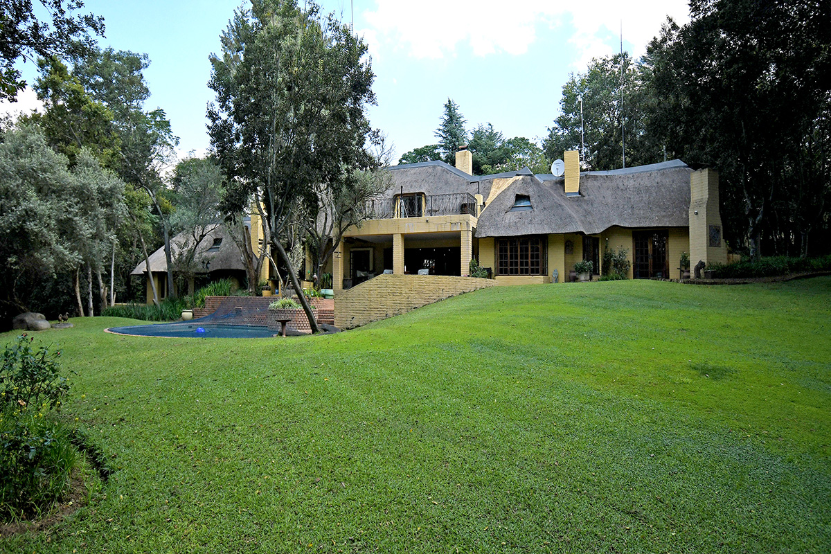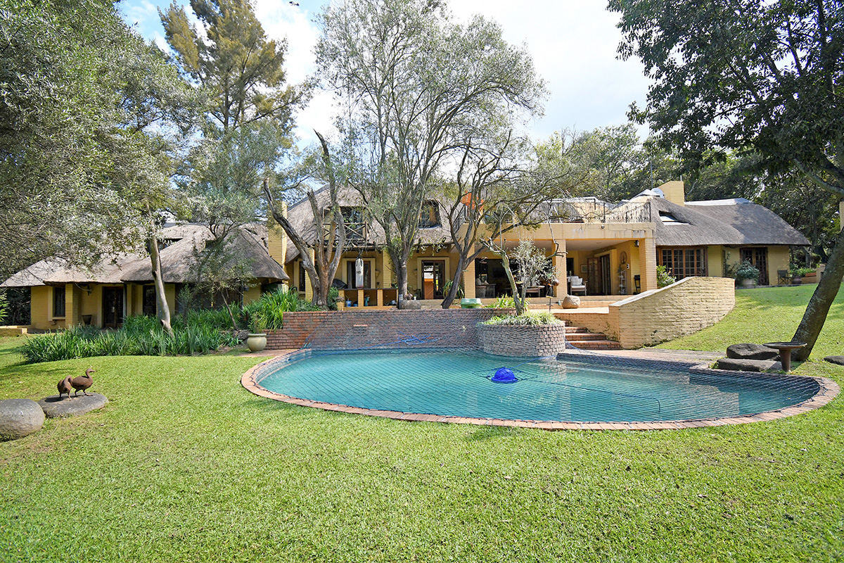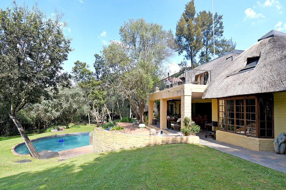 This elegant double-storey thatch home is nestled along the serene banks of the Klein Jukskei River, offering a rare blend of rural charm and tranquil living. Set on 3.7 hectares of lush, tree-filled gardens, the property features rolling lawns, established trees, and visits from resident wildlife, creating a peaceful countryside atmosphere just minutes from the city.
