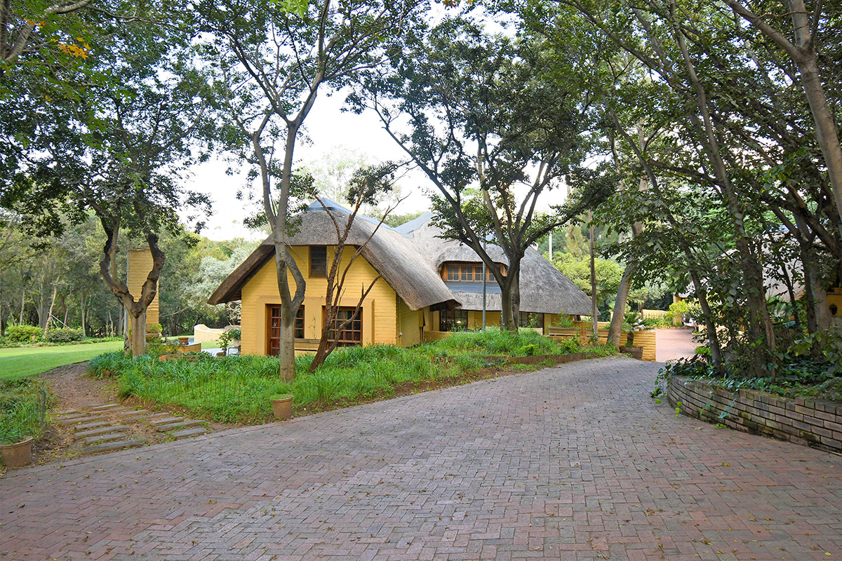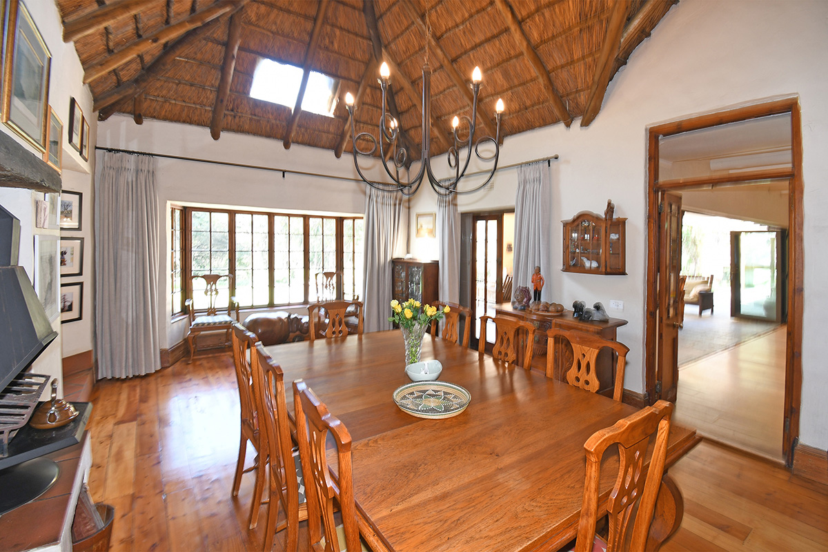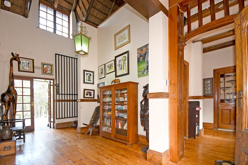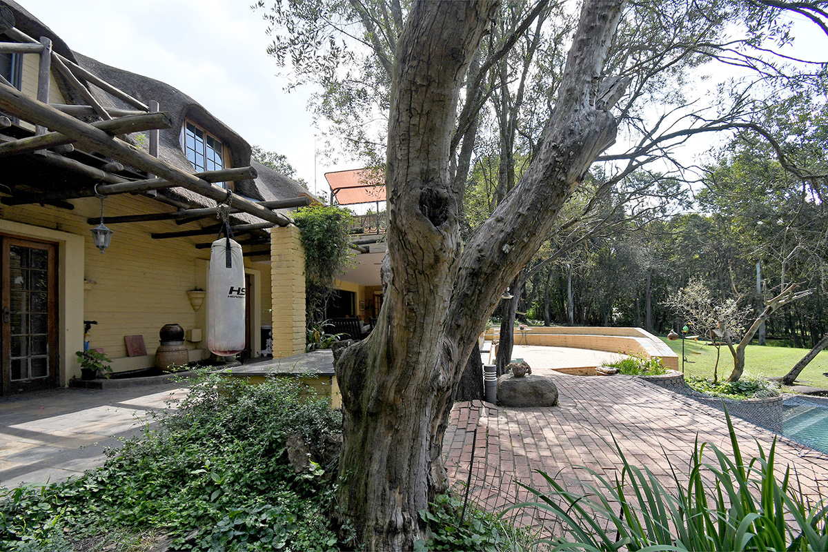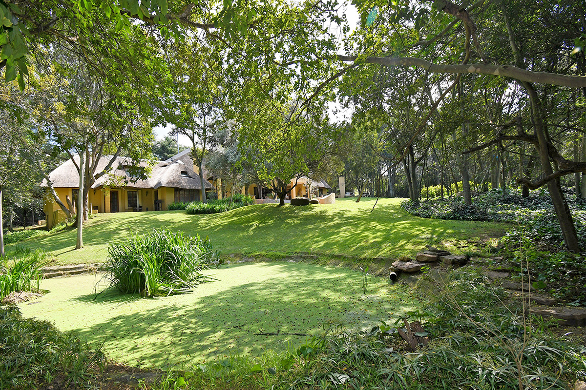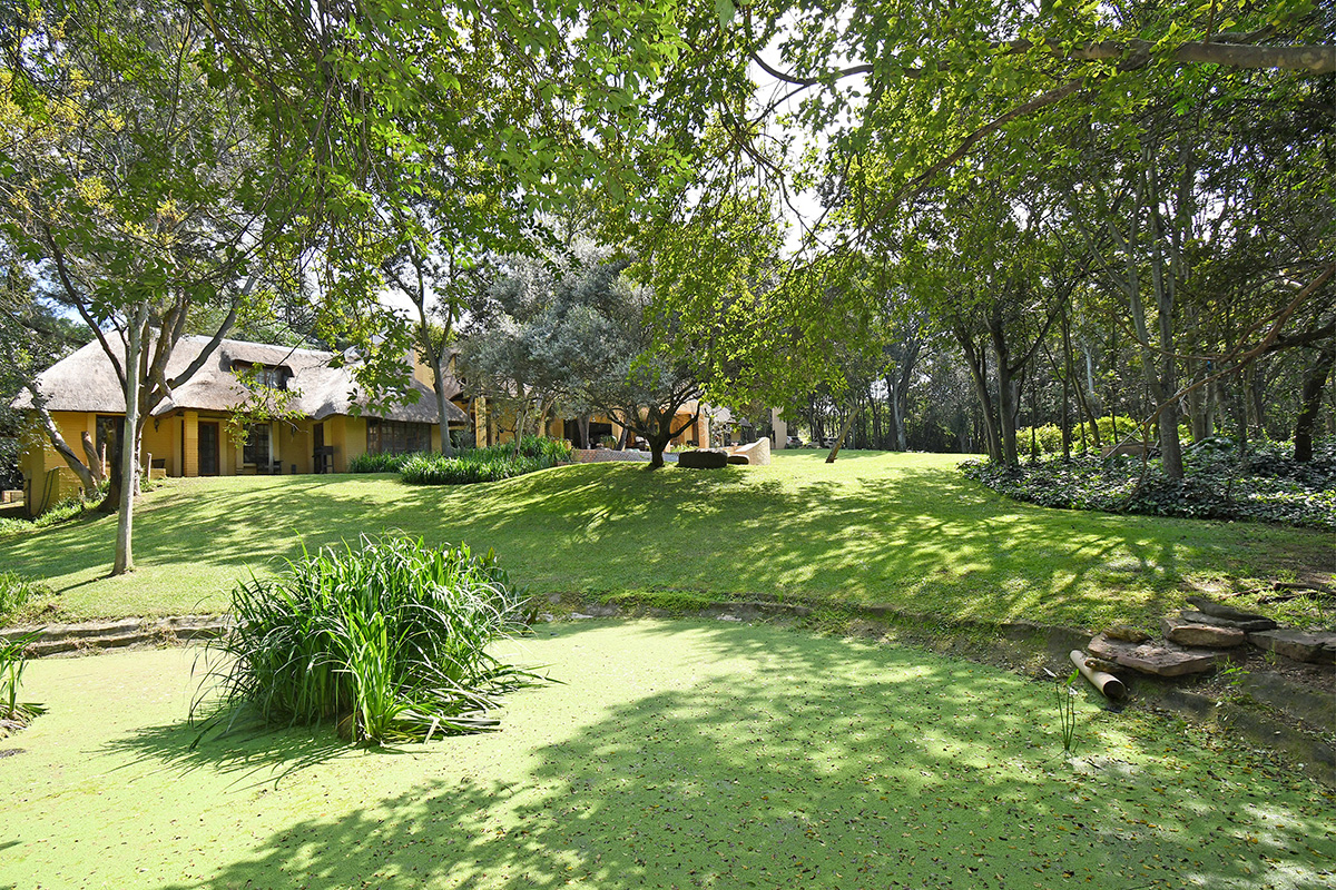 This elegant double-storey thatch home is nestled along the serene banks of the Klein Jukskei River, offering a rare blend of rural charm and tranquil living. Set on 3.7 hectares of lush, tree-filled gardens, the property features rolling lawns, established trees, and visits from resident wildlife, creating a peaceful countryside atmosphere just minutes from the city.