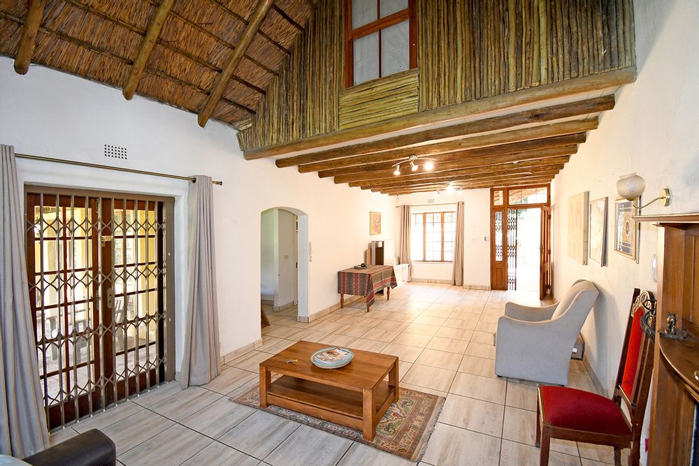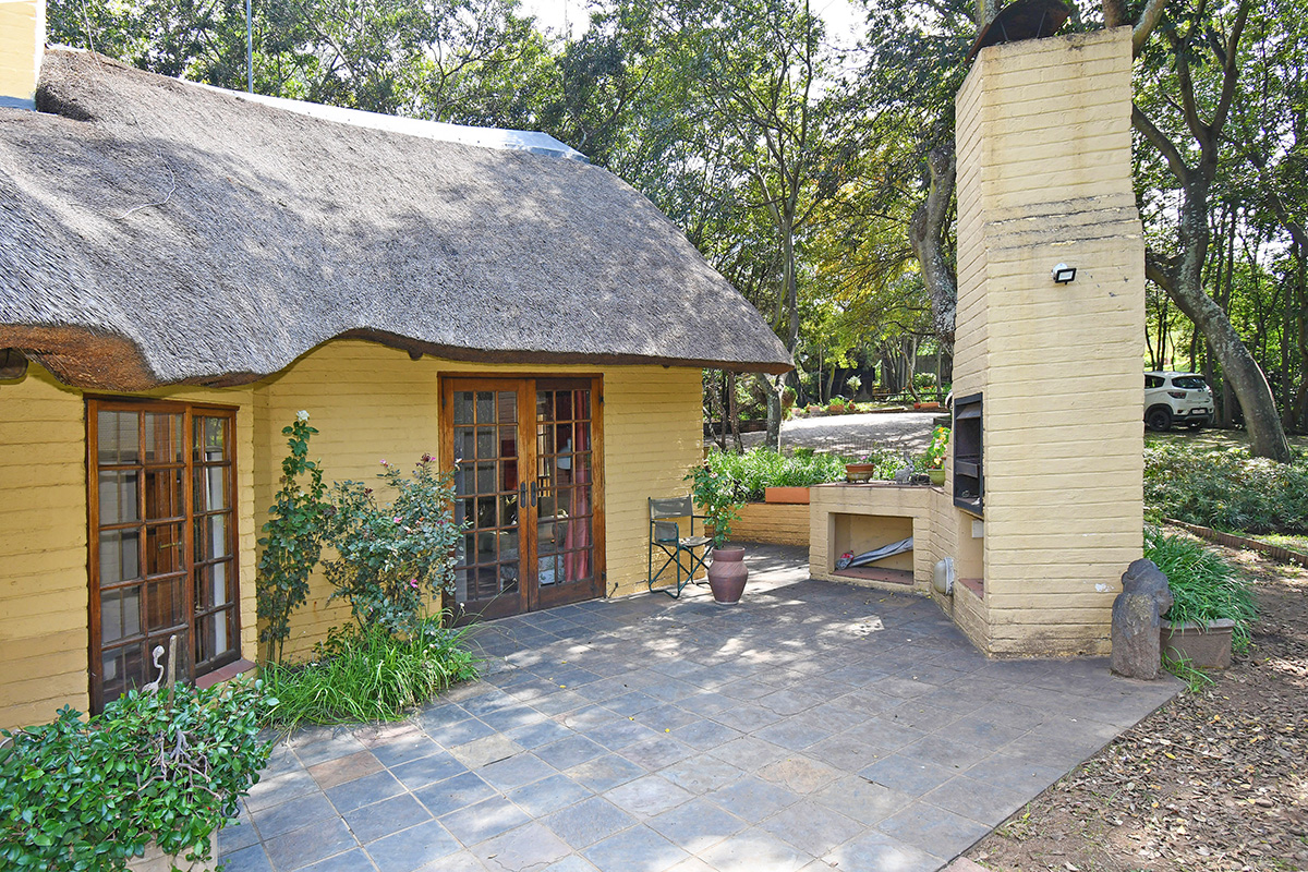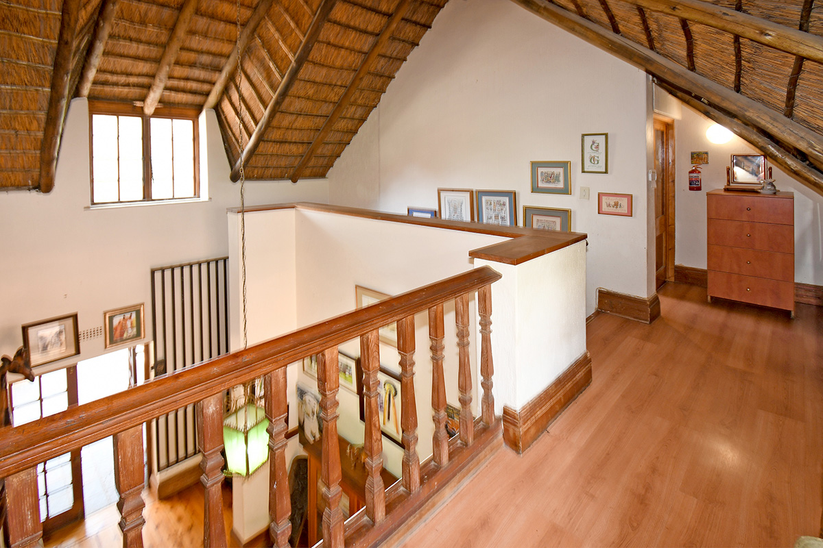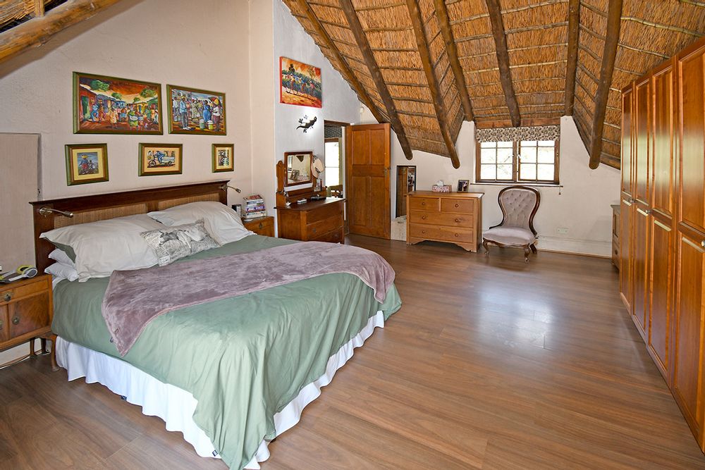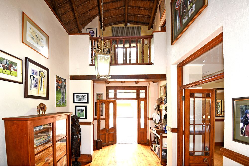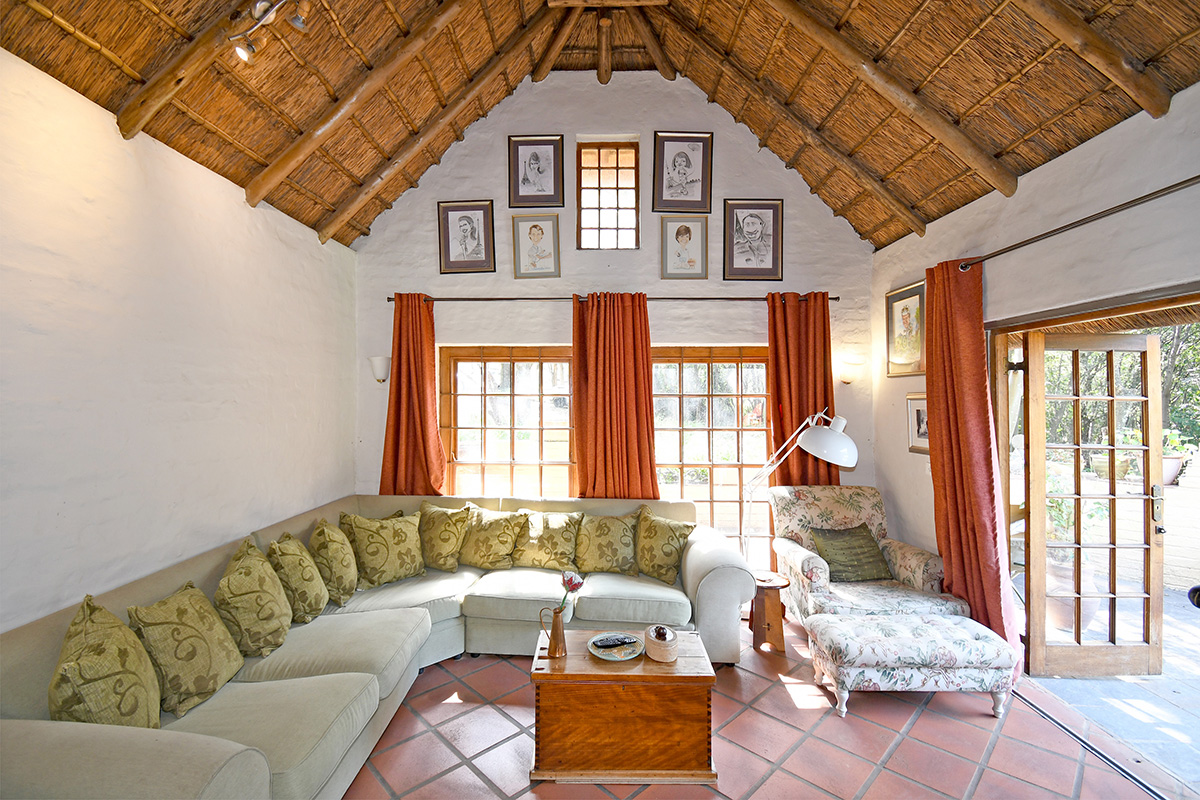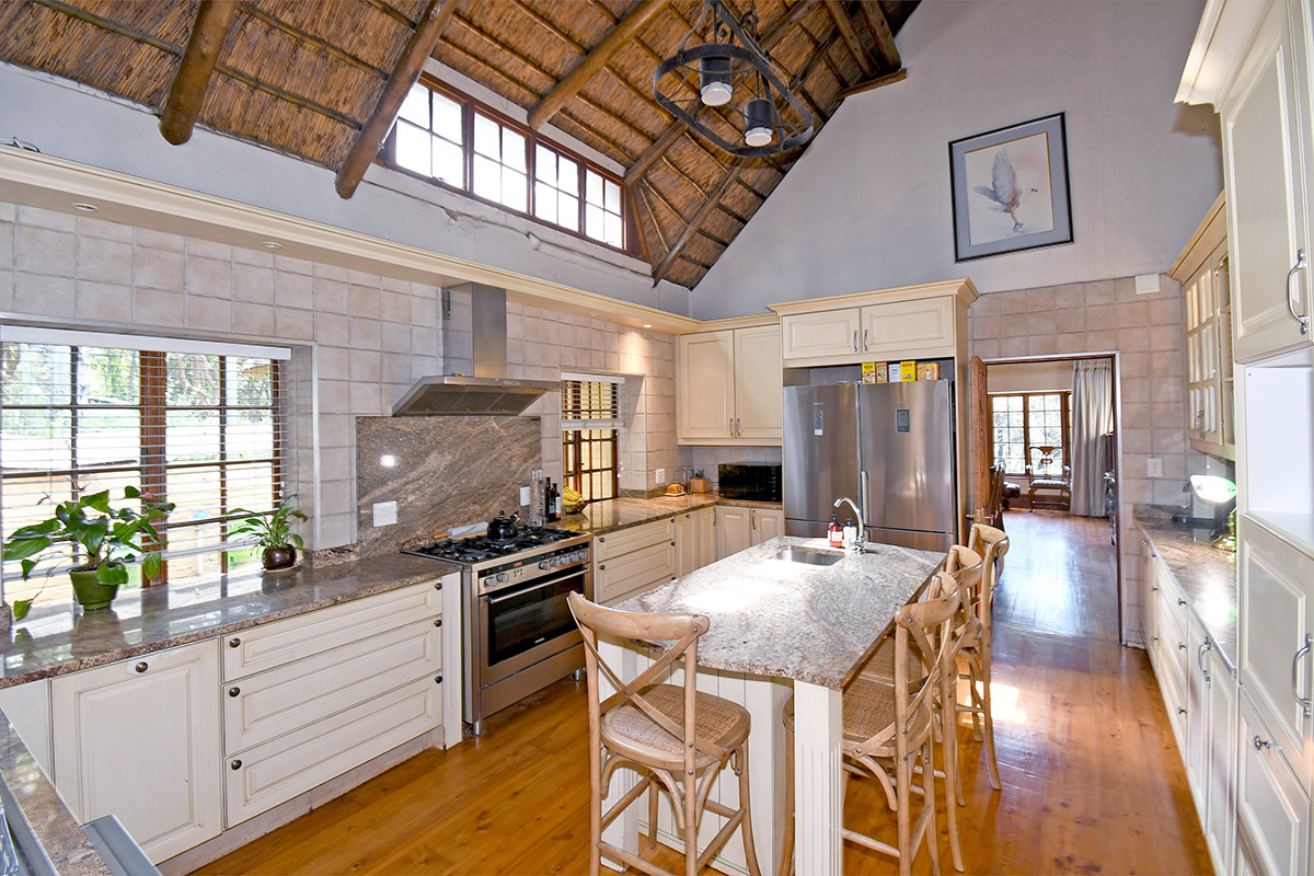 This elegant double-storey thatch home is nestled along the serene banks of the Klein Jukskei River, offering a rare blend of rural charm and tranquil living. Set on 3.7 hectares of lush, tree-filled gardens, the property features rolling lawns, established trees, and visits from resident wildlife, creating a peaceful countryside atmosphere just minutes from the city.