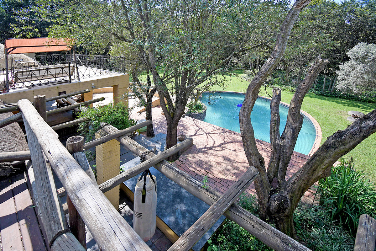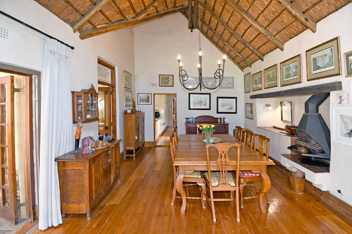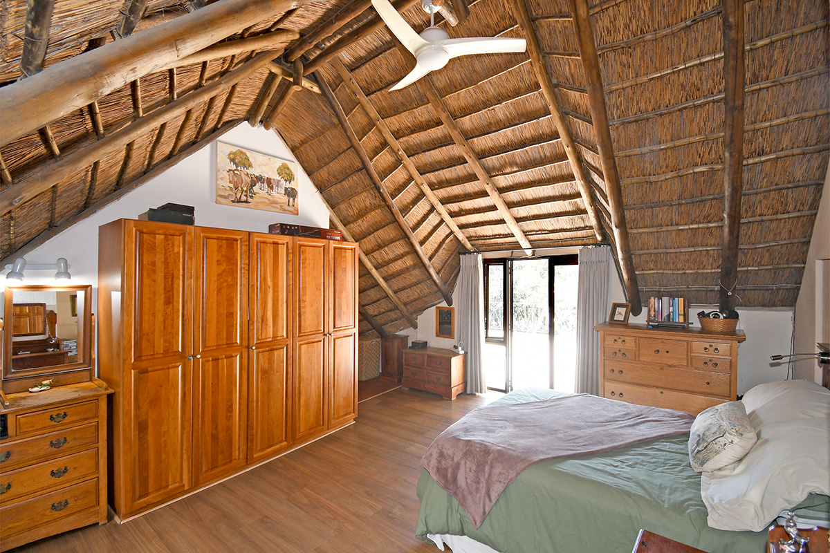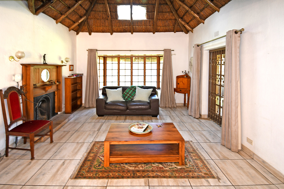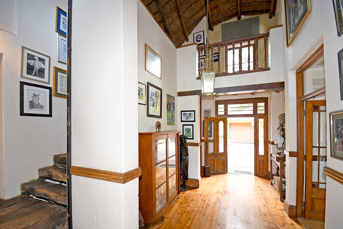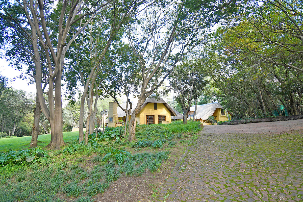 This elegant double-storey thatch home is nestled along the serene banks of the Klein Jukskei River, offering a rare blend of rural charm and tranquil living. Set on 3.7 hectares of lush, tree-filled gardens, the property features rolling lawns, established trees, and visits from resident wildlife, creating a peaceful countryside atmosphere just minutes from the city.