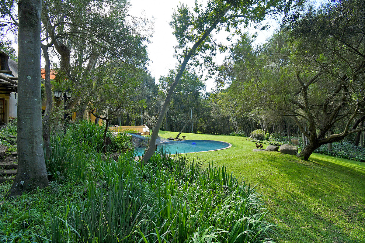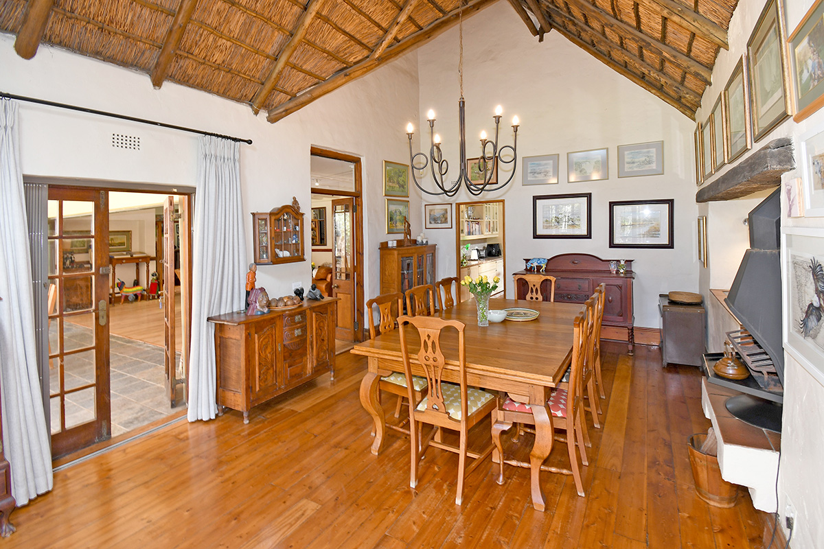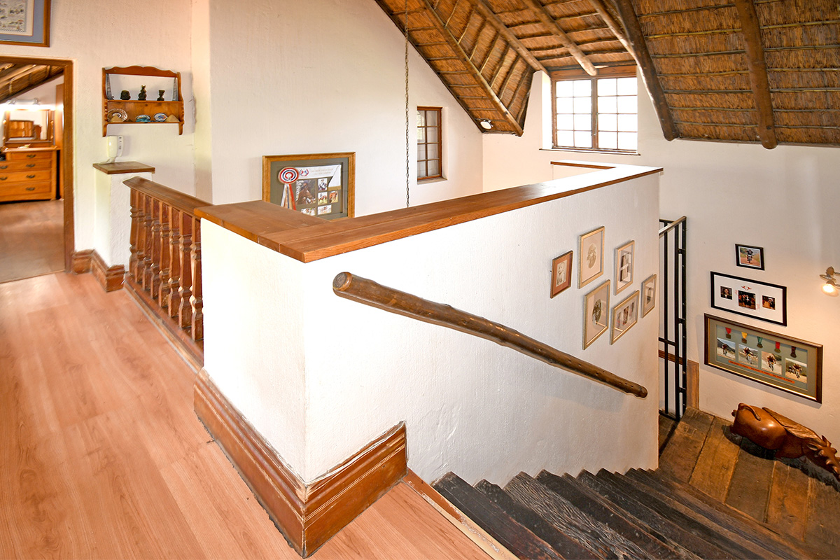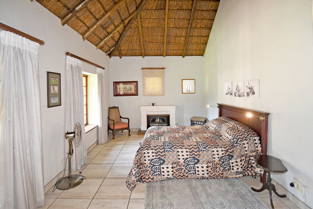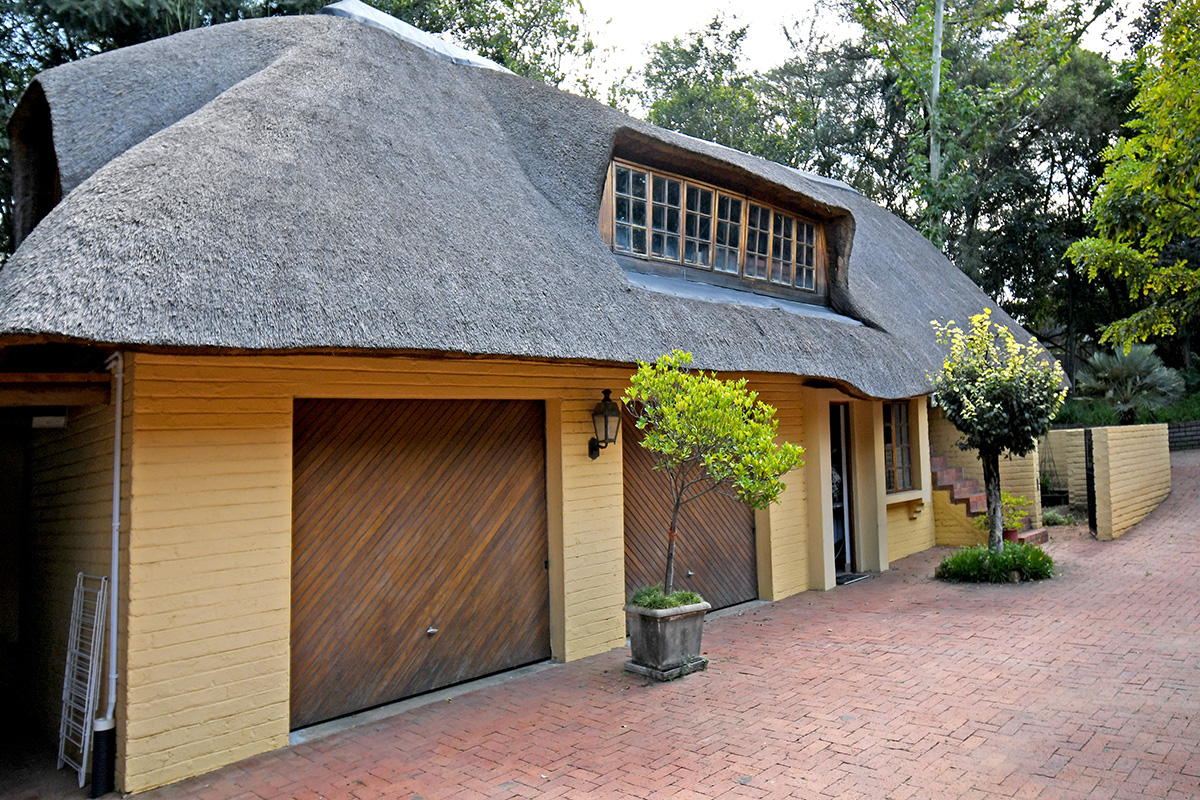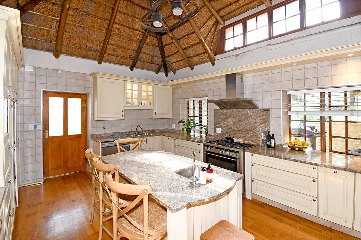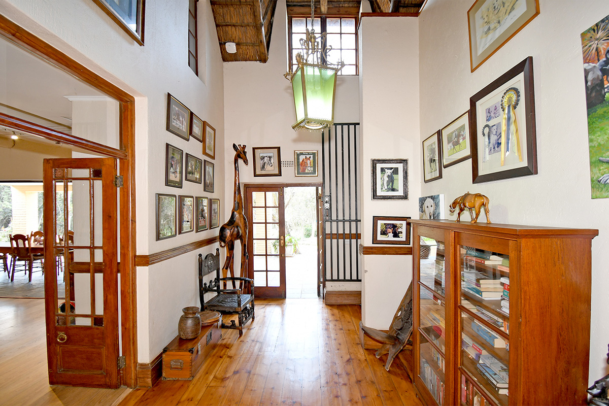This elegant double-storey thatch home is nestled along the serene banks of the Klein Jukskei River, offering a rare blend of rural charm and tranquil living. Set on 3.7 hectares of lush, tree-filled gardens, the property features rolling lawns, established trees, and visits from resident wildlife, creating a peaceful countryside atmosphere just minutes from the city.