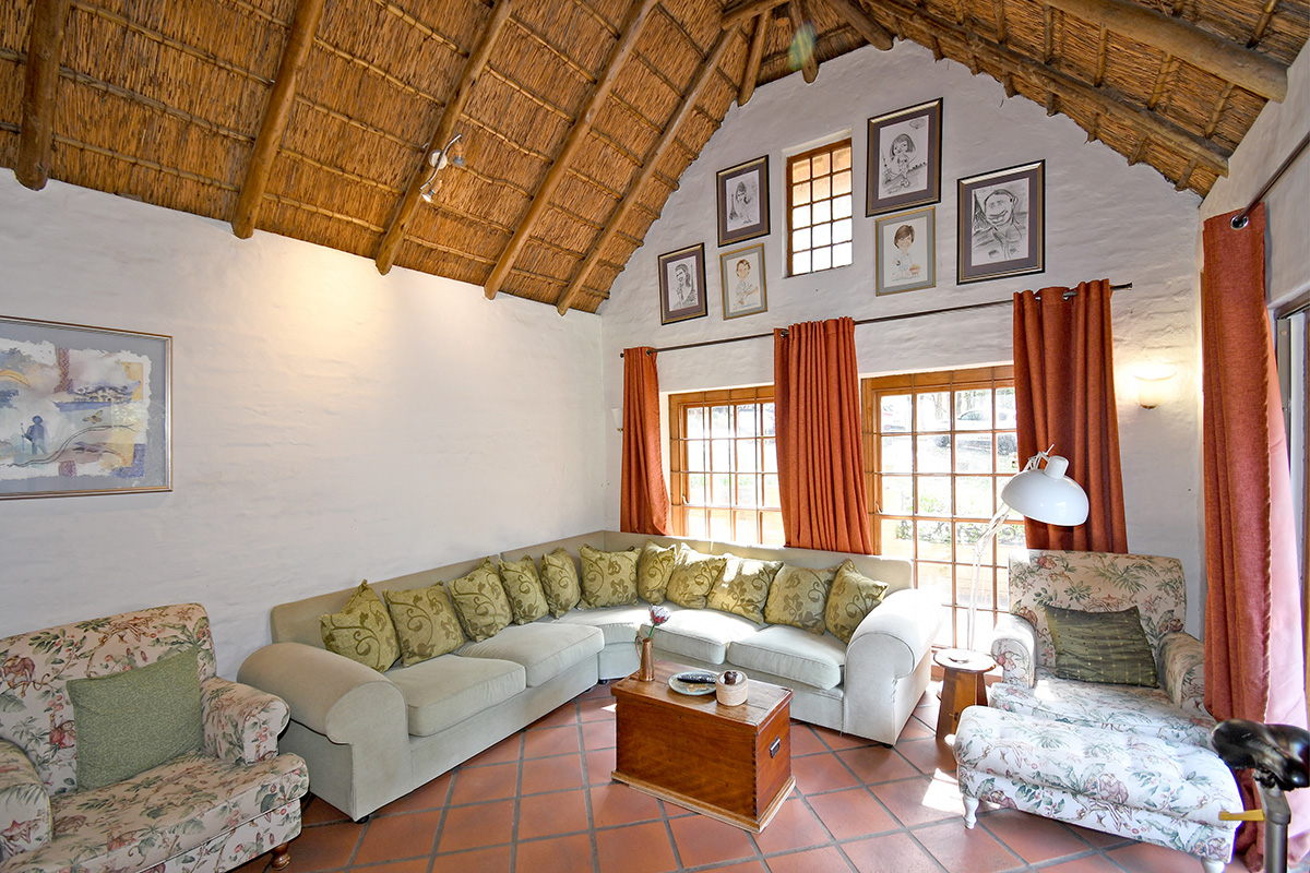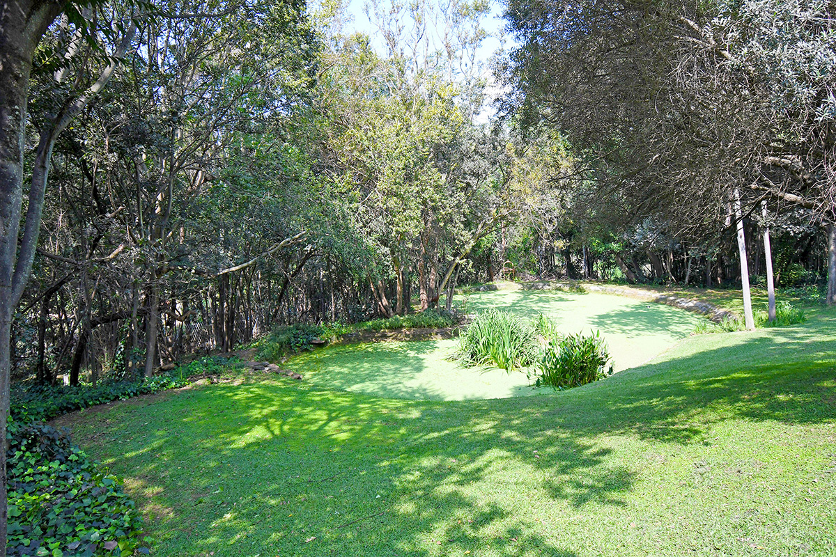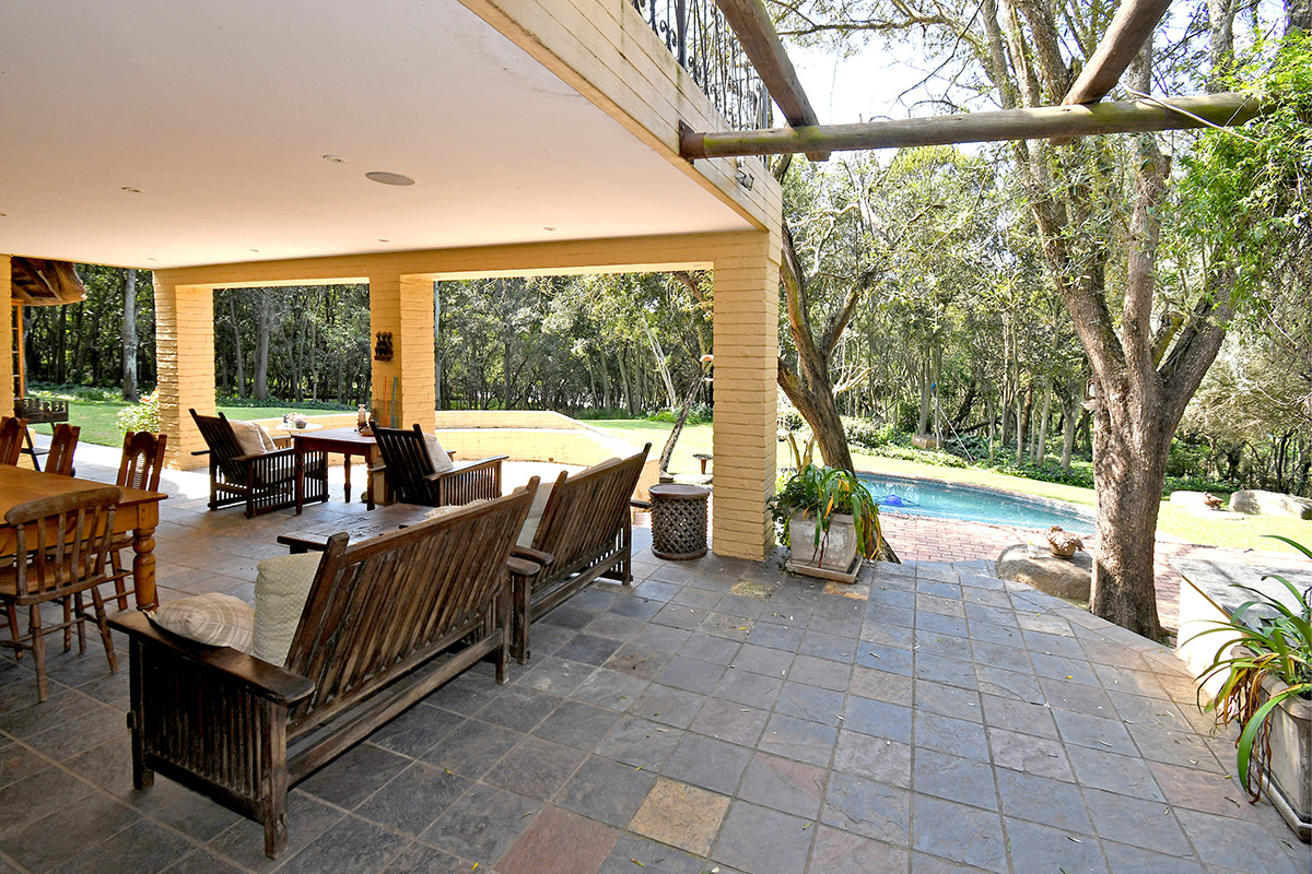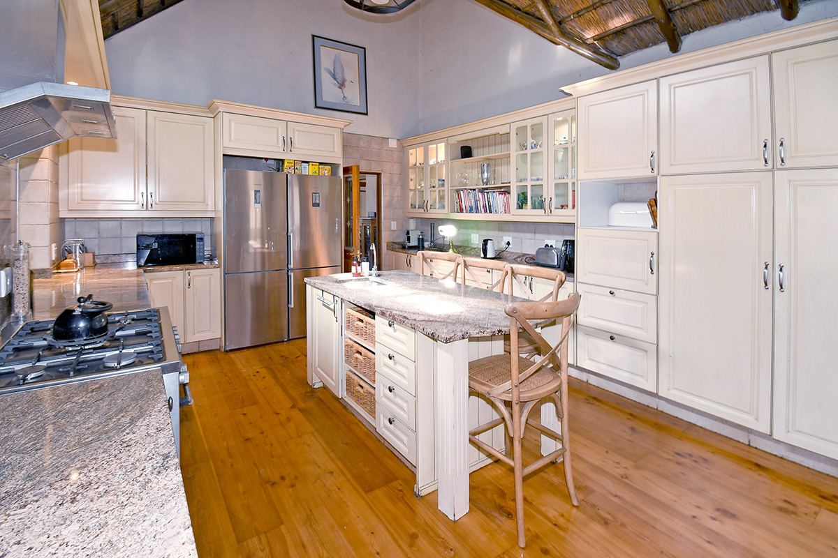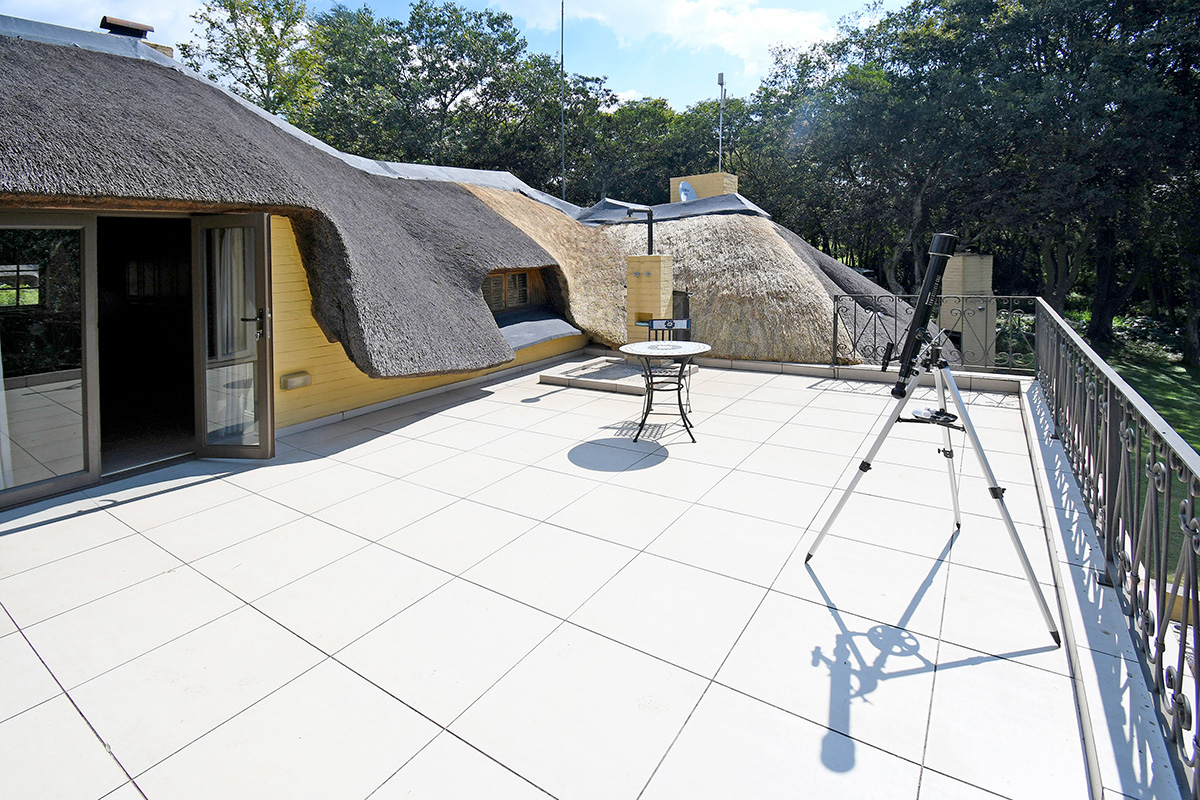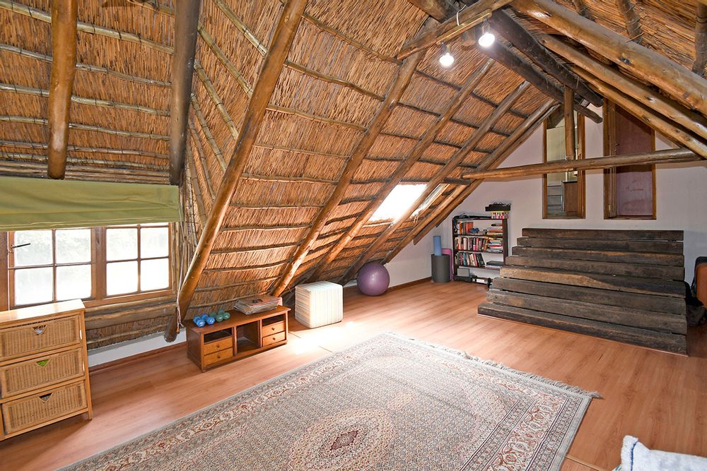 This elegant double-storey thatch home is nestled along the serene banks of the Klein Jukskei River, offering a rare blend of rural charm and tranquil living. Set on 3.7 hectares of lush, tree-filled gardens, the property features rolling lawns, established trees, and visits from resident wildlife, creating a peaceful countryside atmosphere just minutes from the city.