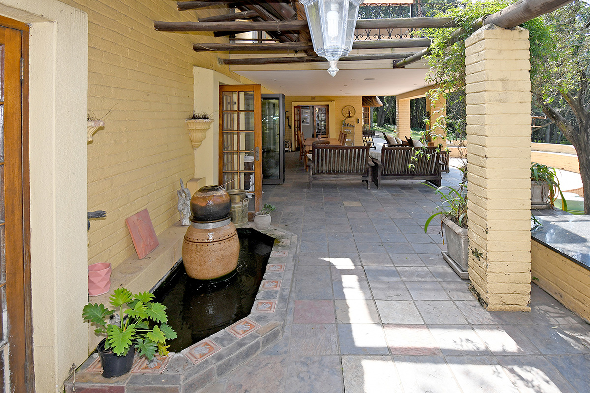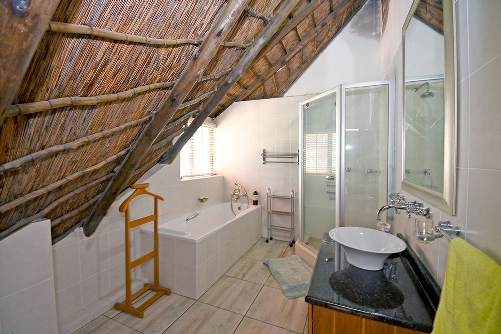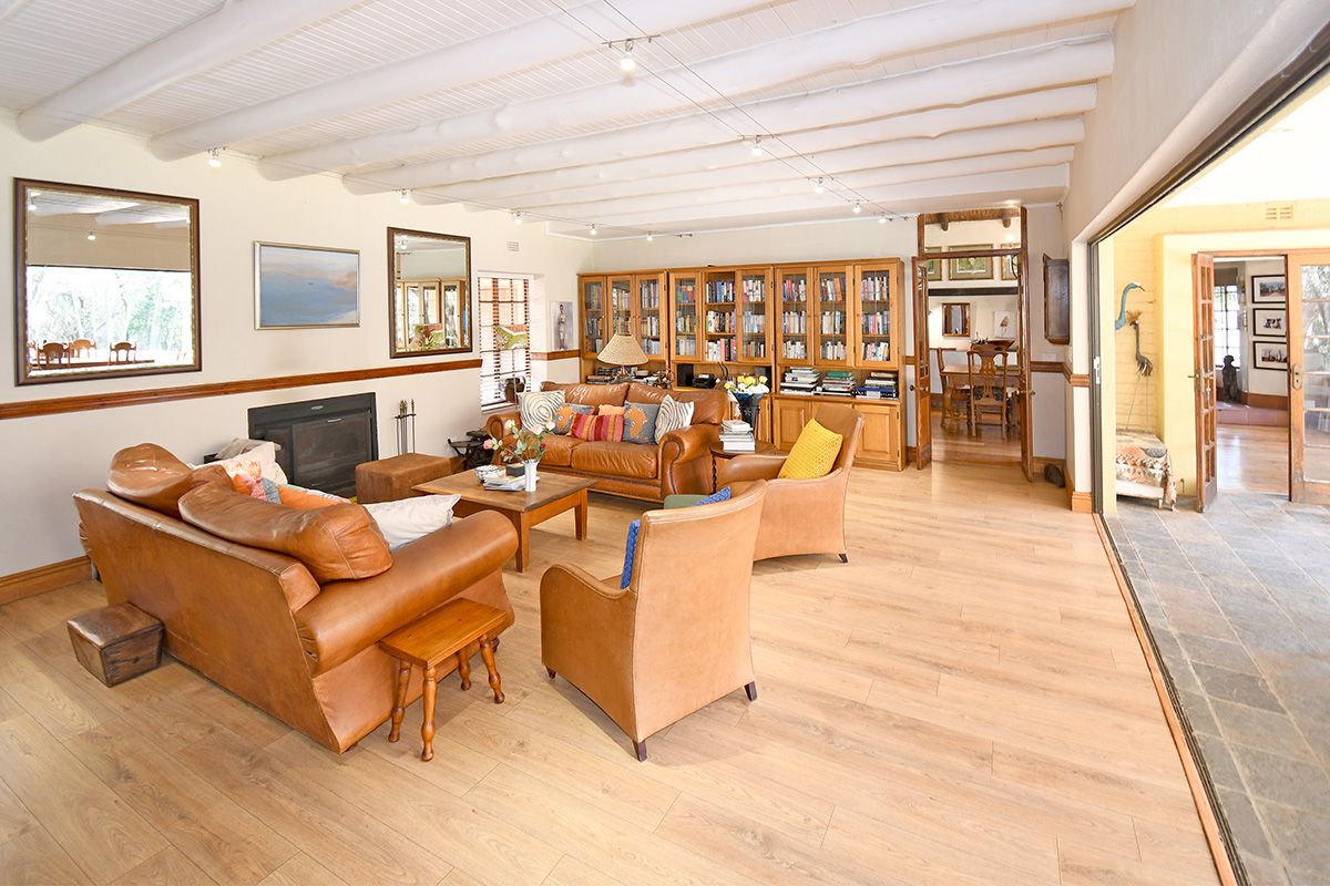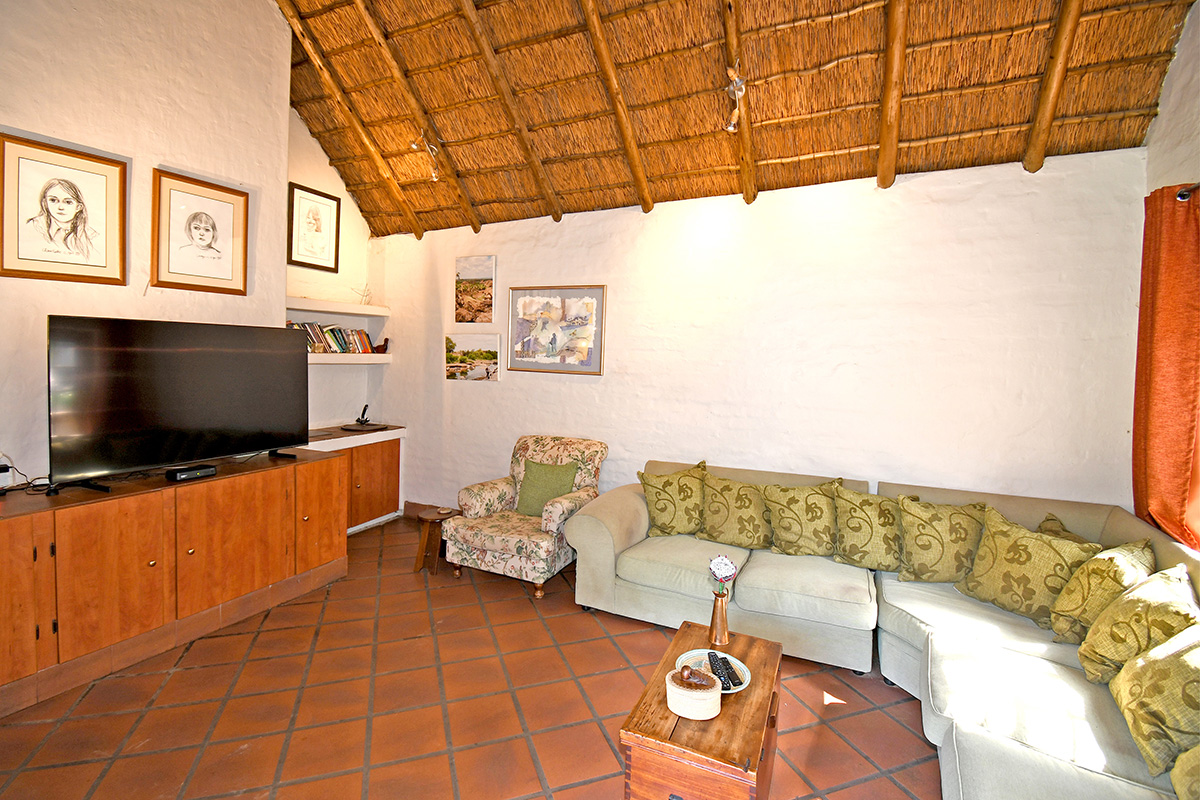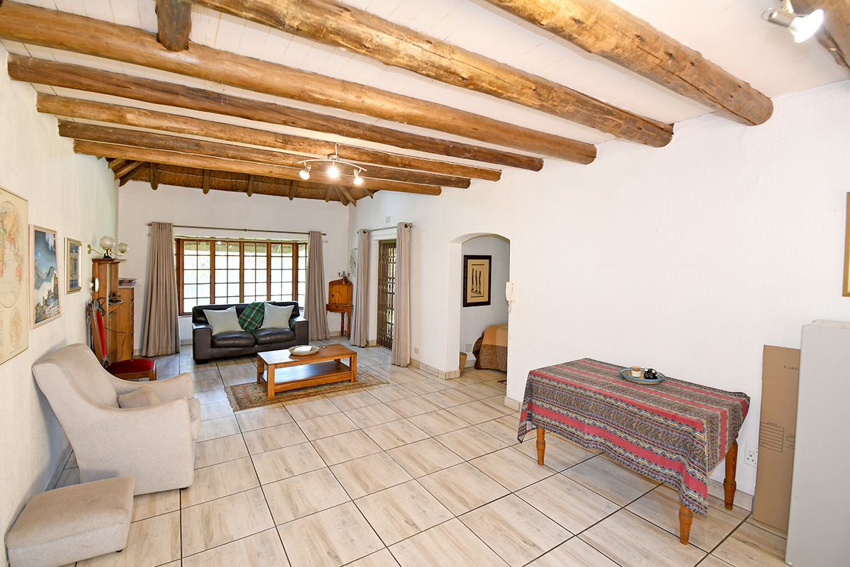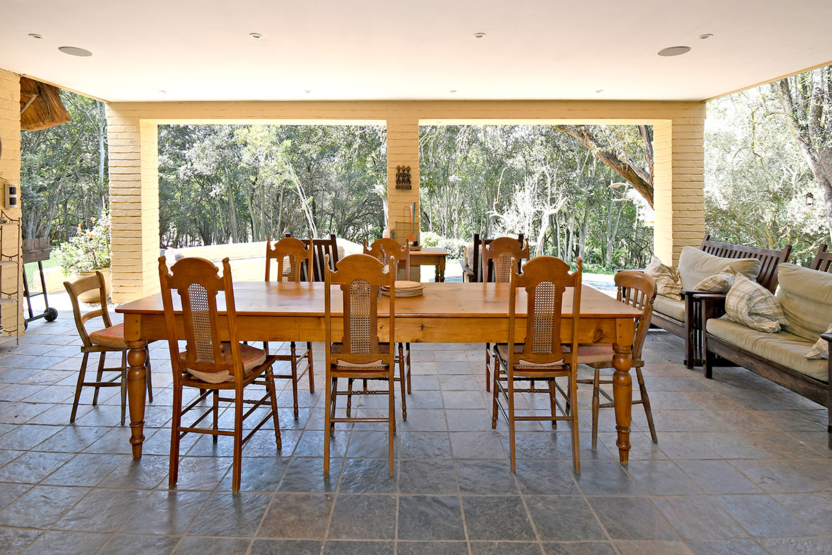 This elegant double-storey thatch home is nestled along the serene banks of the Klein Jukskei River, offering a rare blend of rural charm and tranquil living. Set on 3.7 hectares of lush, tree-filled gardens, the property features rolling lawns, established trees, and visits from resident wildlife, creating a peaceful countryside atmosphere just minutes from the city.