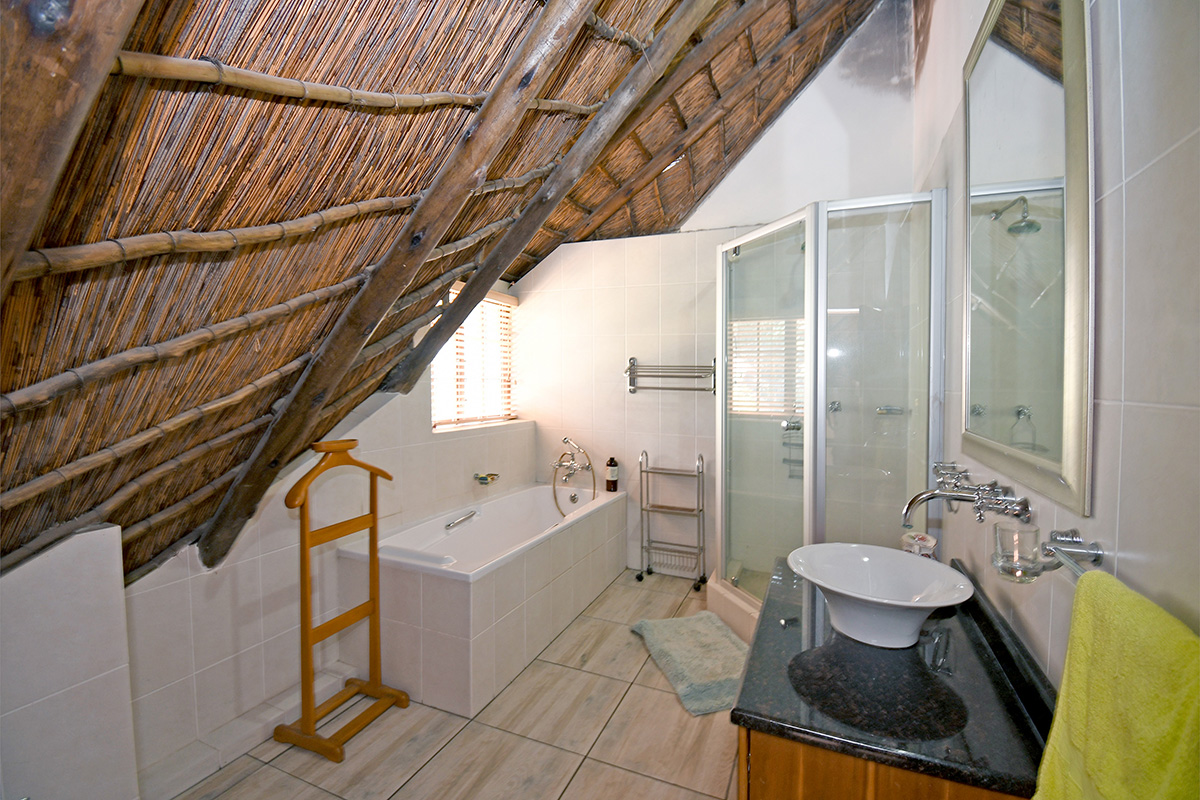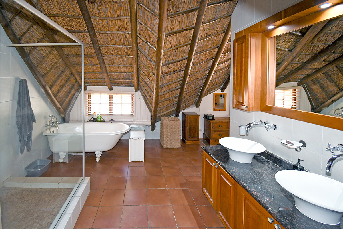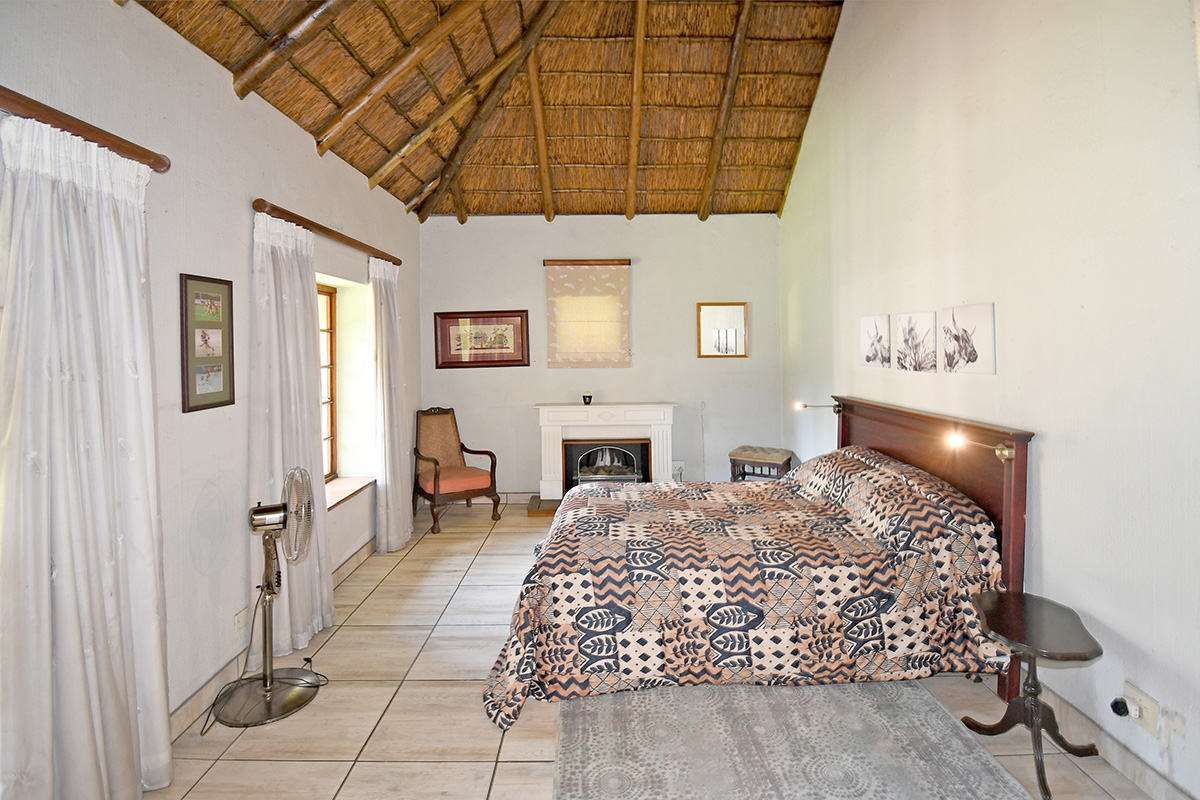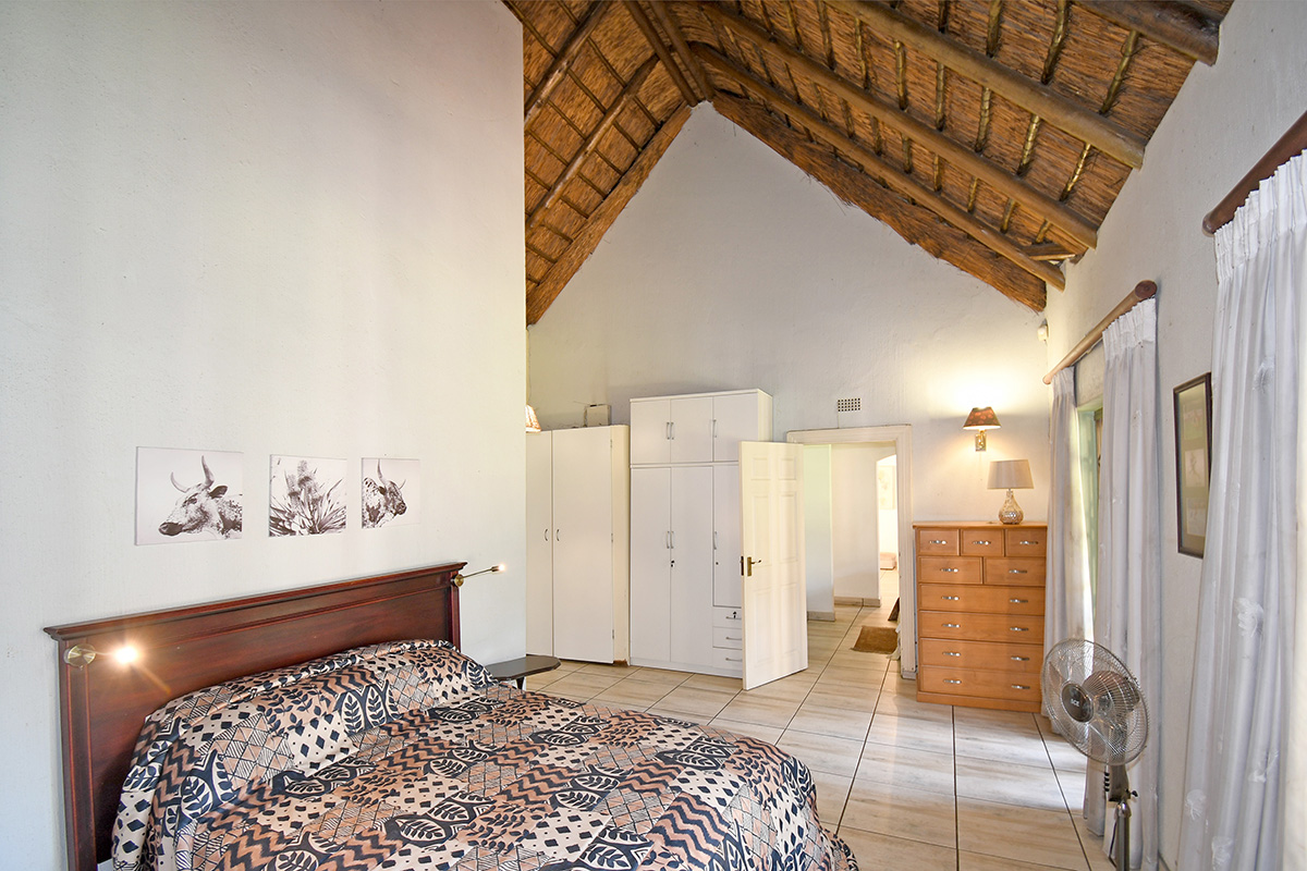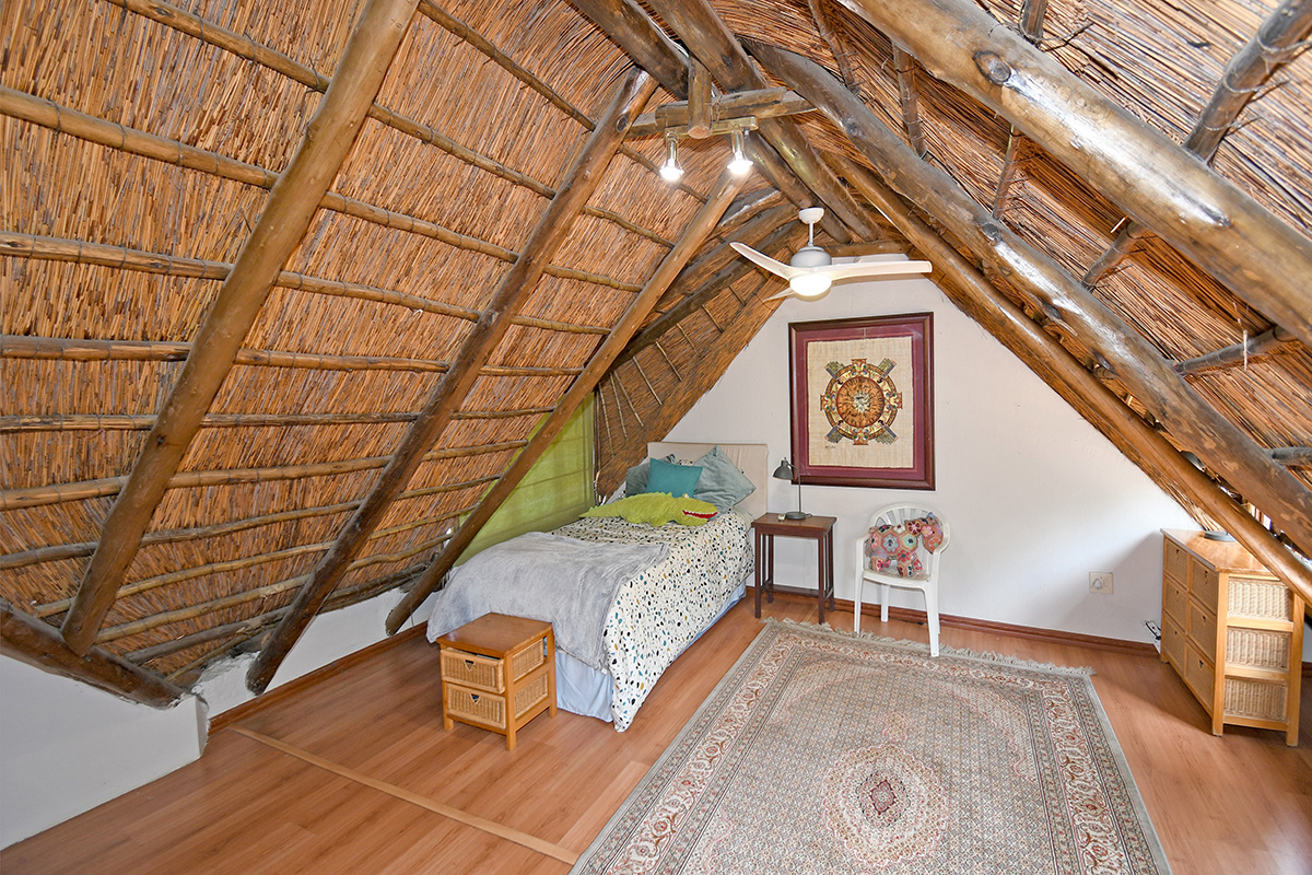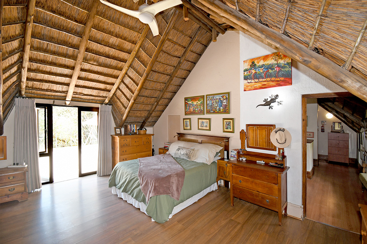 Tucked under the charming thatched roof, this room is bright and airy, with windows on both sides offering peaceful views of the surrounding greenery. It features a full en-suite bathroom.