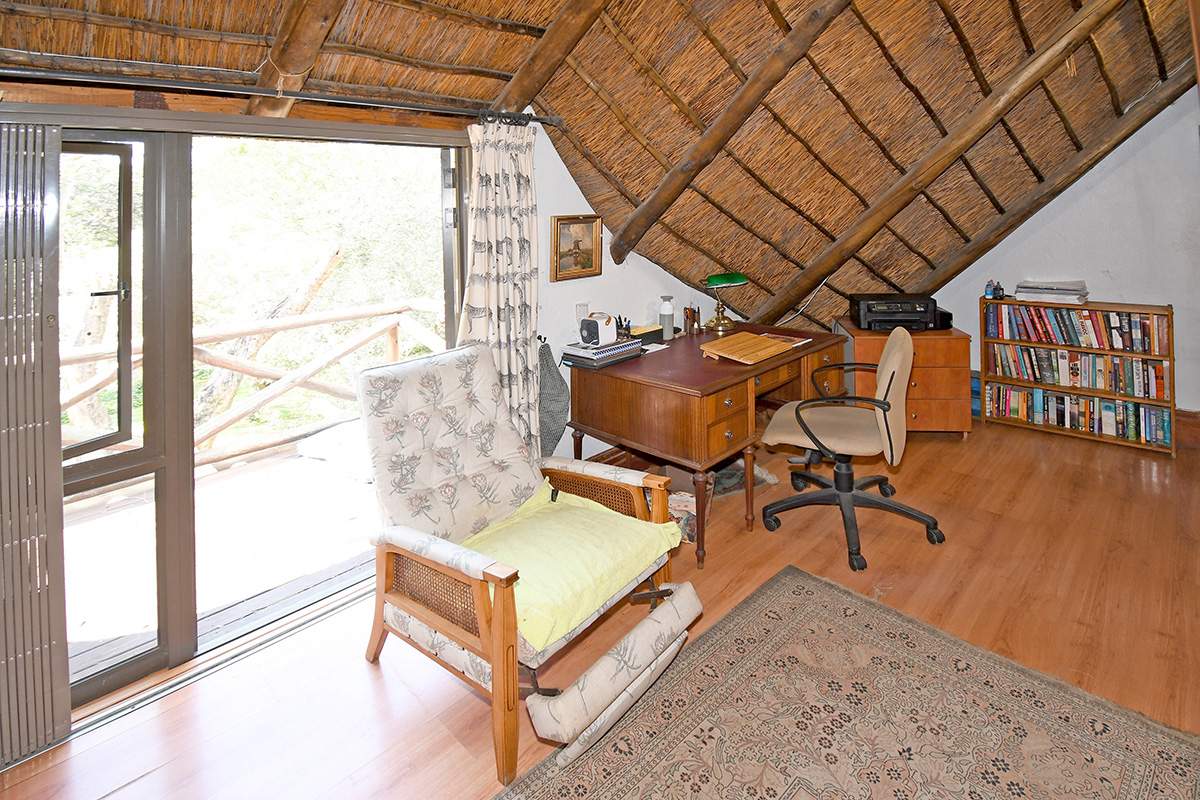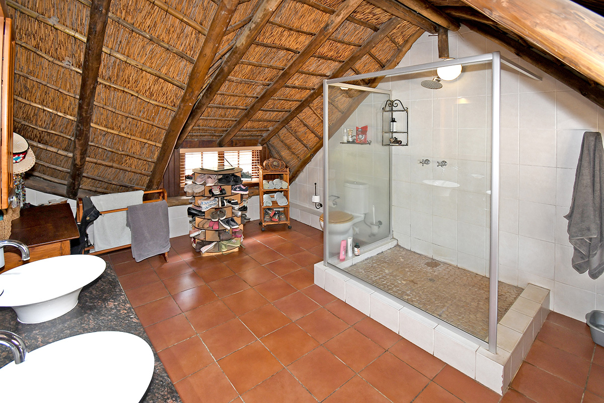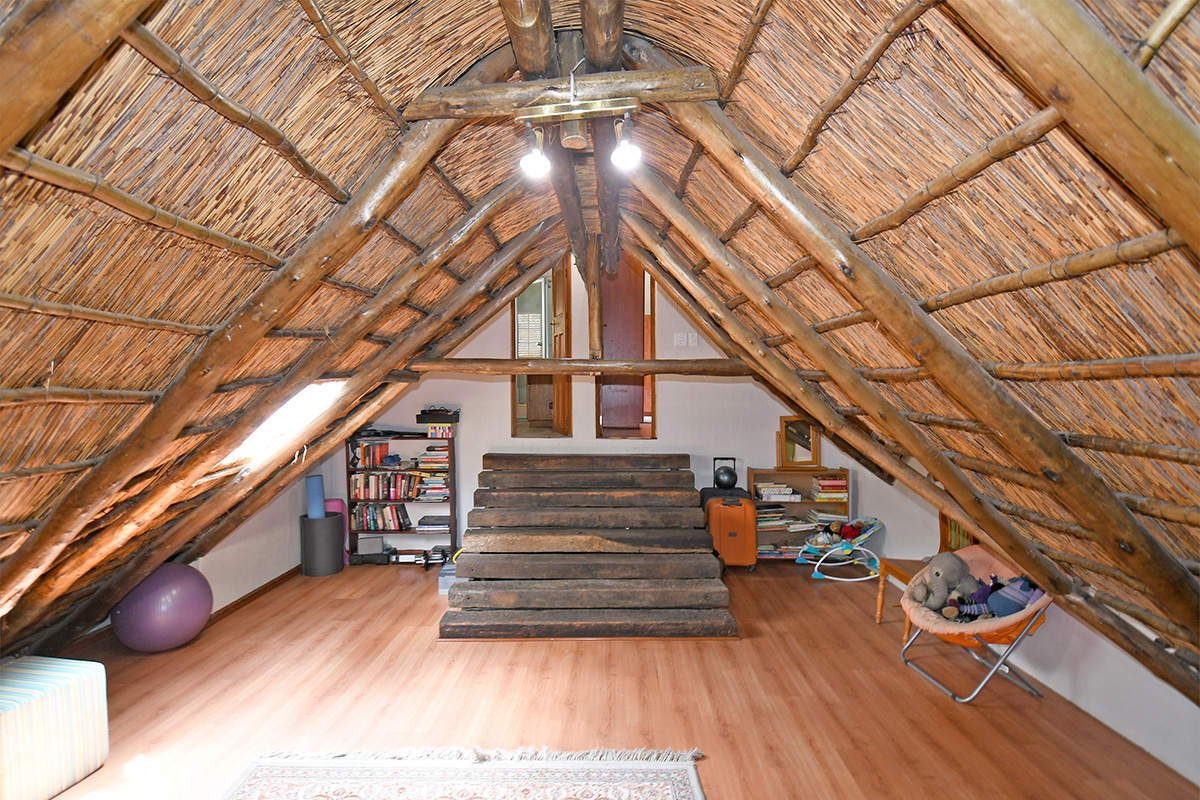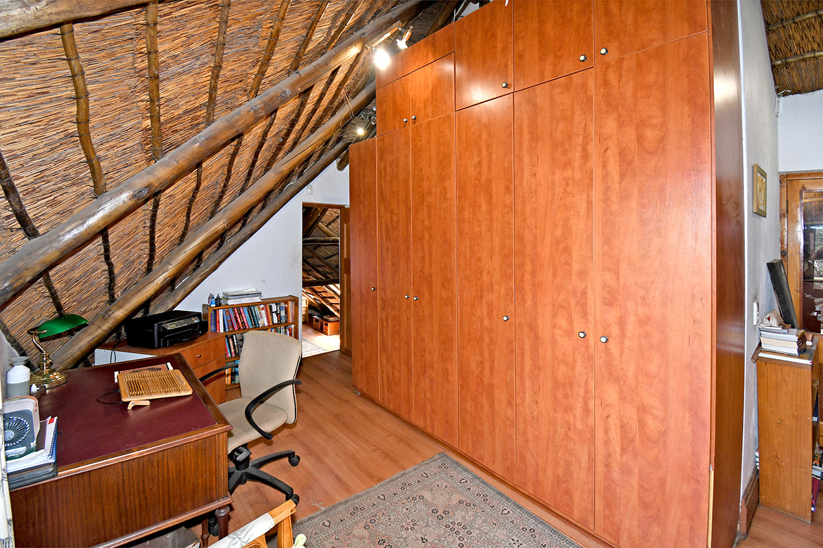 Ascend the staircase to a generous landing that leads to two en-suite bedrooms and a functional study area, all set beneath the warm character of the thatch roof.