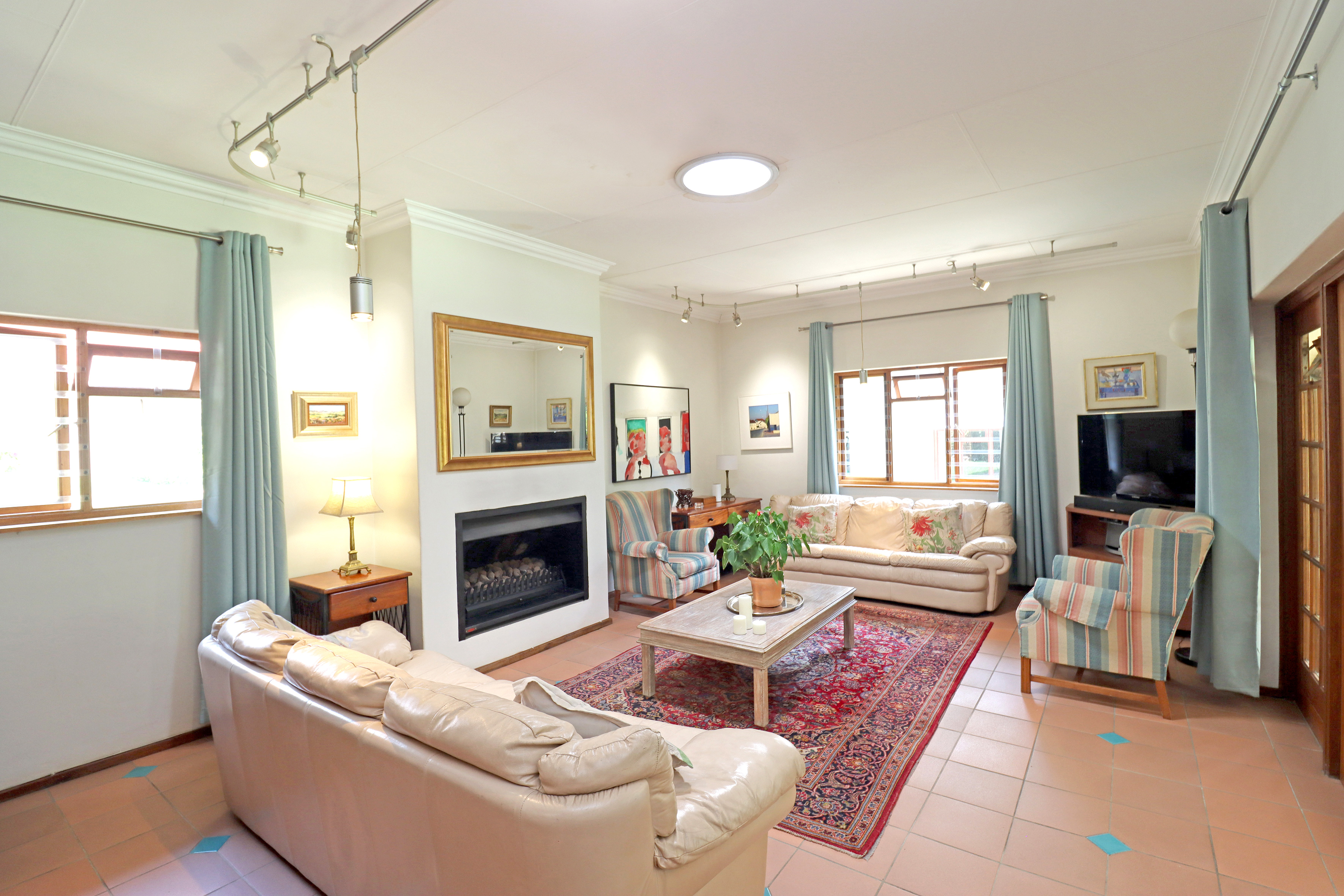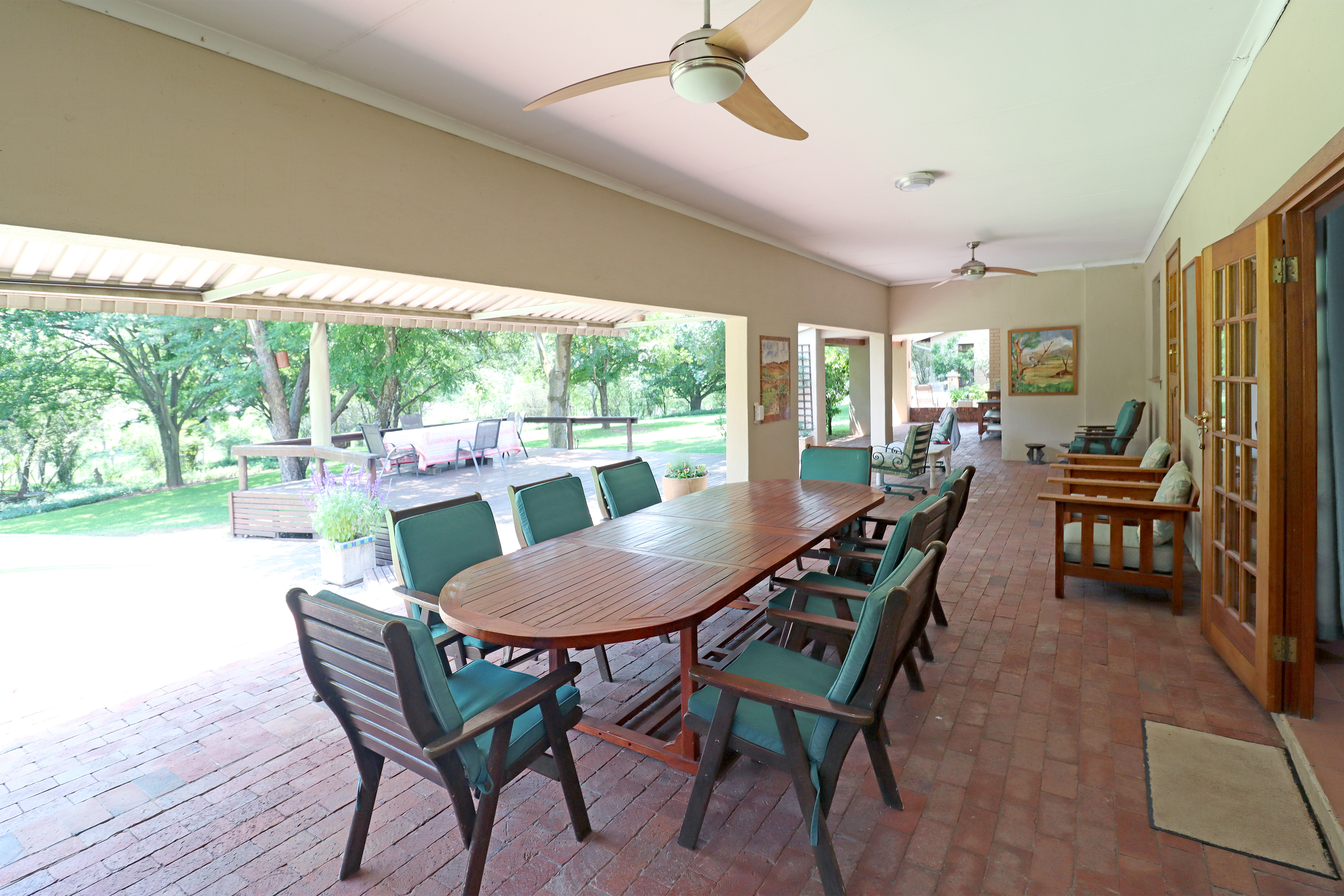 To the left, you’ll find a bright, tiled lounge with a fireplace, flowing seamlessly out to a large covered veranda fitted with ceiling fans — the perfect spot to relax while overlooking the sparkling pool and beautiful, tree-filled garden with lush green lawns. A true family haven designed for comfort and outdoor living.