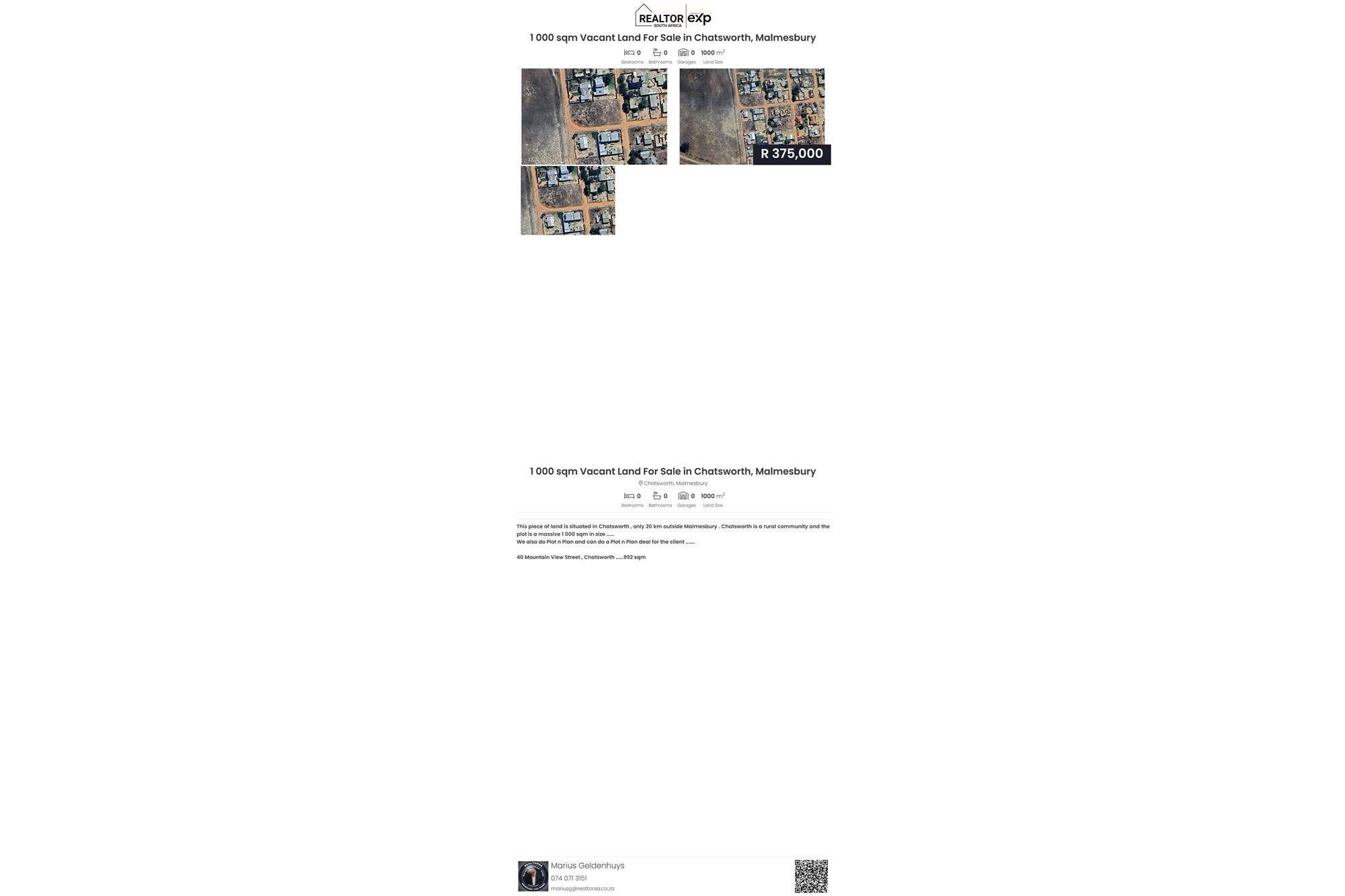 This piece of land is situated in Chatsworth , only 20 km outside Malmesbury . Chatsworth is a rural community and the plot is a massive 1 000 sqm in size ......