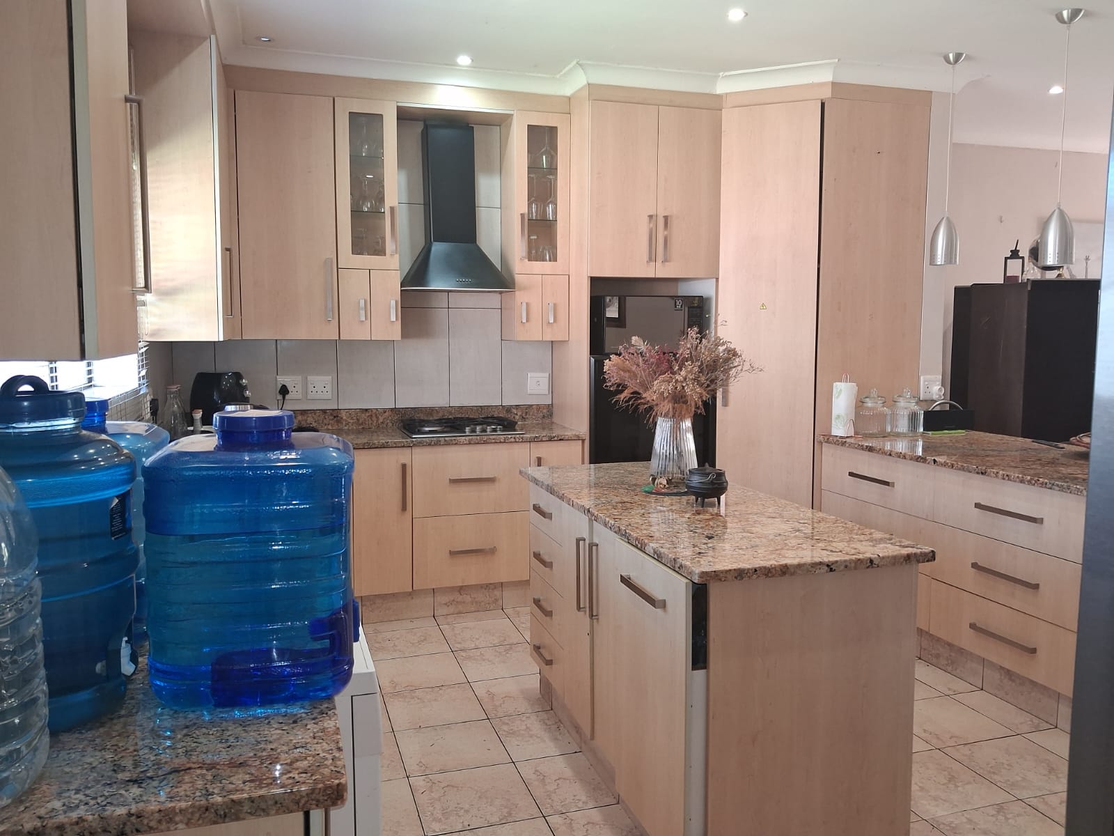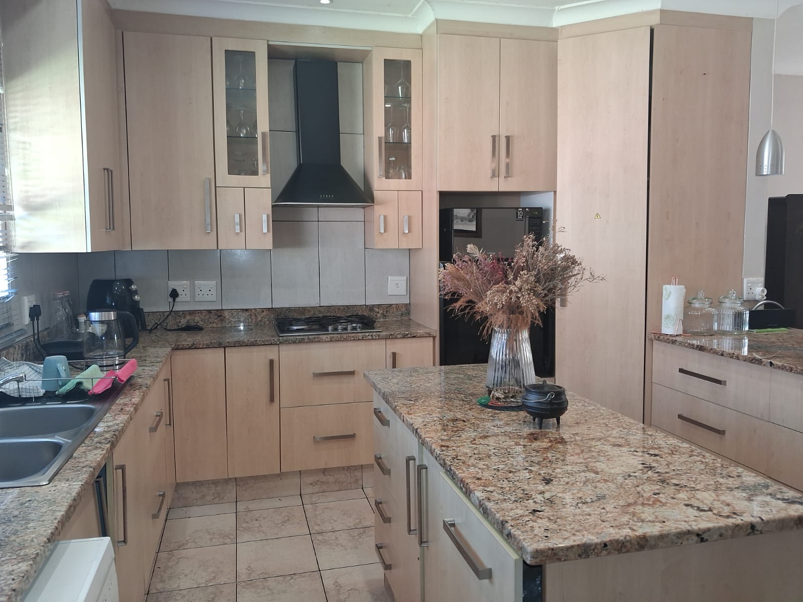 At the heart of the home is a stylish, modern kitchen featuring granite countertops, a central island with breakfast nook, eye-level oven, 900mm hob with display extractor, built-in microwave, double-bowl sink, and a separate scullery/laundry area — perfectly designed for both functionality and entertaining.