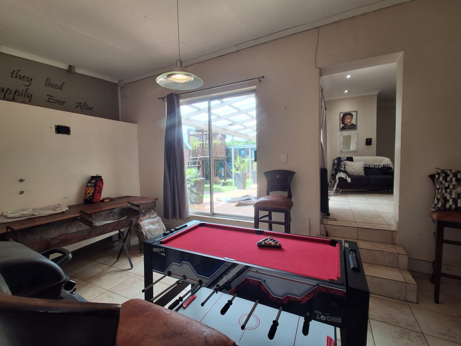 The open-plan kitchen, dining, and lounge flow effortlessly into a versatile recreation area, complete with built-in bar seating and space for leisure or entertainment. This space extends into a dedicated home office fitted with a desk and wall units — ideal for remote work or study.