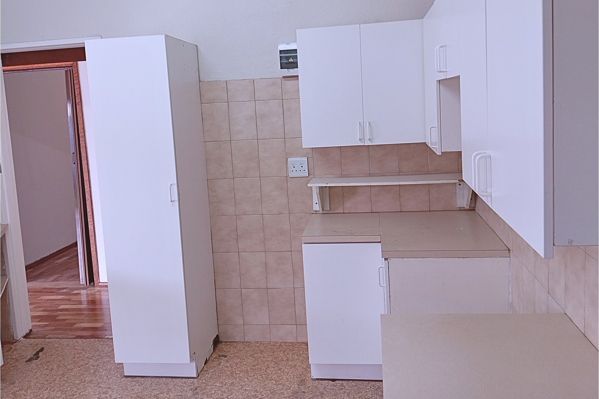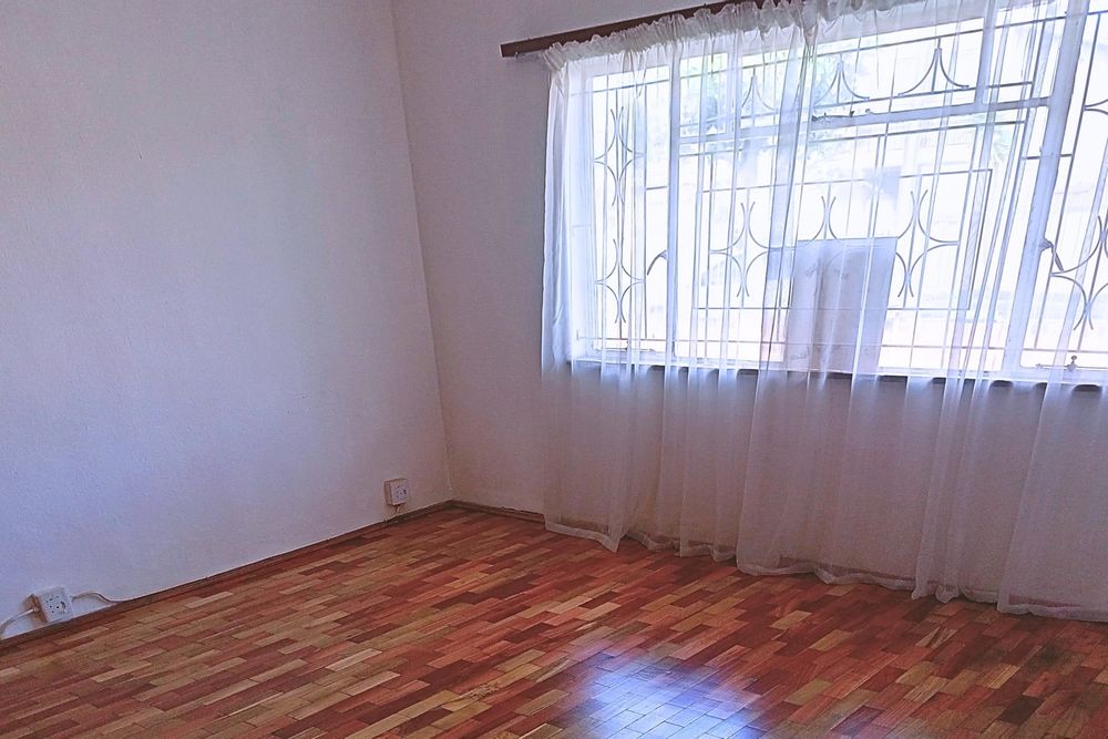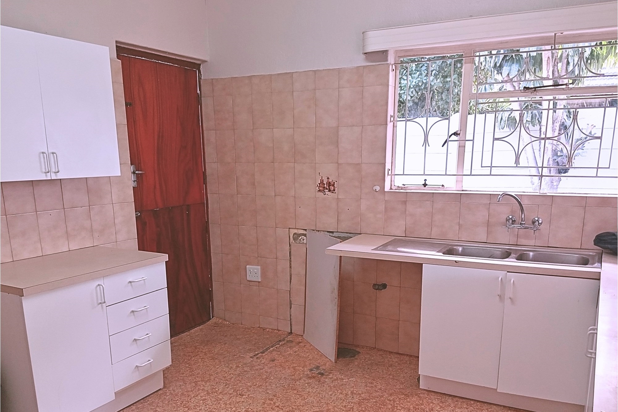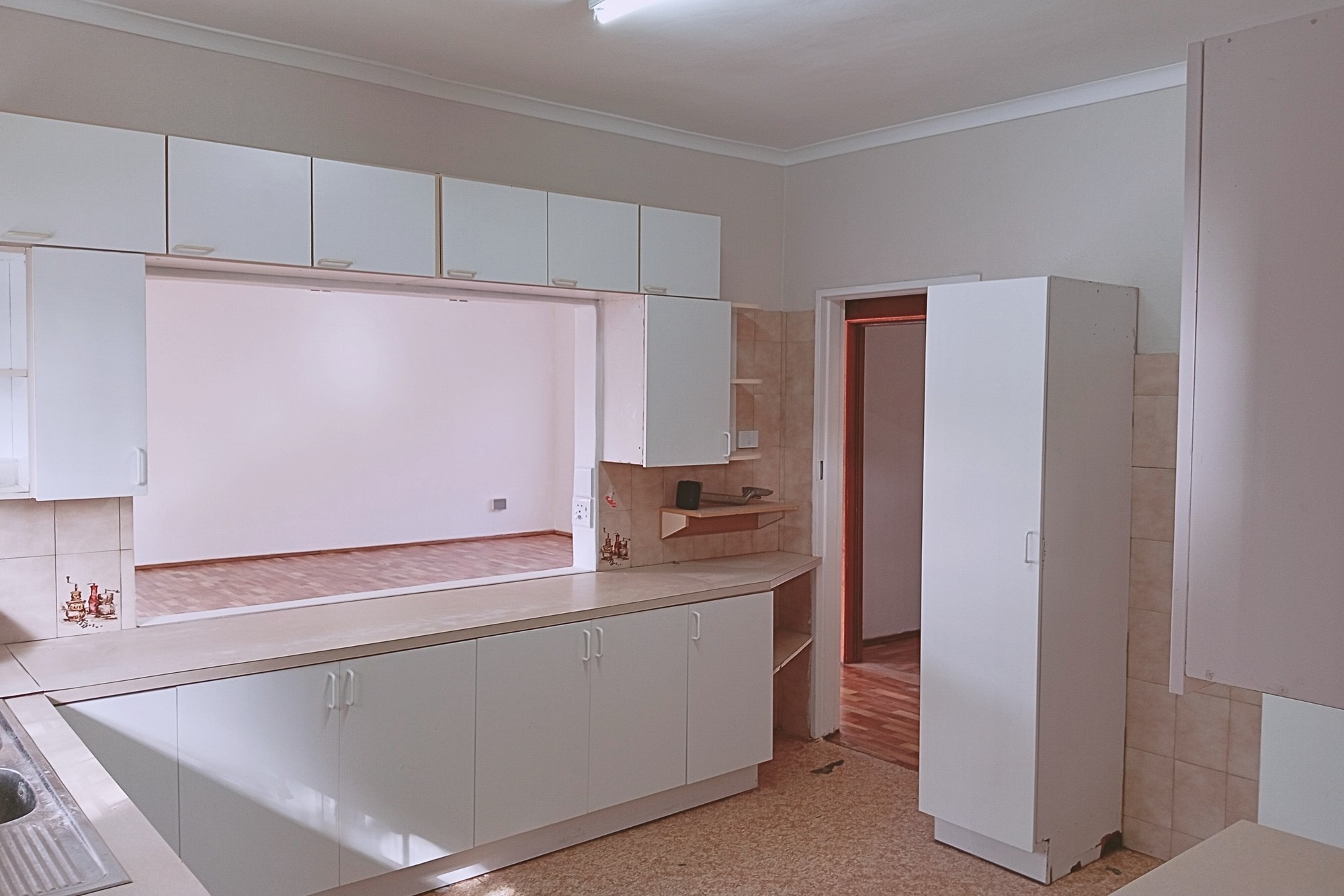 The main living room has a large pass-through to the kitchen. The kitchen offers multiple cupboards and a connection for a washing machine and dishwasher. A single fridge spacing and pre-paid electricity device is installed. A kitchen door leads to the 5th outside room with separate toilet. A security gate leads from the 5th bedroom and kitchen to the back garden.