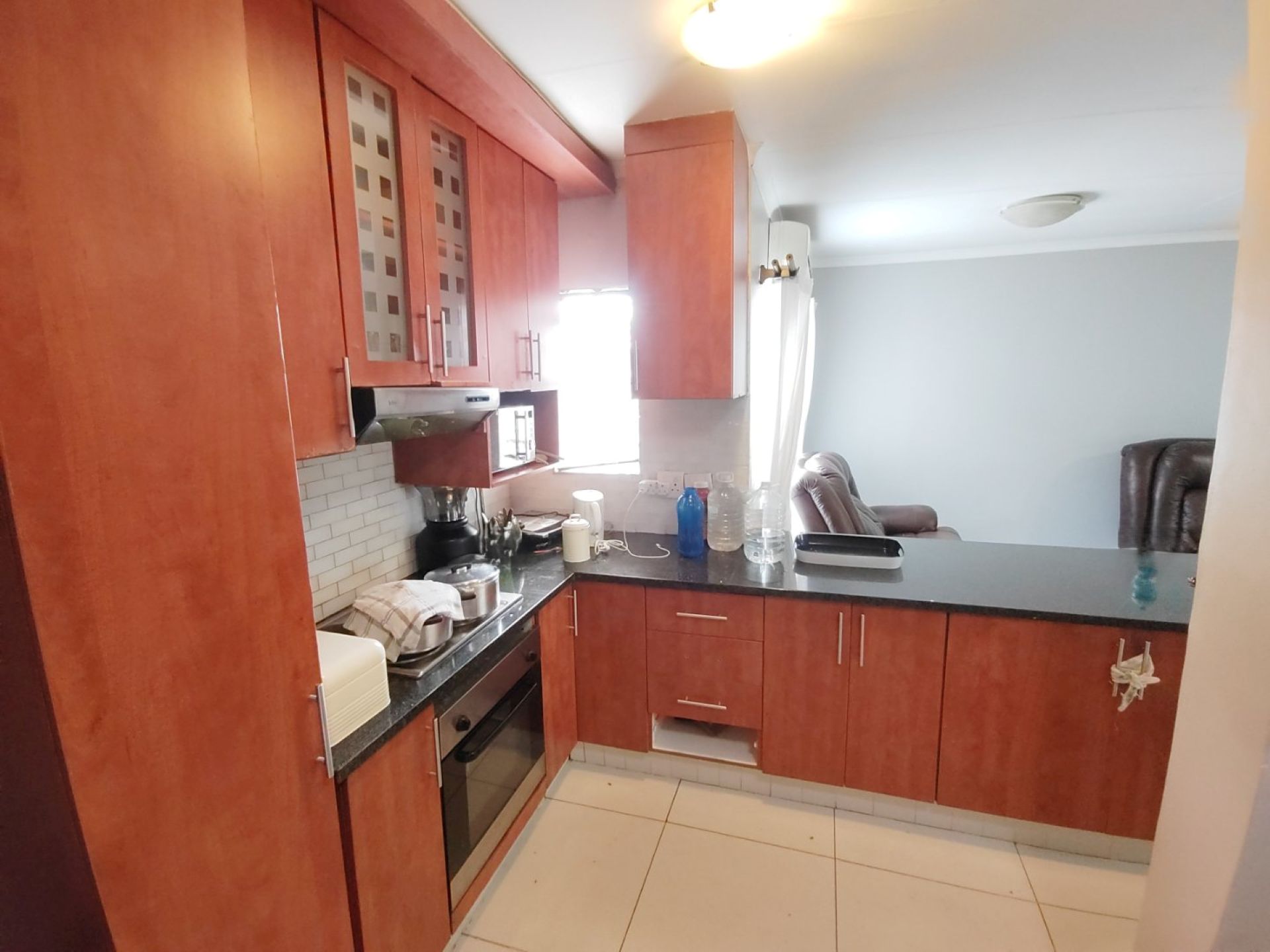 At the centre of the home lies a spacious open-plan kitchen, elegantly finished with granite countertops and complemented by a practical breakfast counter for relaxed meals. A separate scullery keeps the main kitchen area neat and organised while providing additional space for appliances and storage.